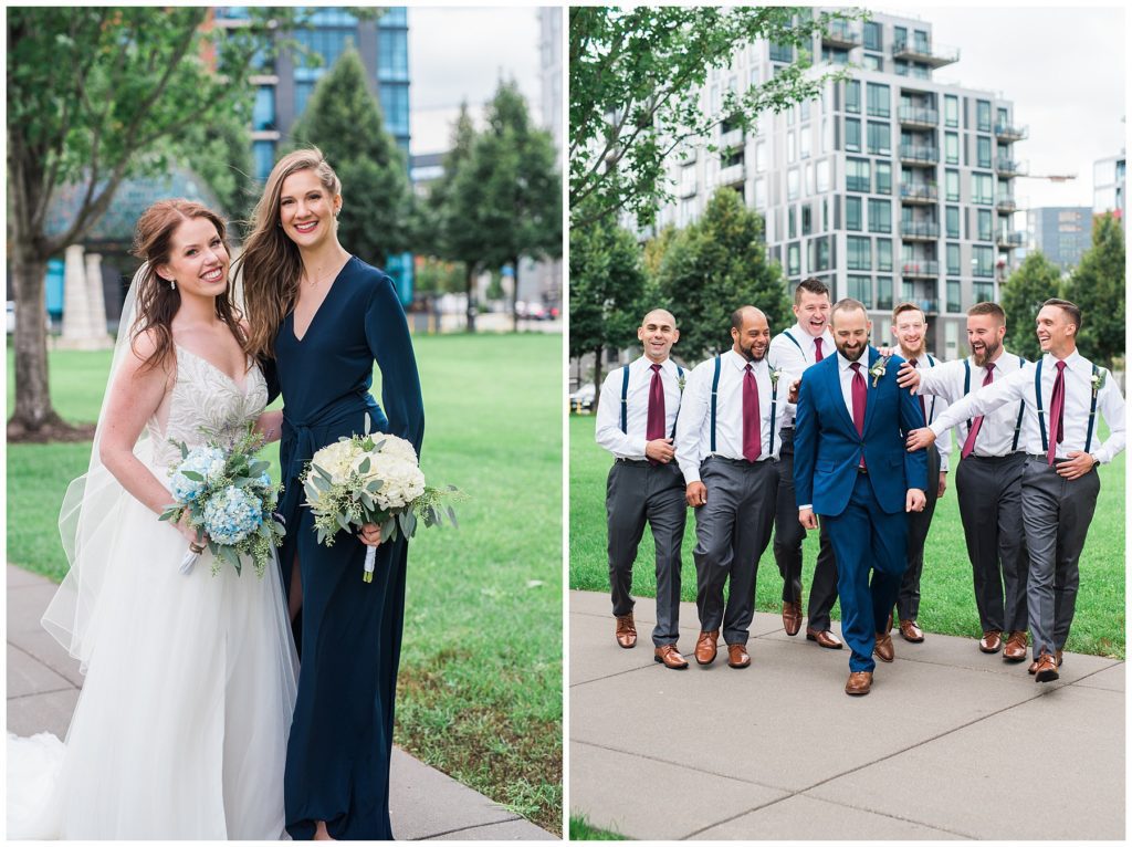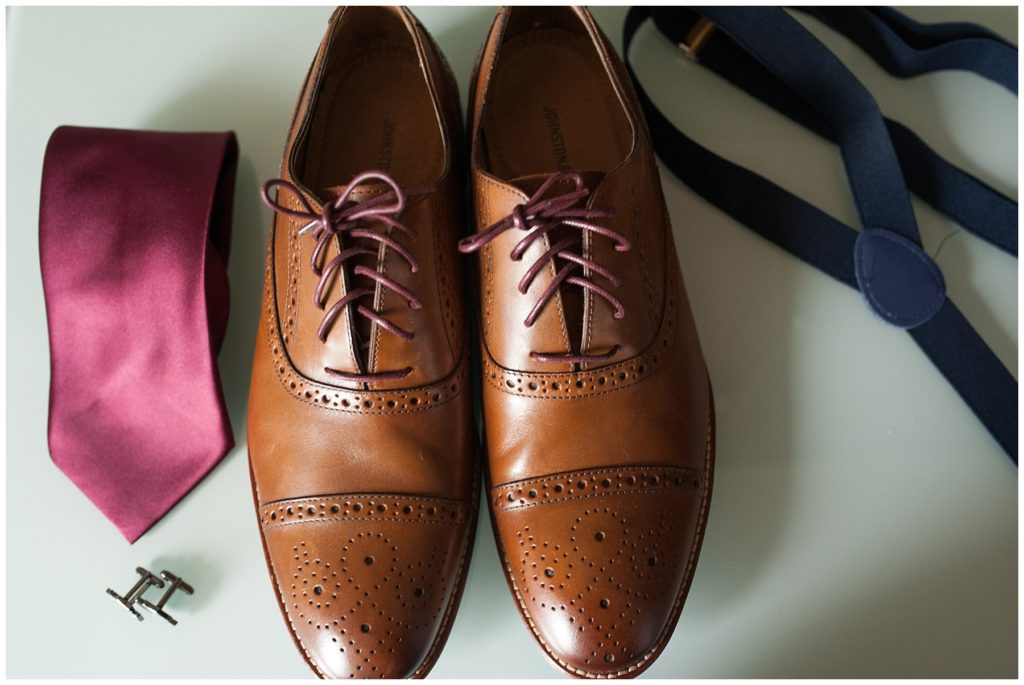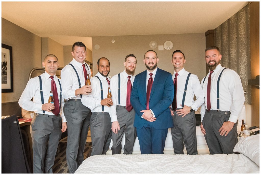 James looked dapper in his maroon tie and navy Ryan Secrest Suit from Macy’s and all the groomsmen complimented him in their BLANK suits rented from Men’s Warehouse.