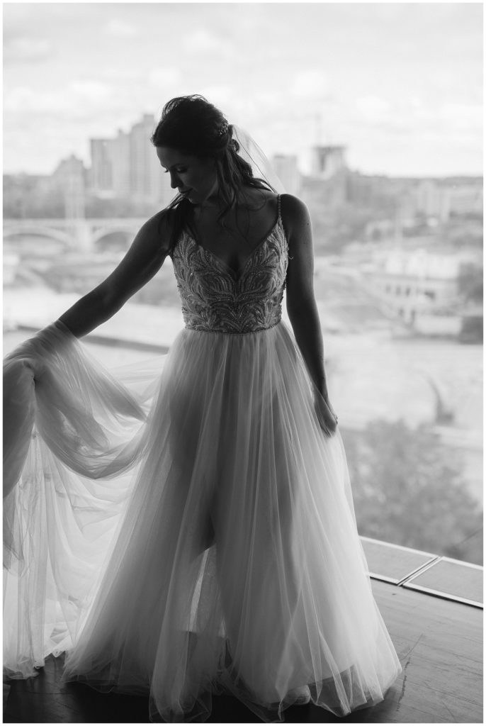 Three years from their first date Megan was bugging James to take her out to celebrate. He begrudgingly agreed, but Megan wasn’t aware that James had been planning the evening all night. He played into it will and suggested that before dinner they take a walk on the Stone Arch Bridge for an anniversary picture. After taking the photo, James said “that is the before photo” and then he got down on one knee and asked Megan to marry him. Then we took our ‘after’ photo. They then went and celebrated at Murry’s (which James had been planning on) after the proposal.