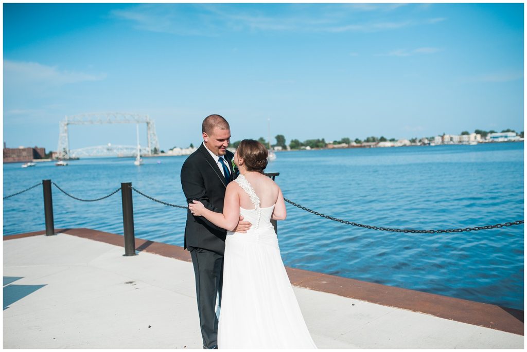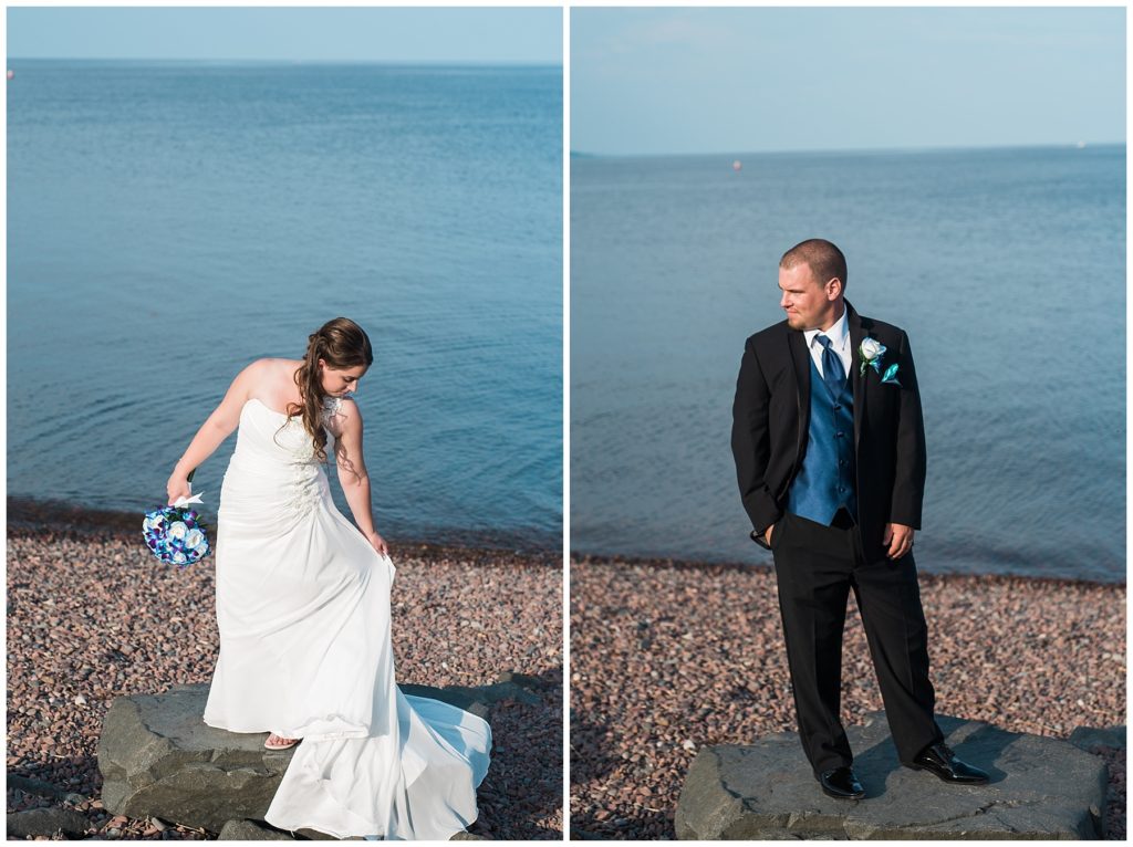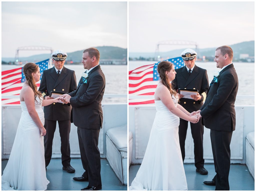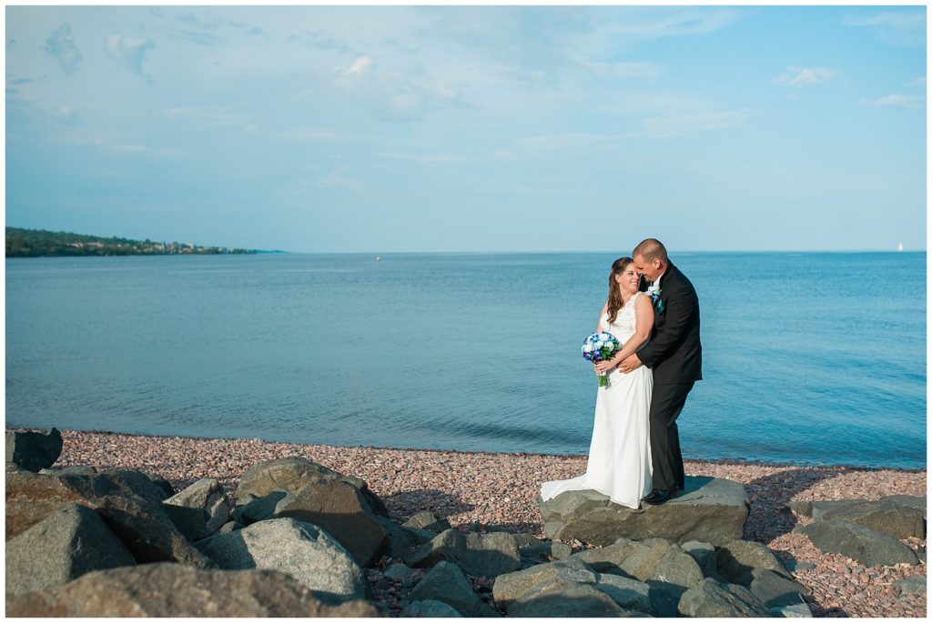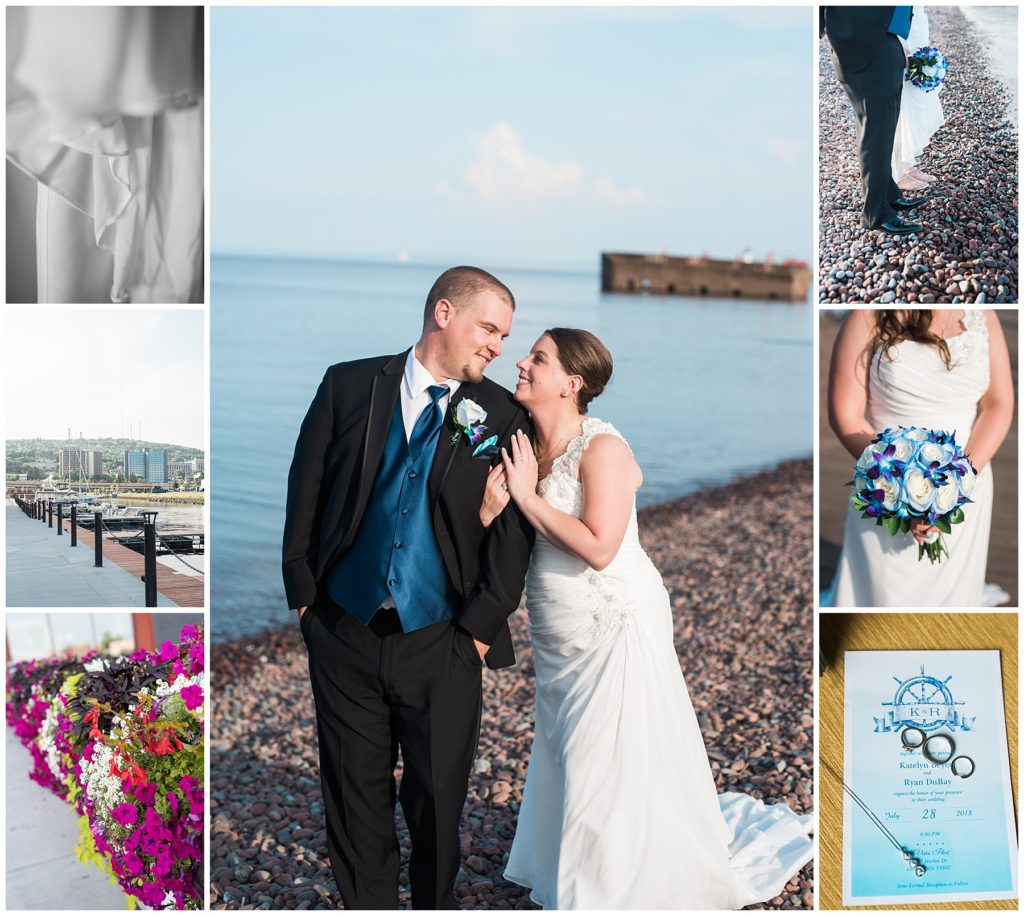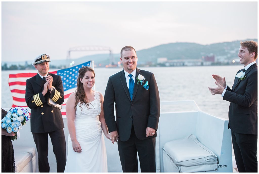 Katelyn’s elegant ivory David’s Bridal gown was paired perfectly with Ryan’s black suit and navy tie. Their white and blue florals from Main Floral were a perfect pop of color against her dress and fit the nautical theme she was going for. Katelyn’s unique diamond ring that Ryan had custom made and her sandals were perfect for walking along Duluth’s rocky shore. Fitgers Salon and Spa created a beautiful up-do for Katelyn and her make up was stunning. Guests relaxed and enjoyed the beautiful scenery while crusing Lake Superior on the Vista Fleet Queen while Bellisio’s brought in incredible food and How Sweet it is Cakes provided cakes for dessert. Guests watched as Katelyn and Ryan had their first dance under an eclipse moon and then enjoyed time chatting with friends and family.