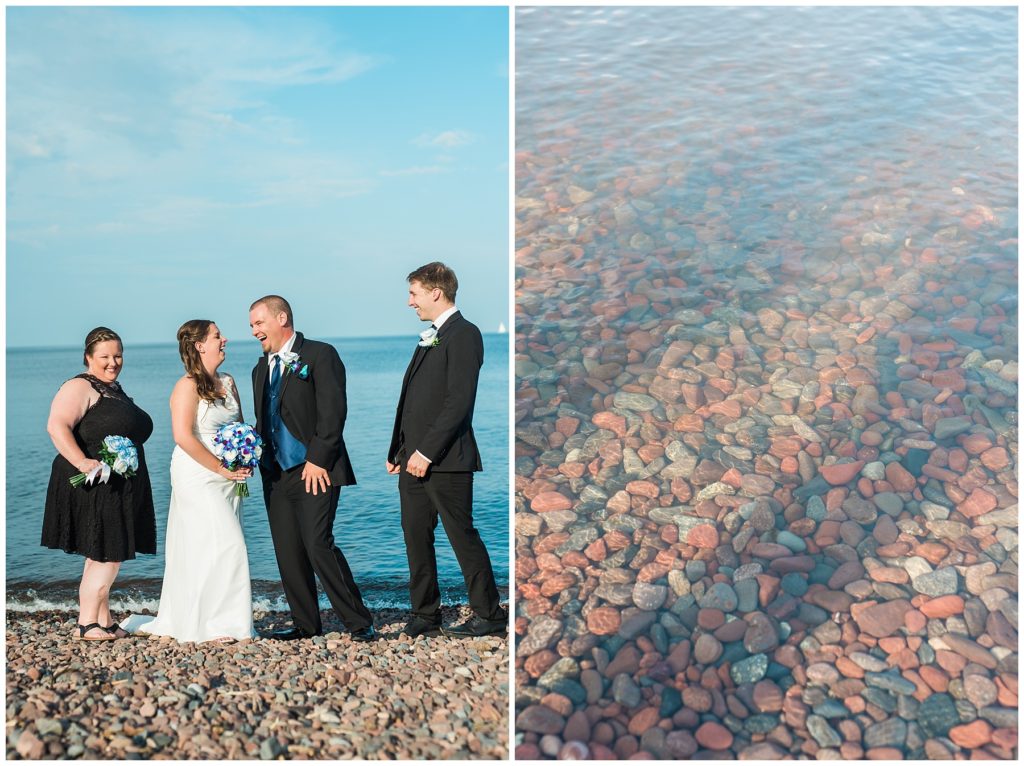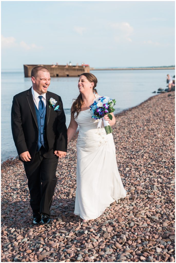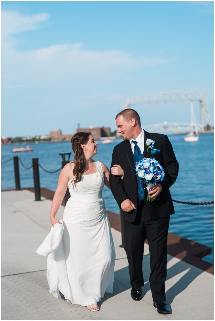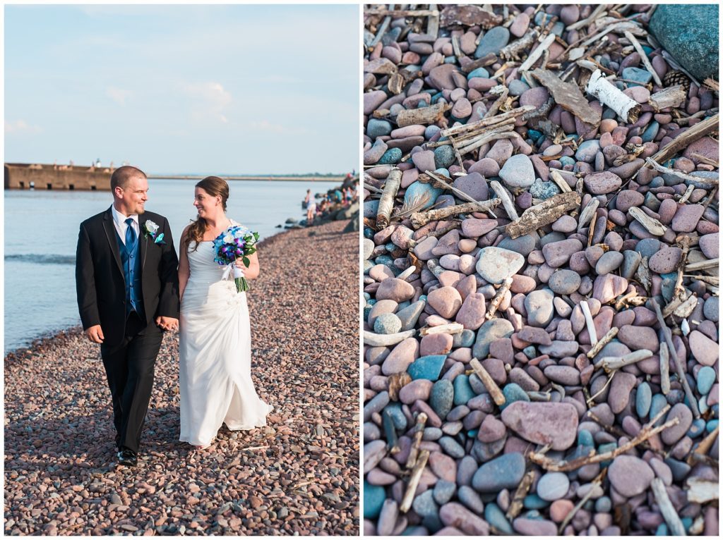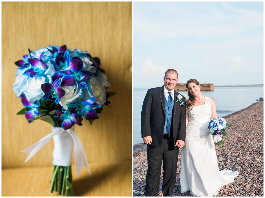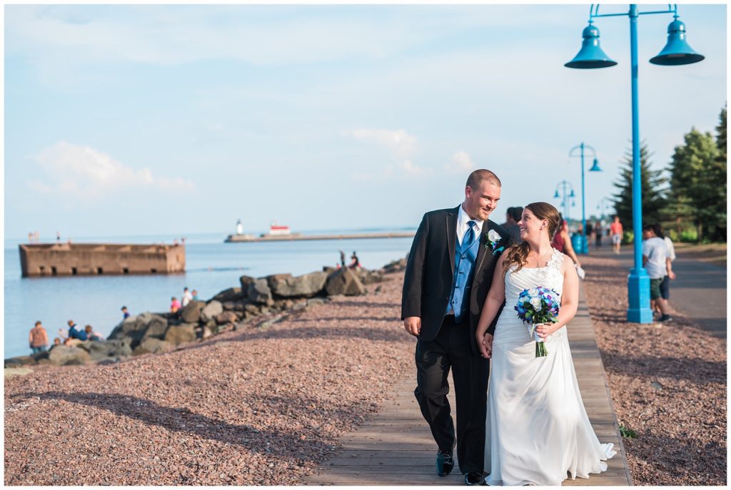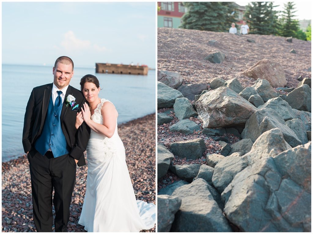 Katelyn’s elegant ivory David’s Bridal gown was paired perfectly with Ryan’s black suit and navy tie. Their white and blue florals from Main Floral were a perfect pop of color against her dress and fit the nautical theme she was going for. Katelyn’s unique diamond ring that Ryan had custom made and her sandals were perfect for walking along Duluth’s rocky shore. Fitgers Salon and Spa created a beautiful up-do for Katelyn and her make up was stunning. Guests relaxed and enjoyed the beautiful scenery while crusing Lake Superior on the Vista Fleet Queen while Bellisio’s brought in incredible food and How Sweet it is Cakes provided cakes for dessert. Guests watched as Katelyn and Ryan had their first dance under an eclipse moon and then enjoyed time chatting with friends and family.