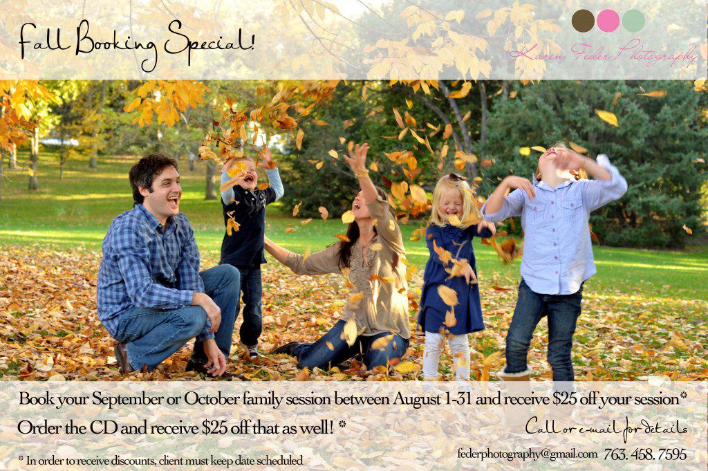 Being that fall is my busiest, craziest season, I am offering a special this year to get all you early bird’s in on the schedule. See details below and give me a call or e-mail to get your session on the calendar! I can’t wait to see you and how all your kids have grown! While you’re at it, take a look at some of last year’s sessions, and let me know what you think!