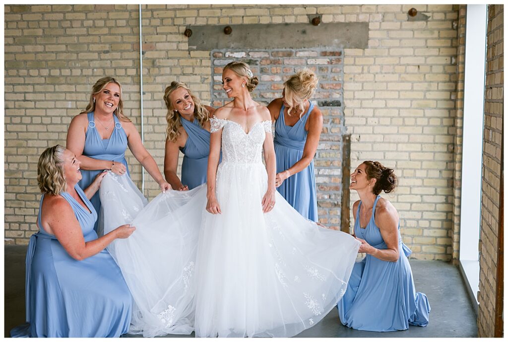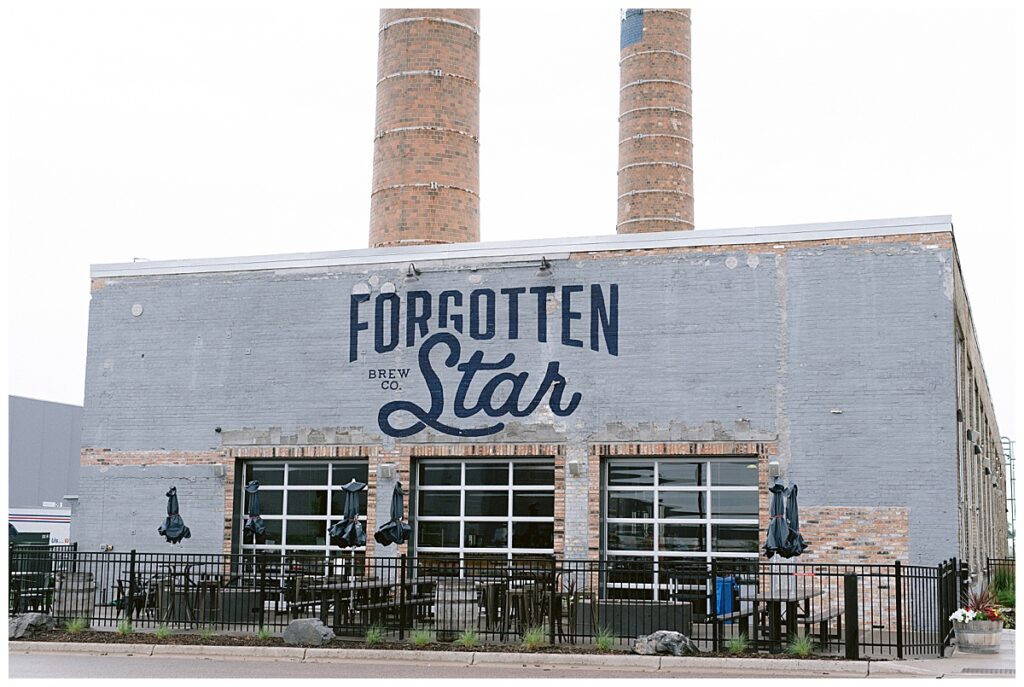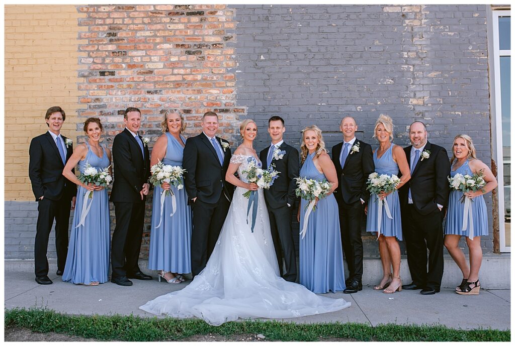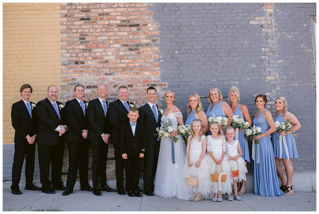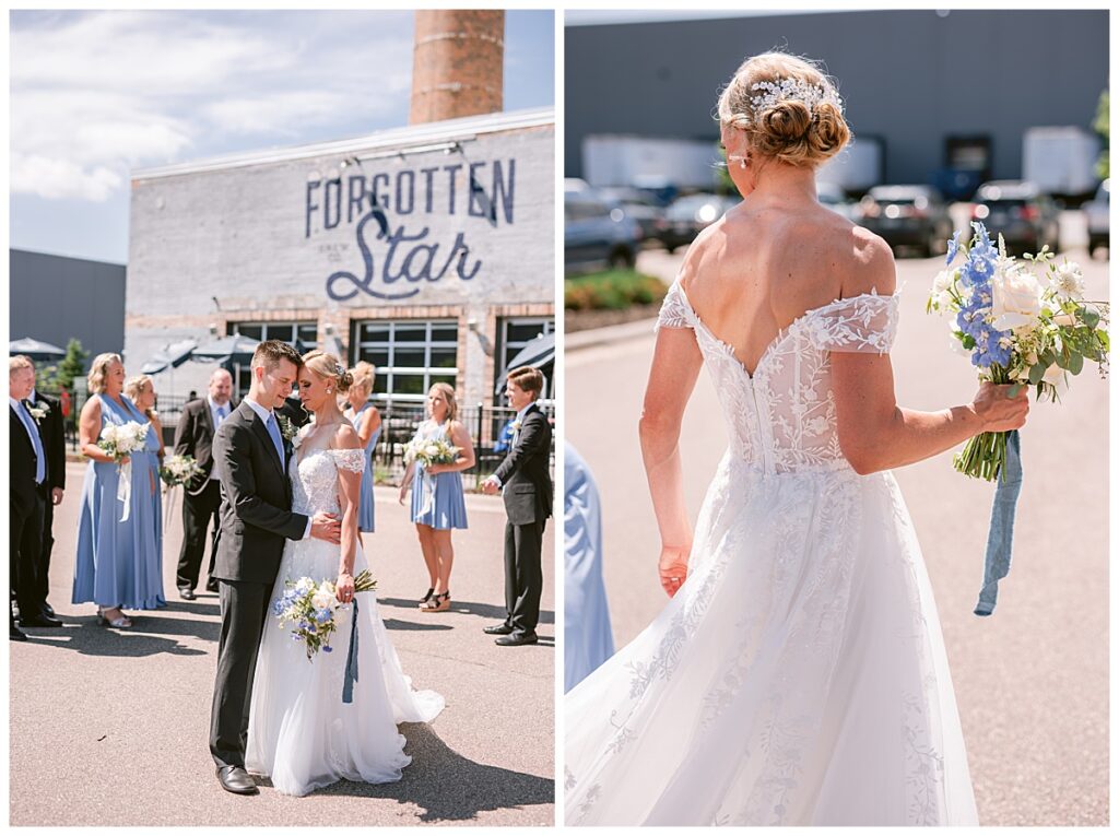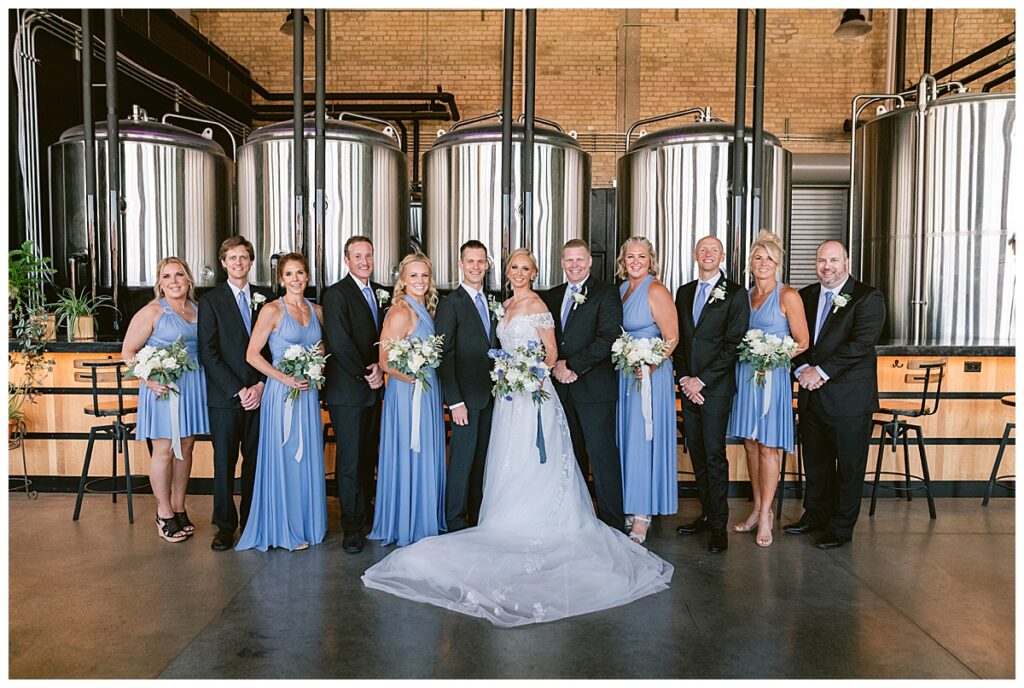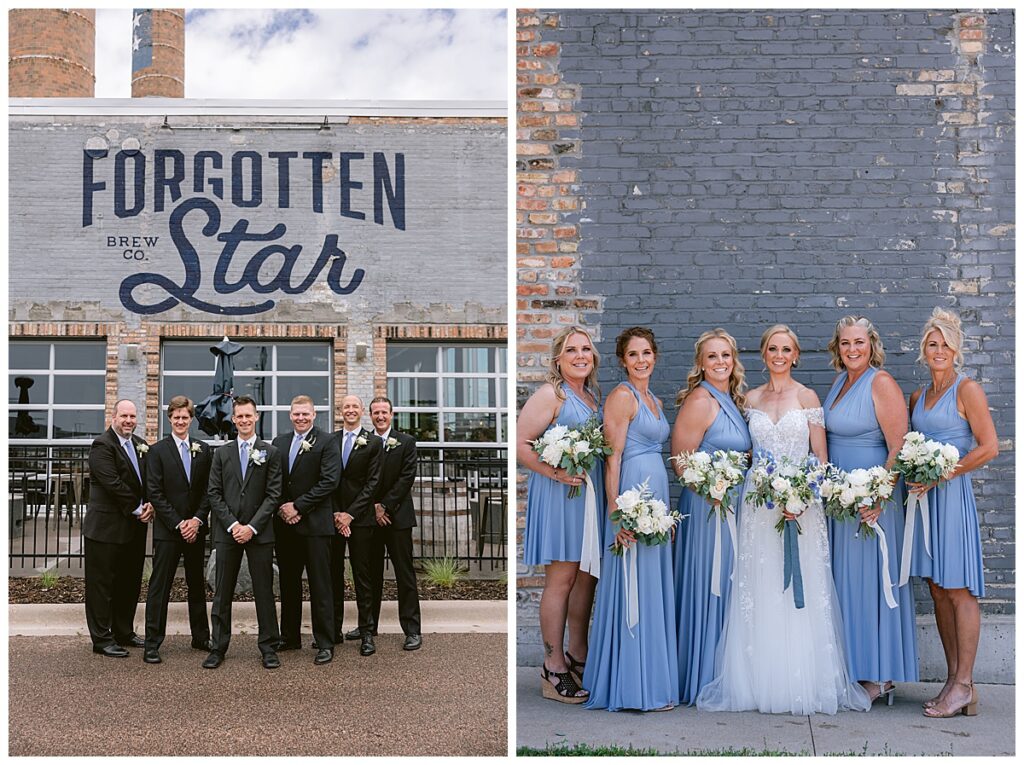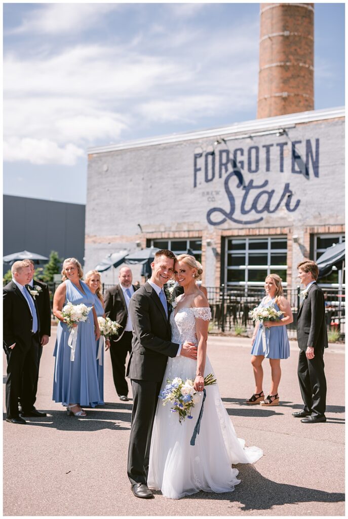 Suzie and Scott chose to host their wedding at Forgotten Star Brewing Co in Fridley, MN. They wanted to make the holiday weekend one that guests could relax and enjoy while still celebrating with them. They began the day getting ready at the Brewery for thir first look with each other and then their kids. Suzie looked stunning in her Zinnia dress from Annika Bridal and Molly from Willow Salon gave her the most beautiful updo. Amy Rachael highlighted Suzie’s already beautiful face with the perfect make-up. Suzie’s bridesmaids all wore their periwnkle dress in different styles created by Infinity Dress and the homegrown flowers of peooey’s, cornflowers and greens Ink ‘N Flower put together were perfect for Suzie and Scott’s relaxed July day. We utulized the historic industrial indoor space for photos both of the brewery and the murals. We then headed outdoors for more photos outside of the space and added family and wedding party.