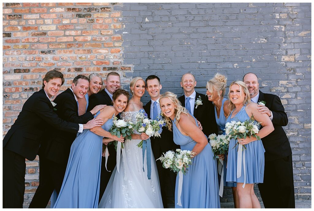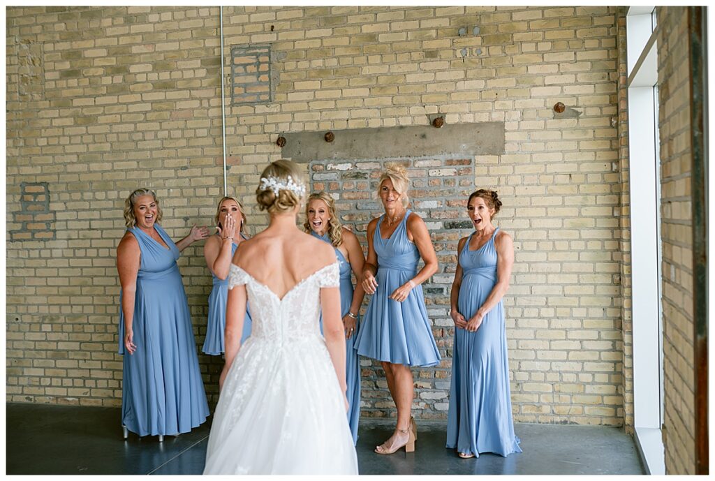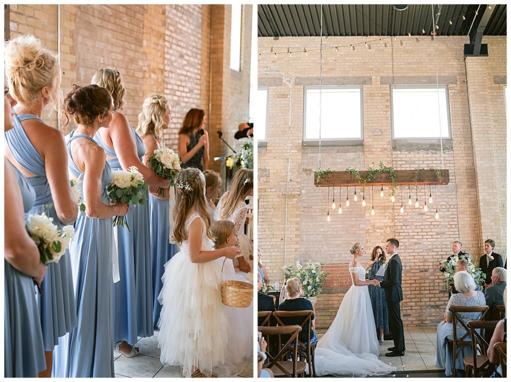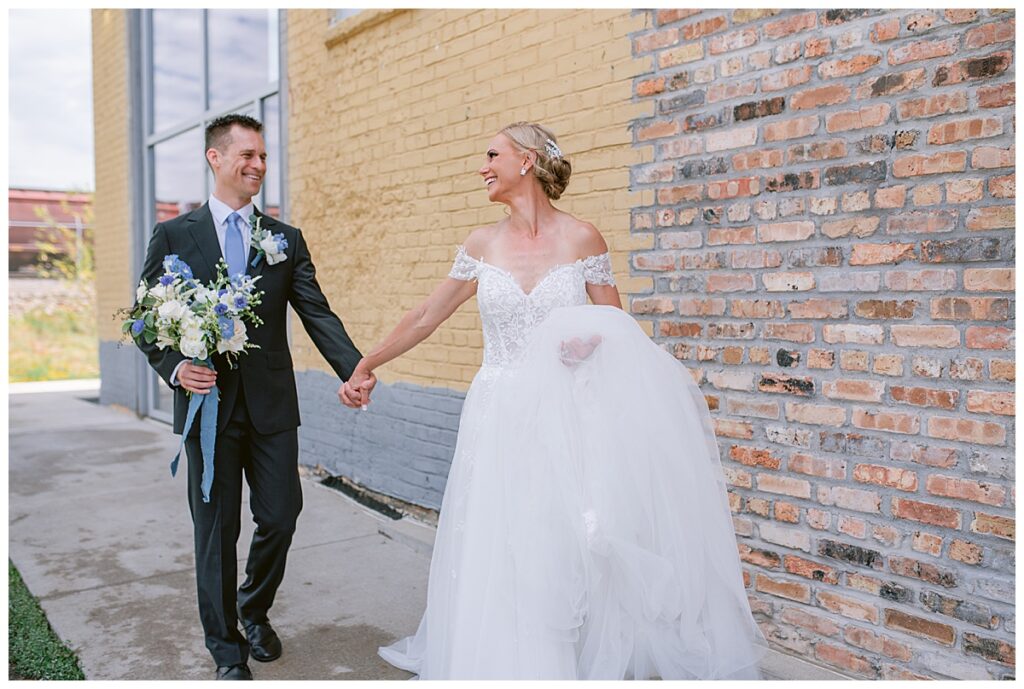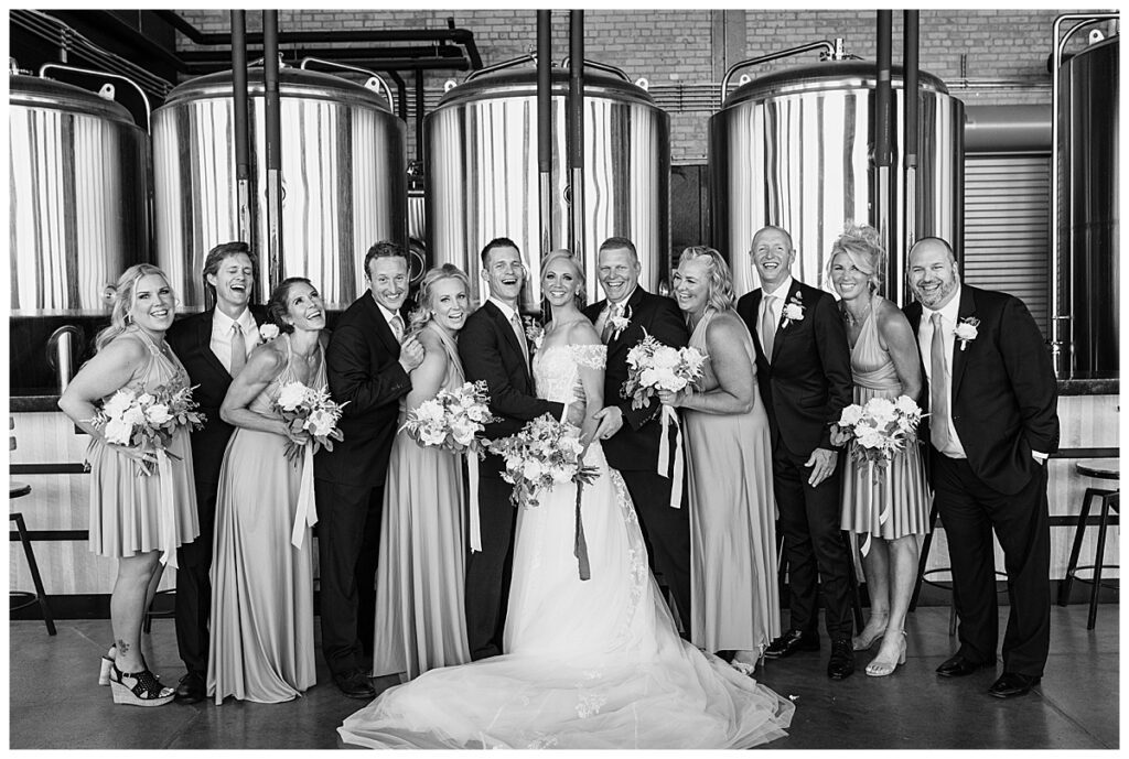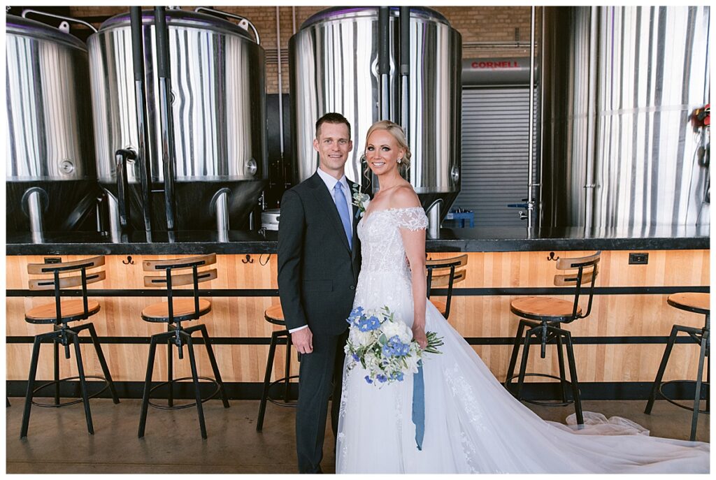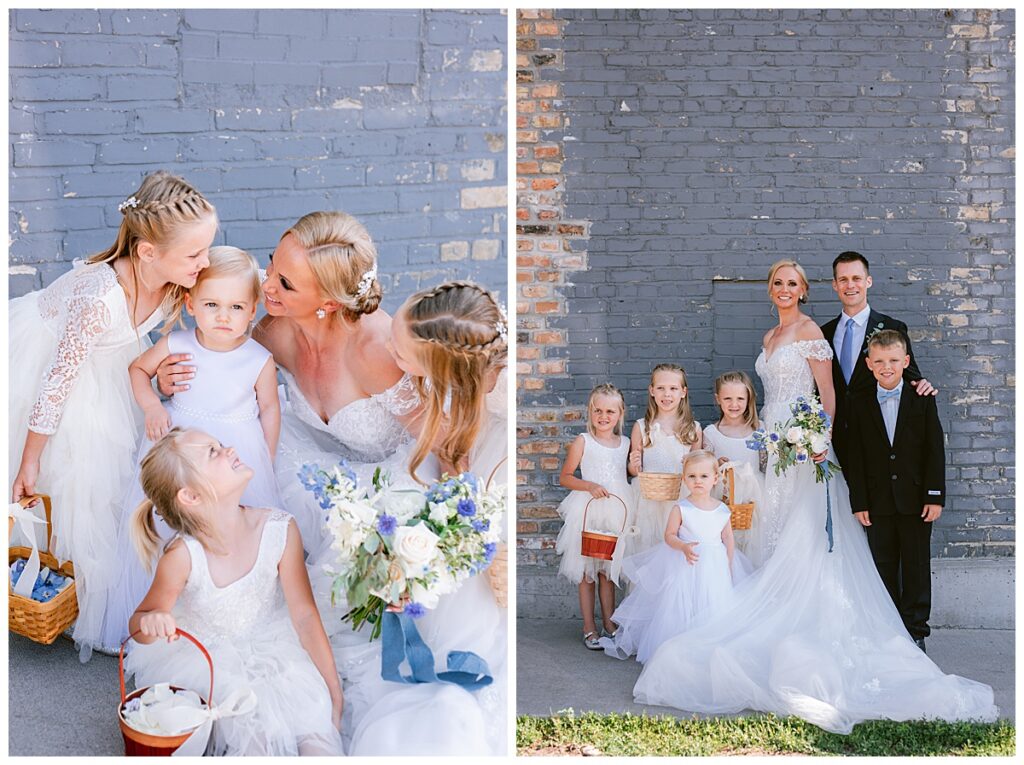 Suzie and Scott chose to host their wedding at Forgotten Star Brewing Co in Fridley, MN. They wanted to make the holiday weekend one that guests could relax and enjoy while still celebrating with them. They began the day getting ready at the Brewery for thir first look with each other and then their kids. Suzie looked stunning in her Zinnia dress from Annika Bridal and Molly from Willow Salon gave her the most beautiful updo. Amy Rachael highlighted Suzie’s already beautiful face with the perfect make-up. Suzie’s bridesmaids all wore their periwnkle dress in different styles created by Infinity Dress and the homegrown flowers of peooey’s, cornflowers and greens Ink ‘N Flower put together were perfect for Suzie and Scott’s relaxed July day. We utulized the historic industrial indoor space for photos both of the brewery and the murals. We then headed outdoors for more photos outside of the space and added family and wedding party.