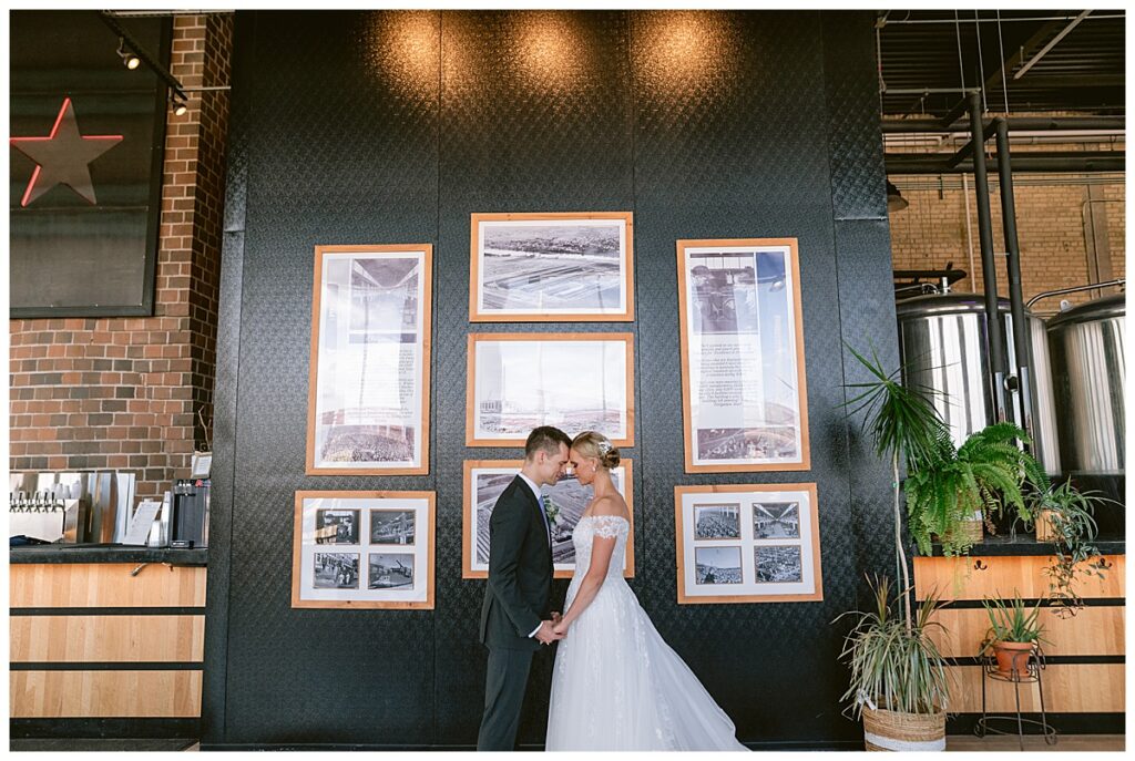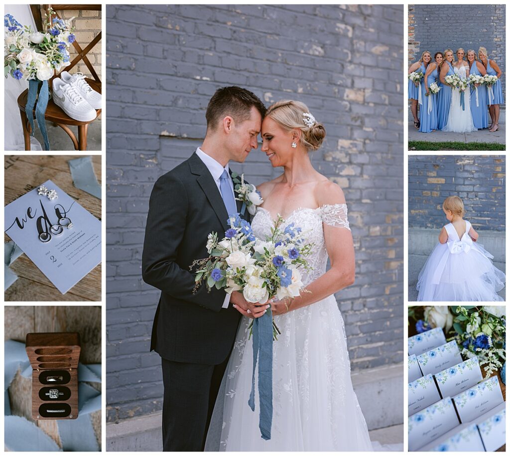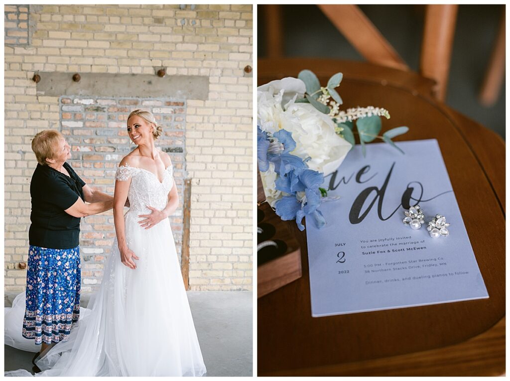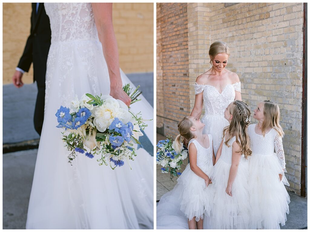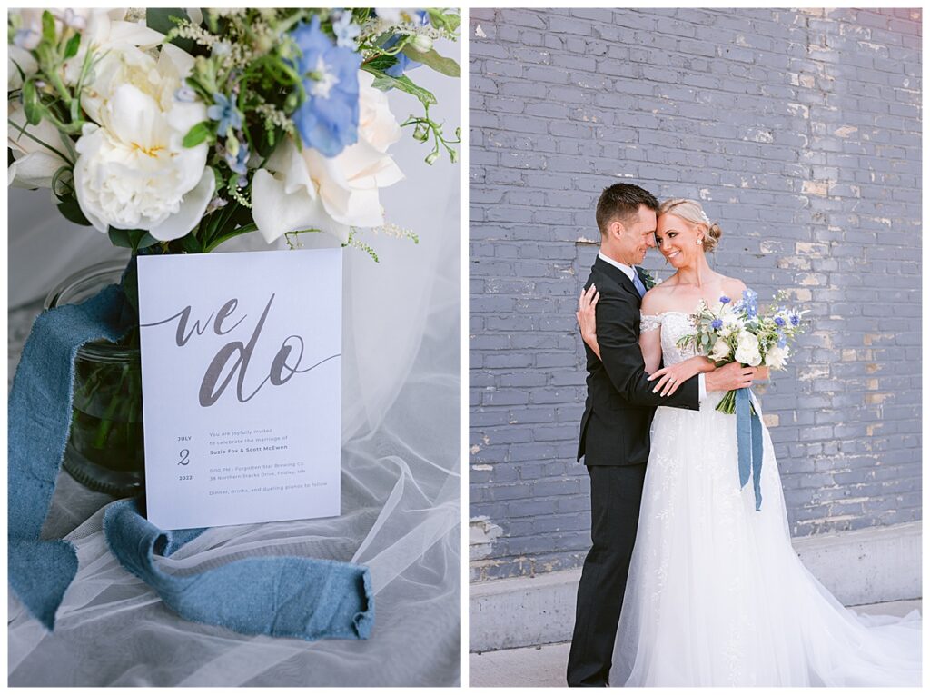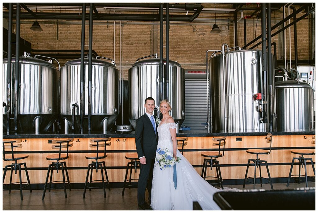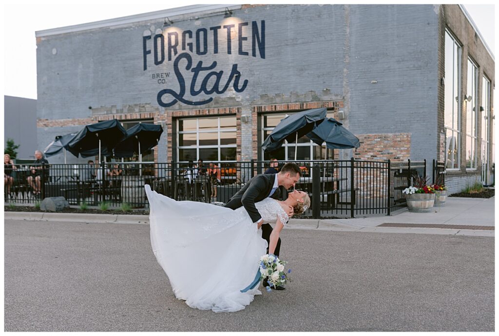 Suzie and Scott chose to host their wedding at Forgotten Star Brewing Co in Fridley, MN. They wanted to make the holiday weekend one that guests could relax and enjoy while still celebrating with them. They began the day getting ready at the Brewery for thir first look with each other and then their kids. Suzie looked stunning in her Zinnia dress from Annika Bridal and Molly from Willow Salon gave her the most beautiful updo. Amy Rachael highlighted Suzie’s already beautiful face with the perfect make-up. Suzie’s bridesmaids all wore their periwnkle dress in different styles created by Infinity Dress and the homegrown flowers of peooey’s, cornflowers and greens Ink ‘N Flower put together were perfect for Suzie and Scott’s relaxed July day. We utulized the historic industrial indoor space for photos both of the brewery and the murals. We then headed outdoors for more photos outside of the space and added family and wedding party.