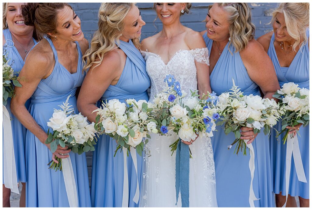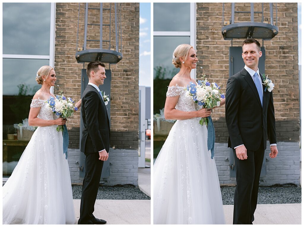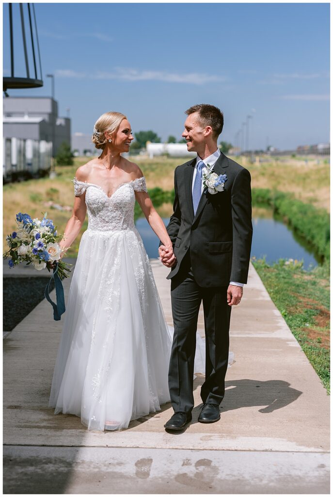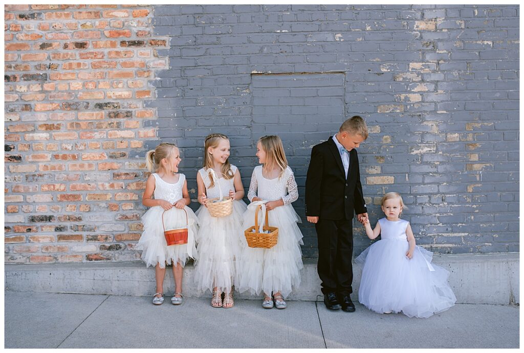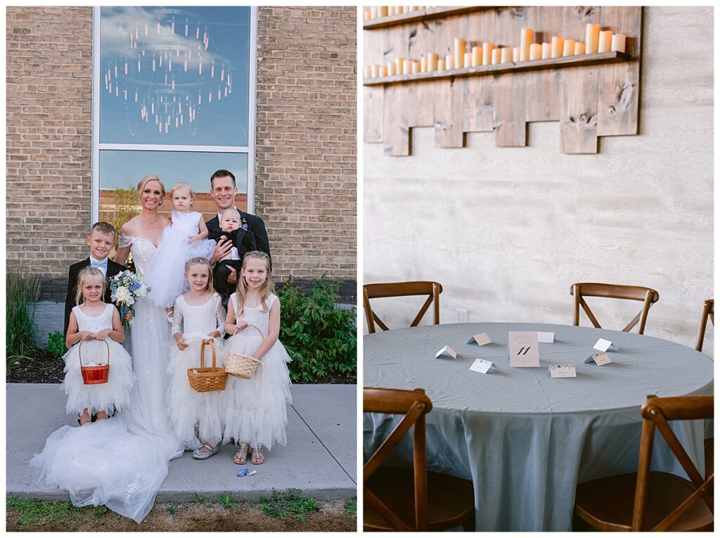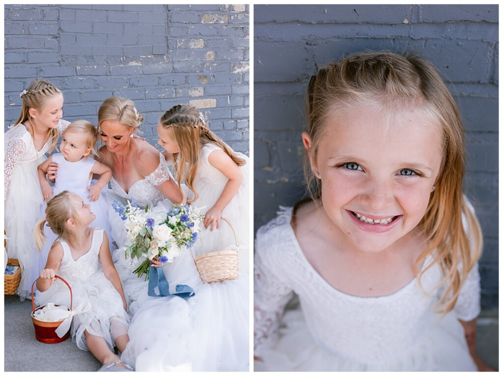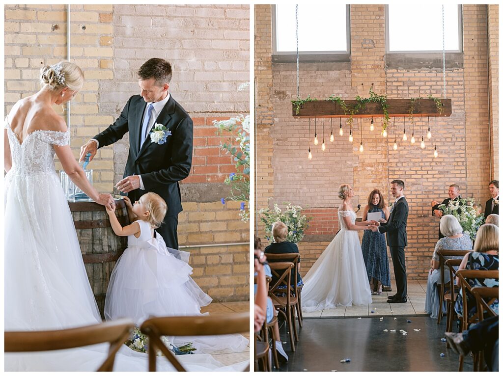 Suzie and Scott chose to host their wedding at Forgotten Star Brewing Co in Fridley, MN. They wanted to make the holiday weekend one that guests could relax and enjoy while still celebrating with them. They began the day getting ready at the Brewery for thir first look with each other and then their kids. Suzie looked stunning in her Zinnia dress from Annika Bridal and Molly from Willow Salon gave her the most beautiful updo. Amy Rachael highlighted Suzie’s already beautiful face with the perfect make-up. Suzie’s bridesmaids all wore their periwnkle dress in different styles created by Infinity Dress and the homegrown flowers of peooey’s, cornflowers and greens Ink ‘N Flower put together were perfect for Suzie and Scott’s relaxed July day. We utulized the historic industrial indoor space for photos both of the brewery and the murals. We then headed outdoors for more photos outside of the space and added family and wedding party.