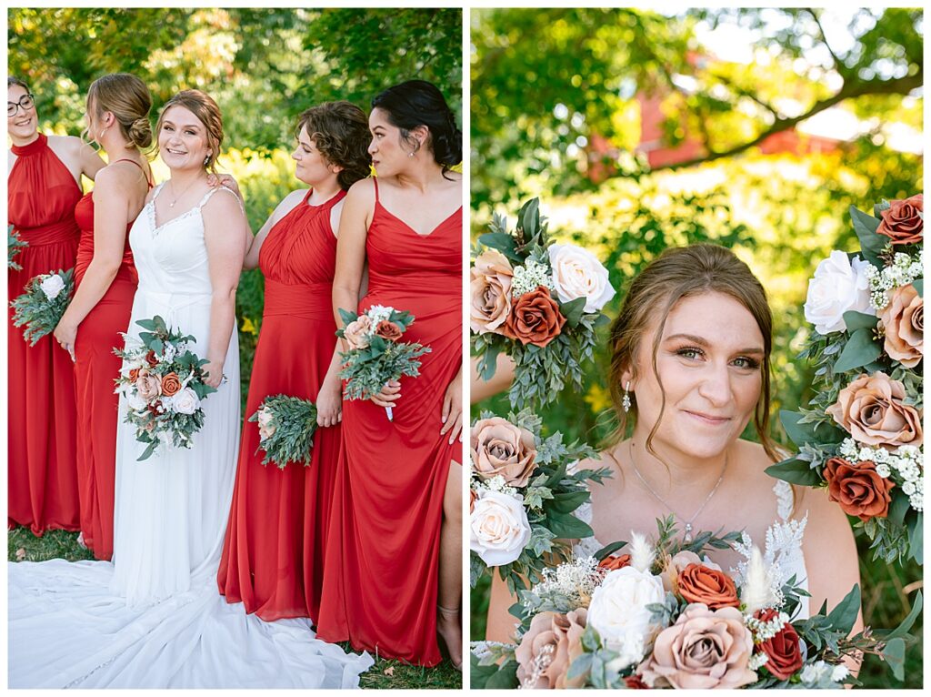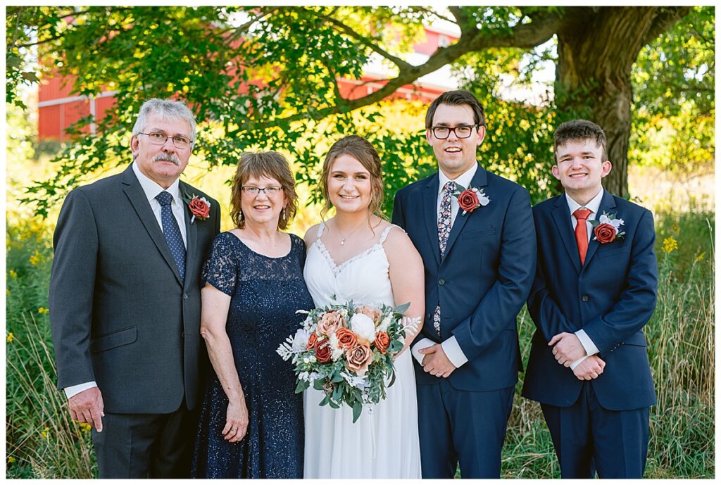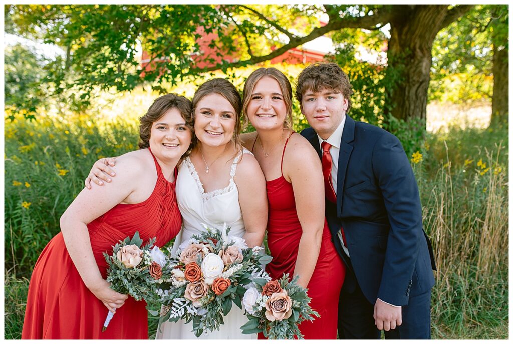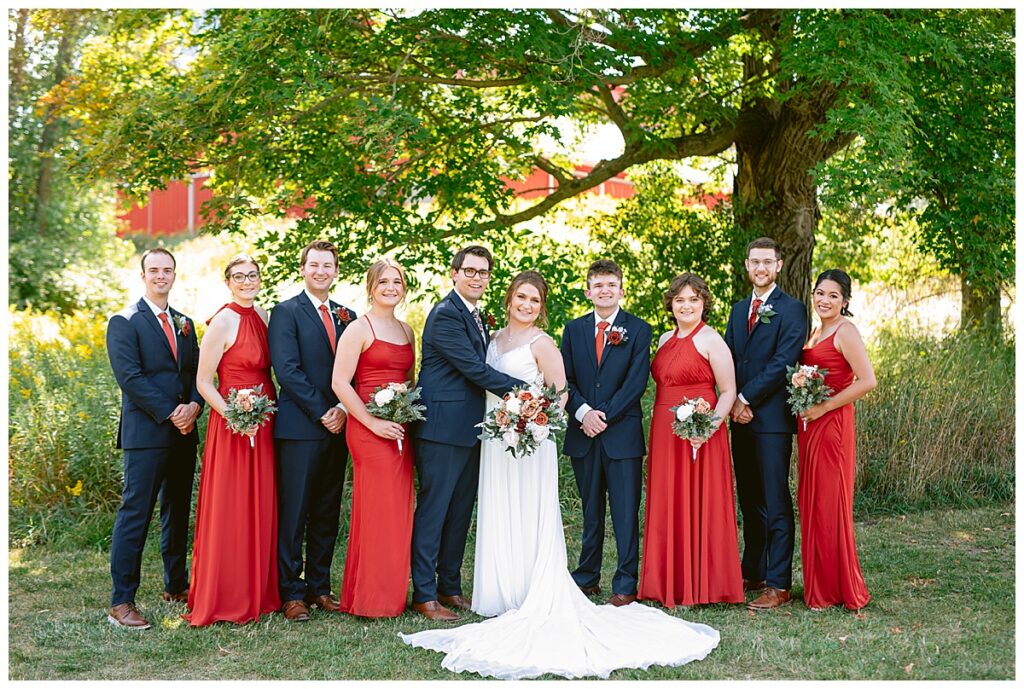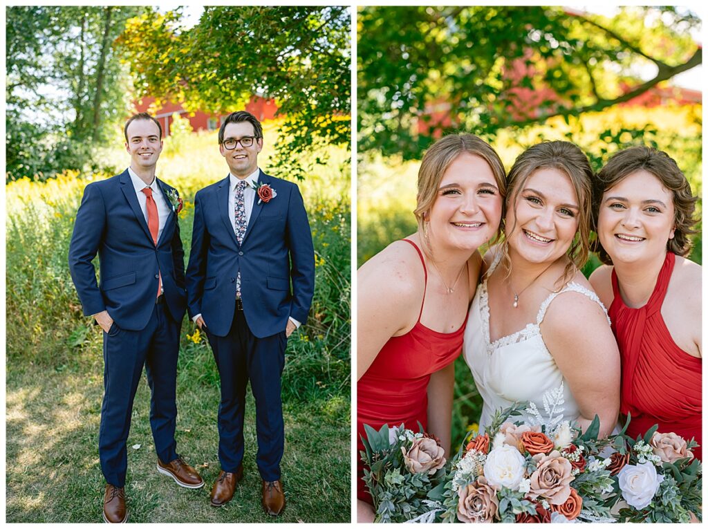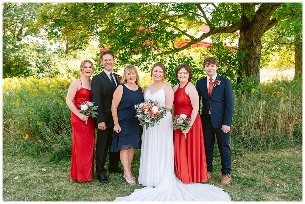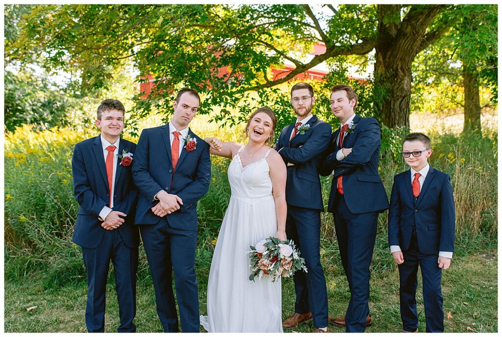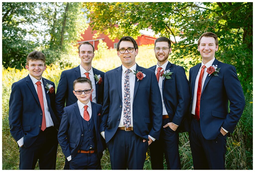 The wedding party soon joined the couple with the ladies wearing burnt orange dresses, purchased from Azazie and the men looking in dapper navy suits from Knights Chamber in Maple Grove. The beautiful bouquets from Our Blessed Woods were the perfect accent when placed against the dresses and suits. Family then arrived for their time with photos