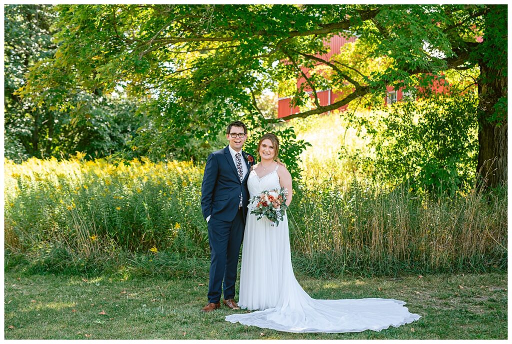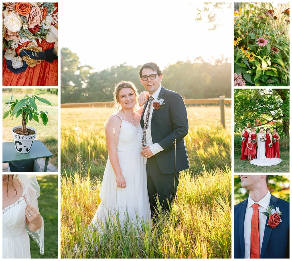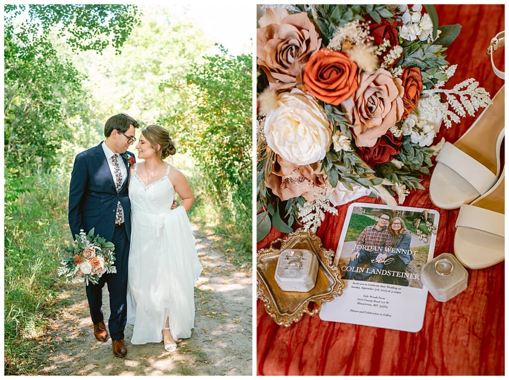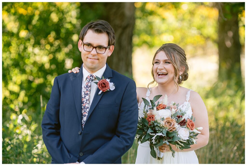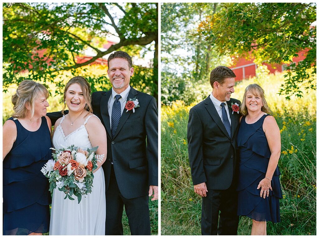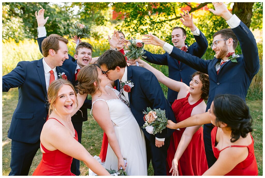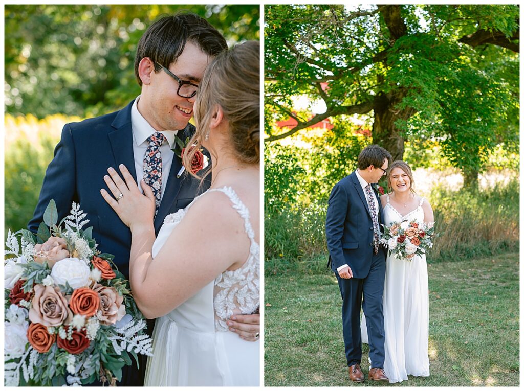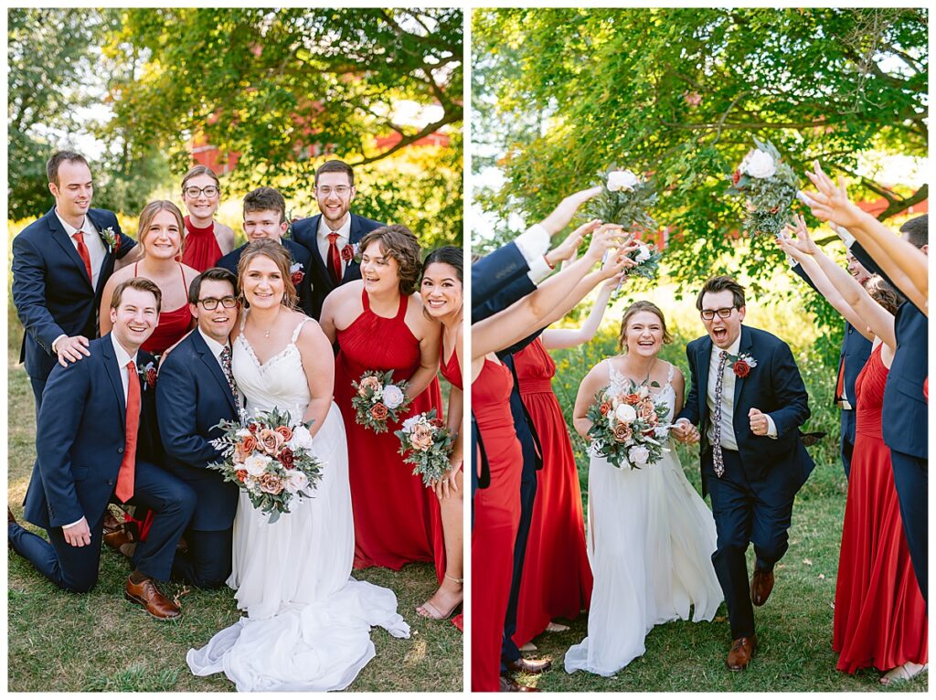 The wedding party soon joined the couple with the ladies wearing burnt orange dresses, purchased from Azazie and the men looking in dapper navy suits from Knights Chamber in Maple Grove. The beautiful bouquets from Our Blessed Woods were the perfect accent when placed against the dresses and suits. Family then arrived for their time with photos