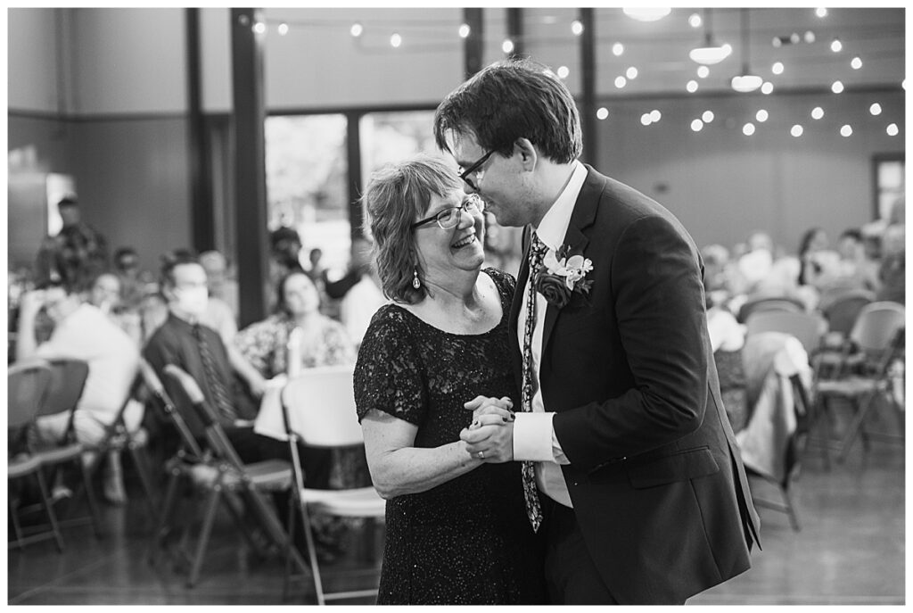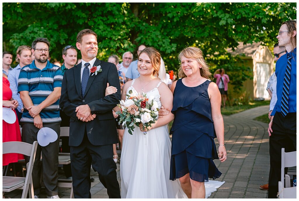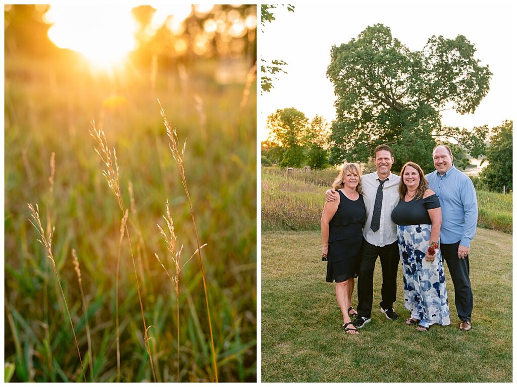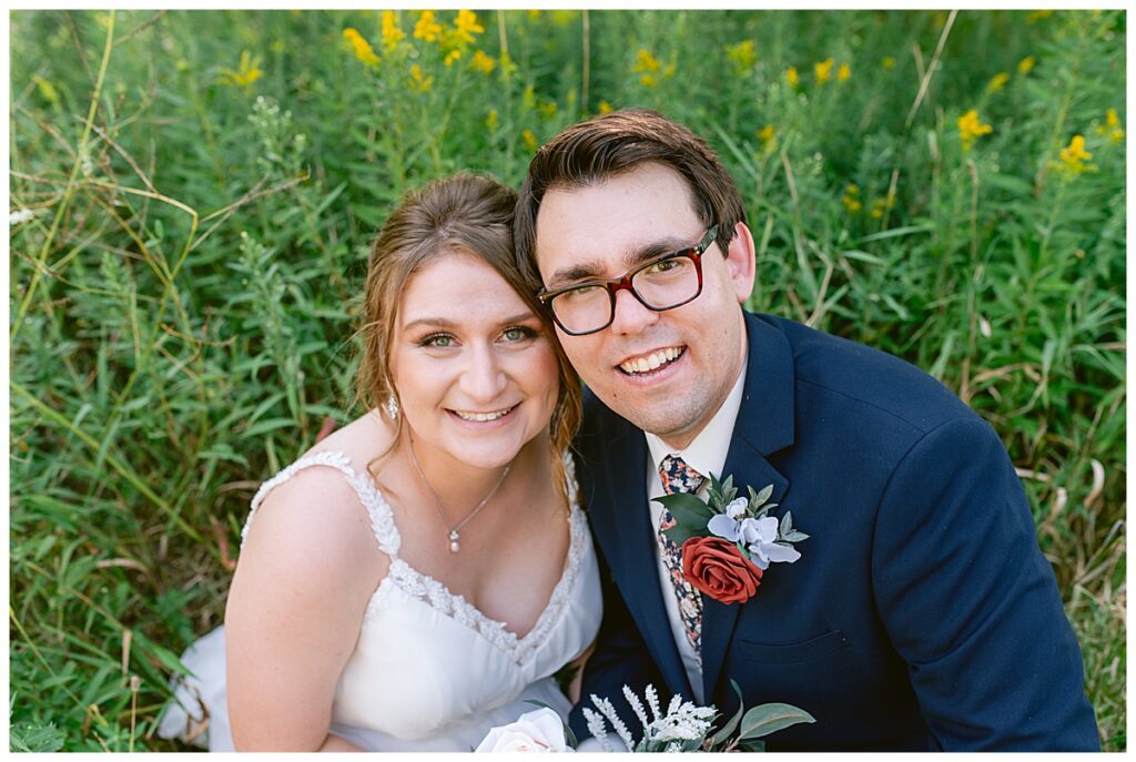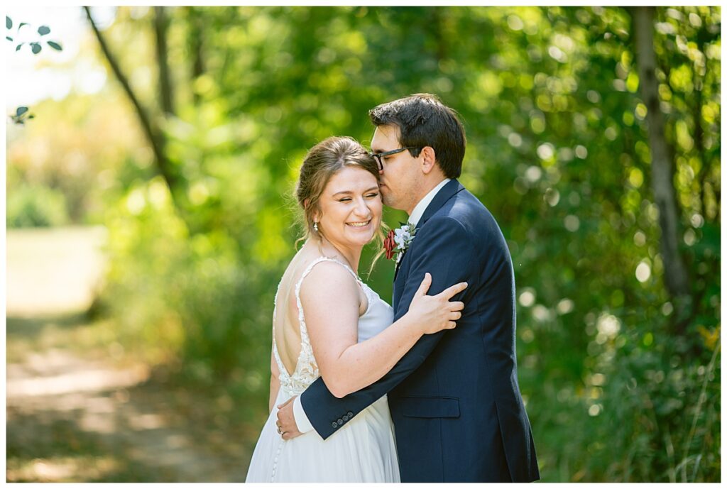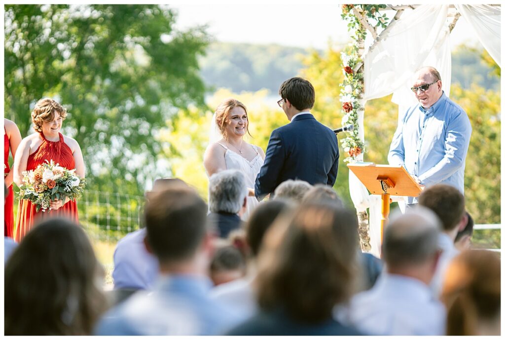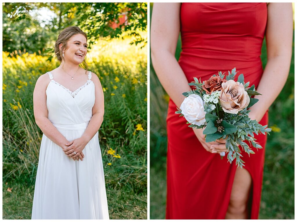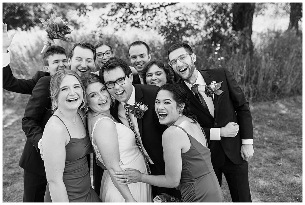 The wedding party soon joined the couple with the ladies wearing burnt orange dresses, purchased from Azazie and the men looking in dapper navy suits from Knights Chamber in Maple Grove. The beautiful bouquets from Our Blessed Woods were the perfect accent when placed against the dresses and suits. Family then arrived for their time with photos