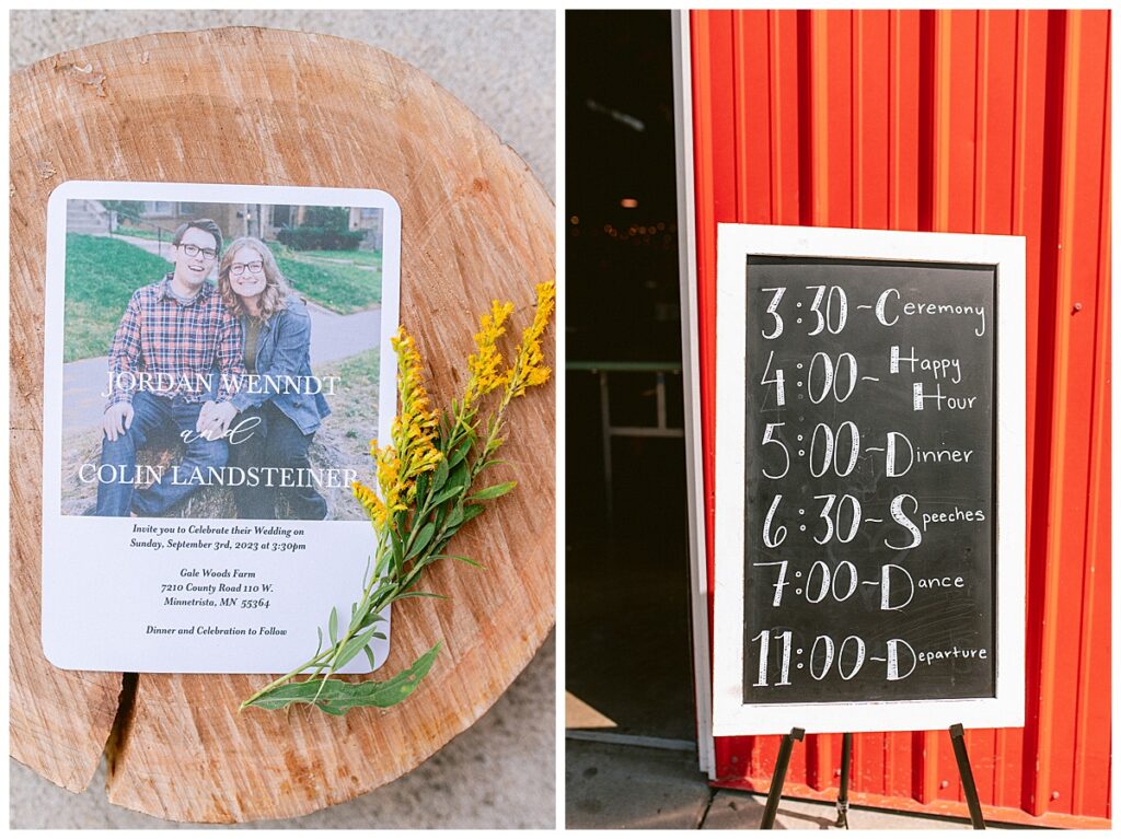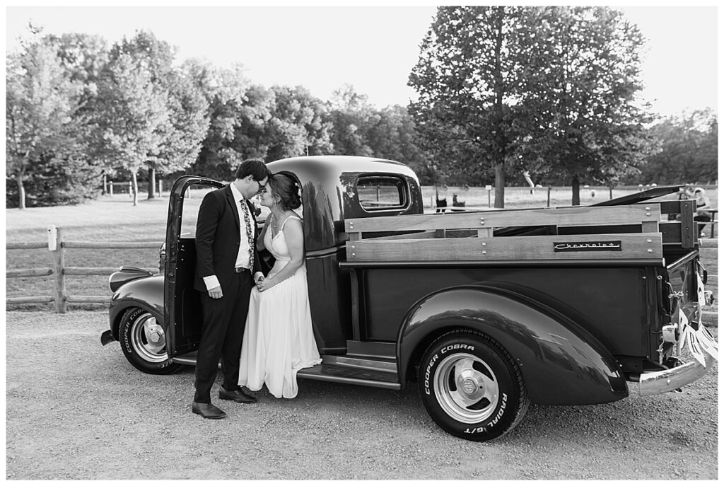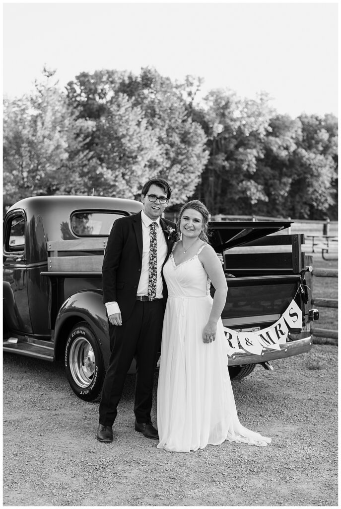 Their day was one of the hottest of the summer, but it didn’t stop them from having an incredible time. The outdoor ceremony began with Jordan and her father walking down the aisle while guests were encouraged to take ice packs on water bottles to stay cool. Colin and Jordan then exchanged rings from Wedding Day Diamonds while their guess looked on. The couple were celebrated as they were pronounced husband and wife and then greeted guests in the beautiful green space of the barn. They then headed in for an incredible dinner provided by Lunds and Byerlys and then went to cut their cake from Sift Bakery. After toasts they headed out for a beautiful golden hour along for photos near her grandfathers 1946 bright blue Chevy Truck. Jordan and Colin then came back to the dance floor for their first dance and Dirk Umbanhowar kept the party going for guests all night long. Colin and Jordan, congratulations! Enjoy your incredible honeymoon in New York City.