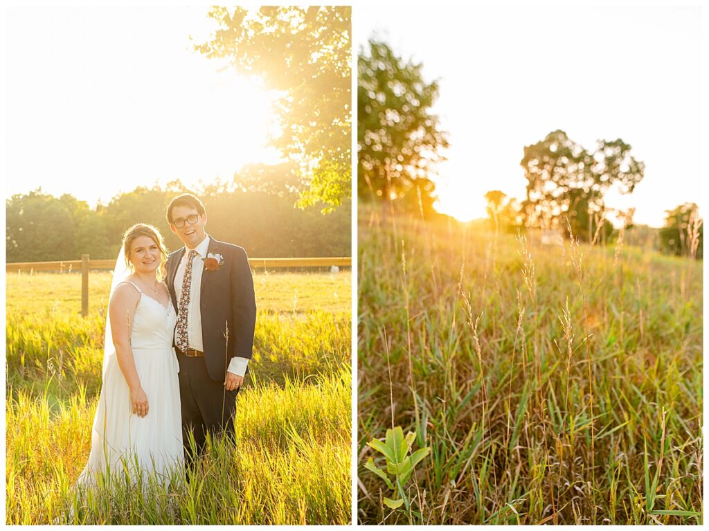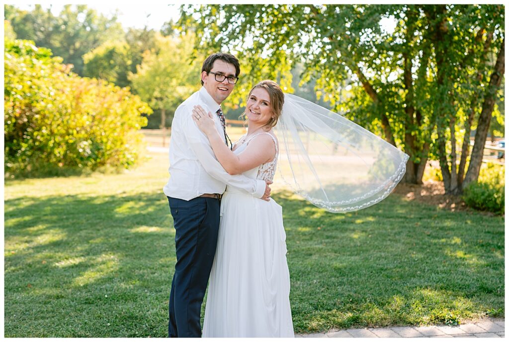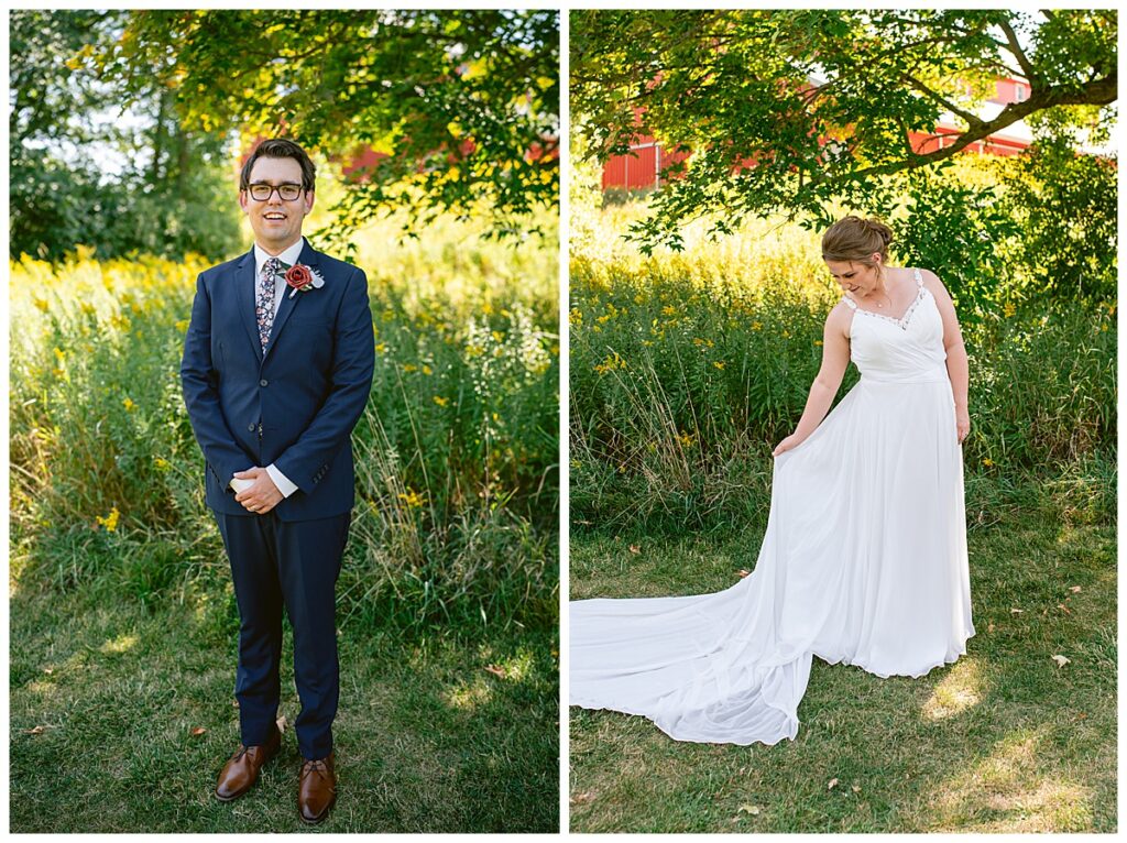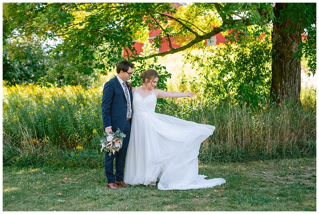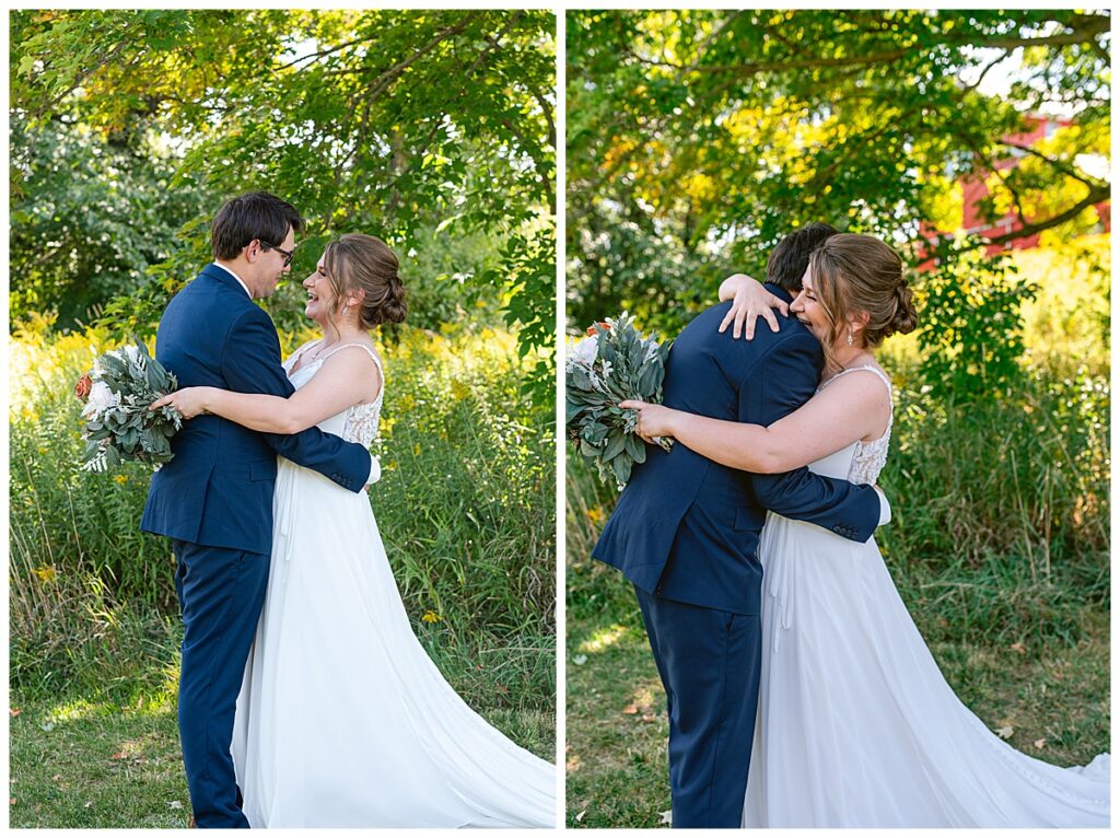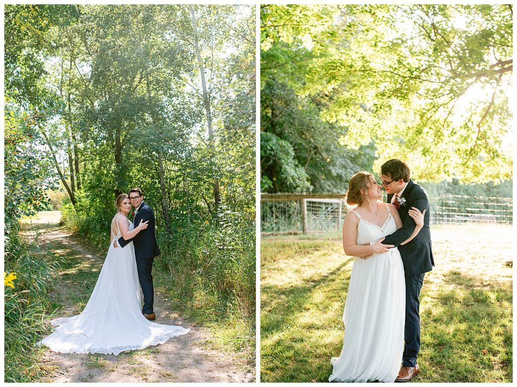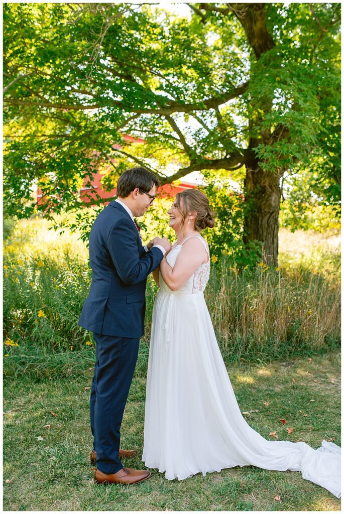 Jordan and Colin chose to host their wedding at Gale Woods Farm. Located on picturesque Whaletail Lake in Minnetrista, Gale Woods Farm features tall grasses, wide open fields and a variety of farm animals for guests to enjoy. The day began while Jordan and her bridesmaids got ready with Brianna Michaelson of Breezy Beauty, who did their hair and make up. Jordan then arrived at Gale Woods Farm in her beautiful Madeline Garner Morilee dress purchased at the Wedding Shoppe in Saint Paul. Colin was waiting for her at the bottom of the hill where the two chose to do their first look. We wandered along the grounds before Colin presented Jordan with a gift, a piece of their beloved stump, ready to be made into a beautiful end table for their home. Jordan was astonished and all tears as she hugged Colin.