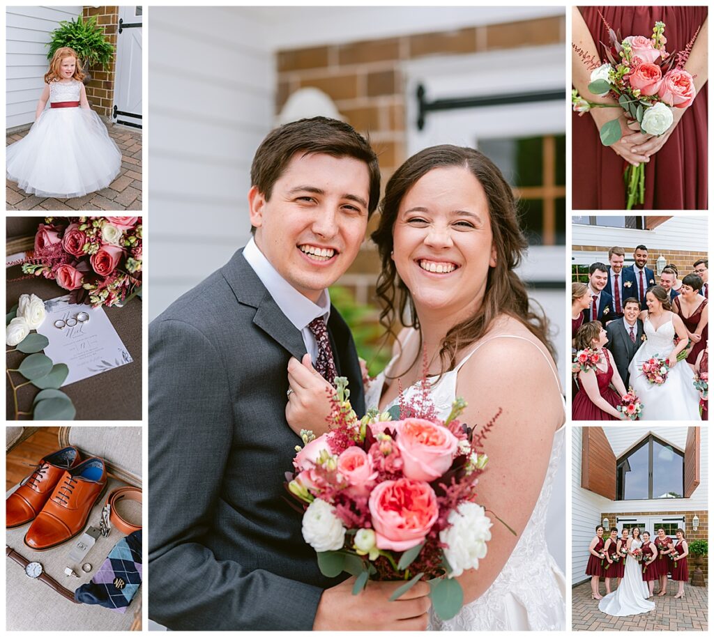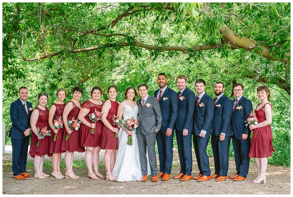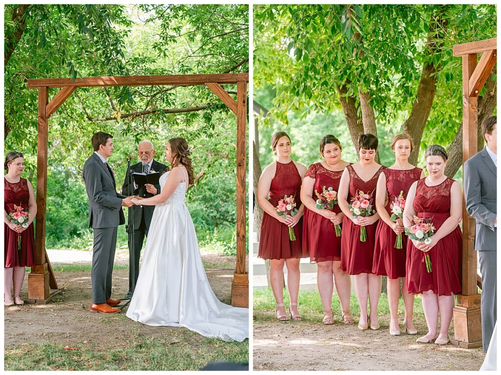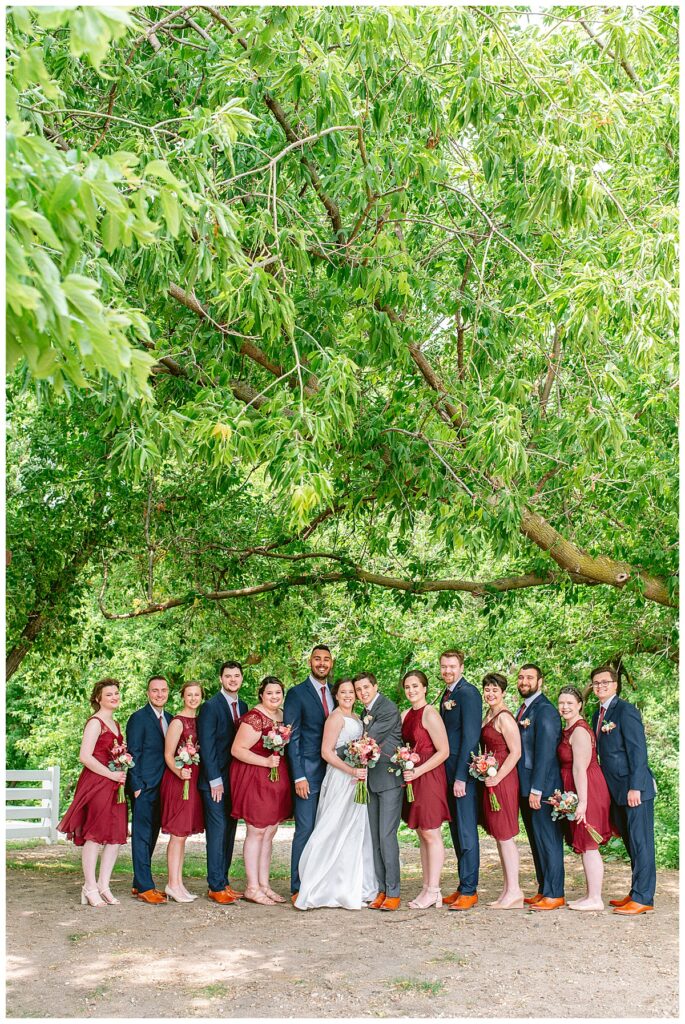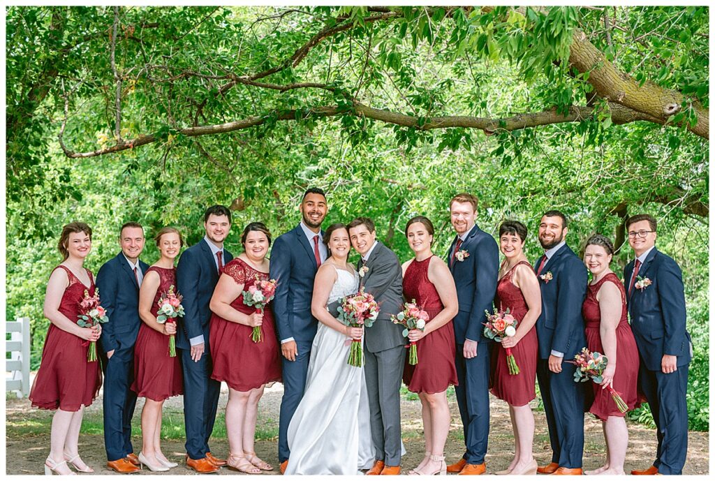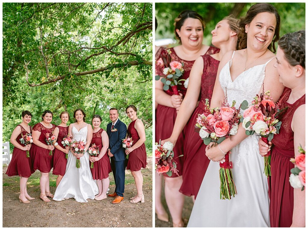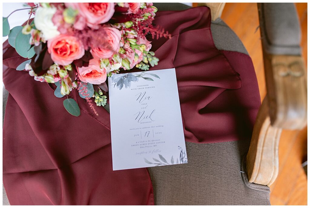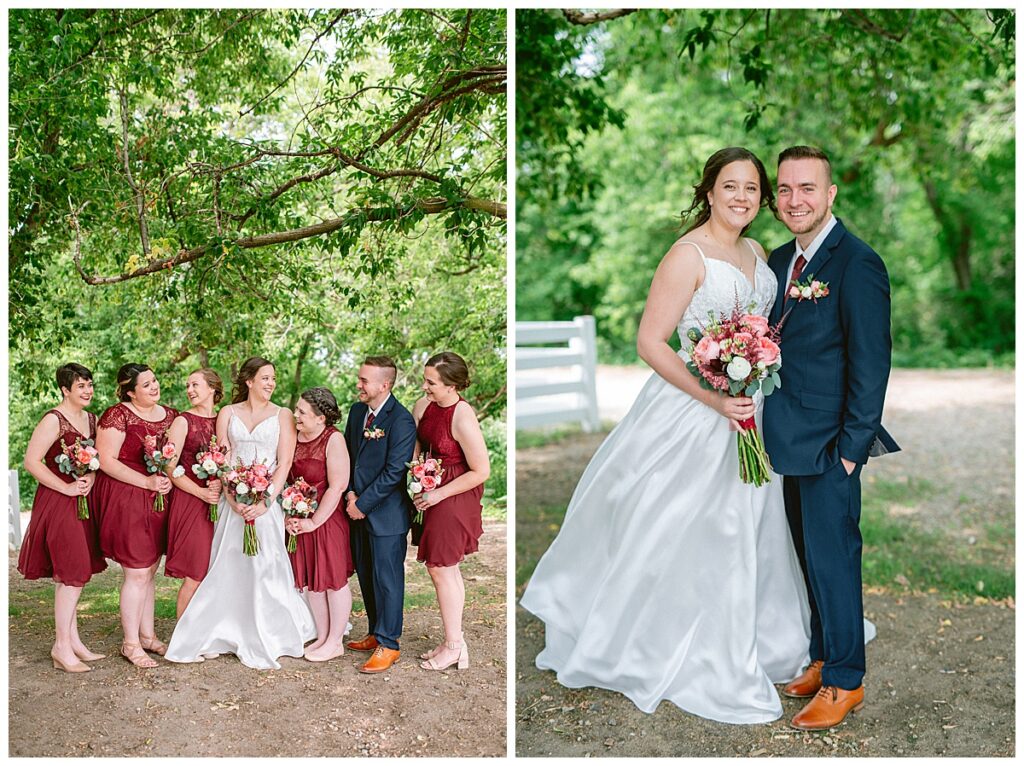 Green Acres was the perfect venue for Nick and Nia to tie the knot. The girls began their warm June day at Coles Salon in Savage with hair and make up and then headed over to the venue. Nick and his groomsmen met them there and they all began getting ready in the gorgeous barn venue. Nia‘s beautiful white Maggie Soretto dress from the wedding shop was perfect when paired with the burgundy and pink flowers design in bloom created for the day. Nick and Nia had a joyous first look and their wedding party, dressed in burgundy tea length dresses from JJ’s house and gray suits from Millbourne’s clothing, then joined them for some fun. Family photos followed and then guests began to arrive to celebrate with the happy couple. Nia’s step grandfather married the couple, and they both exchanged rings from wedding day diamonds and brilliant earth. Guests celebrated as Nick and Nia exited and then greeted guests for their cocktail hour where the bartenders whipped up drinks perfect to celebrate the occasion.