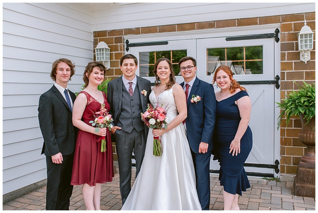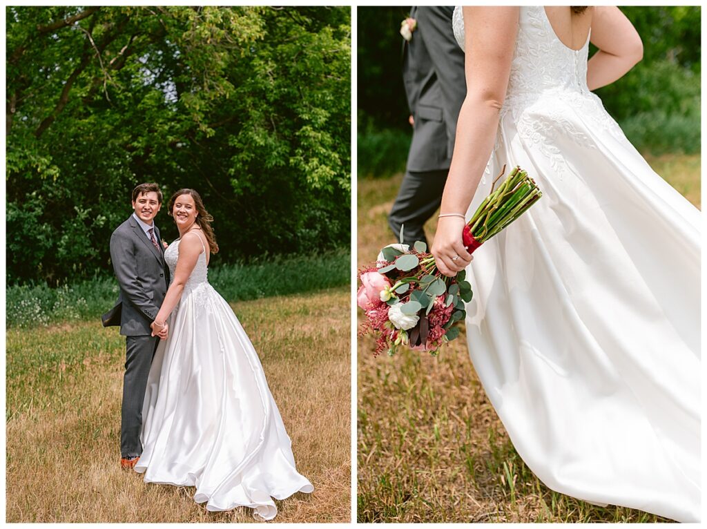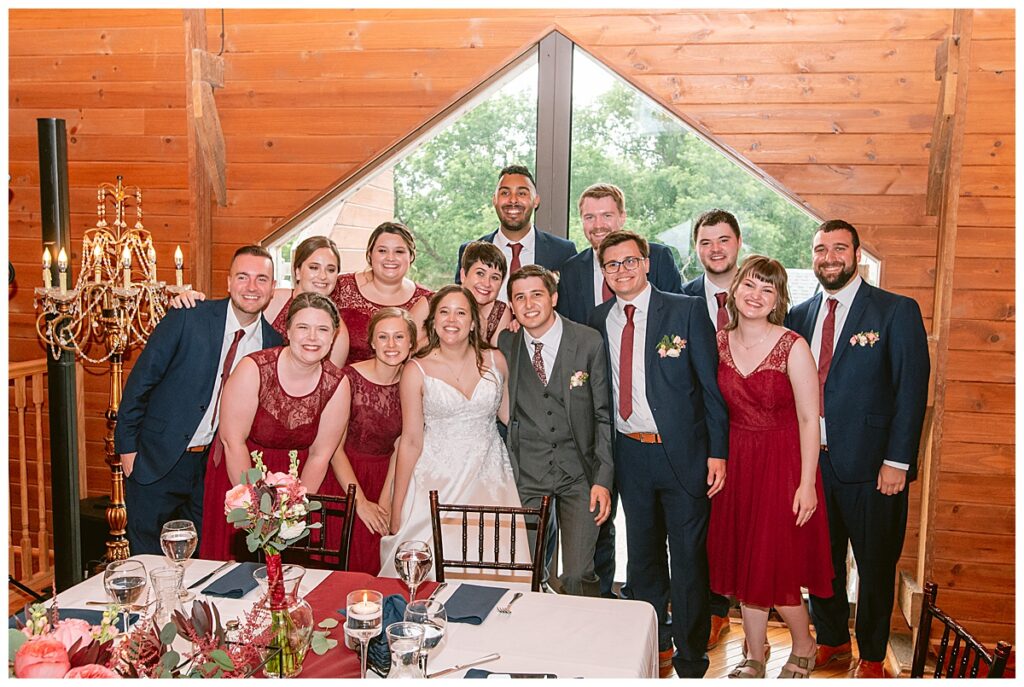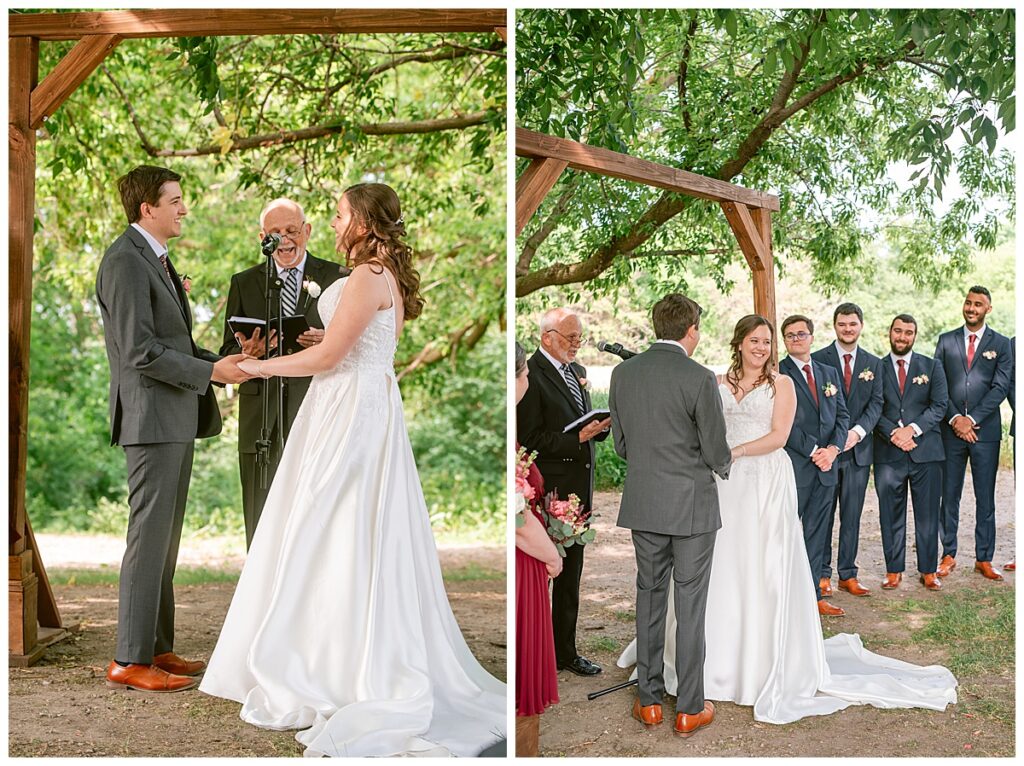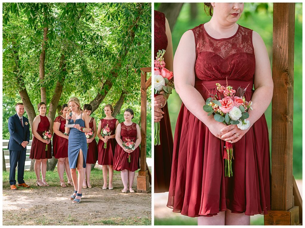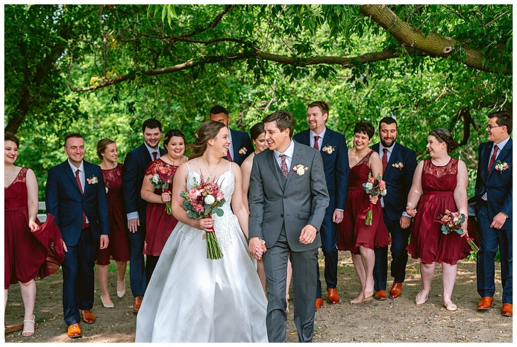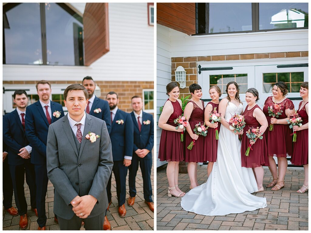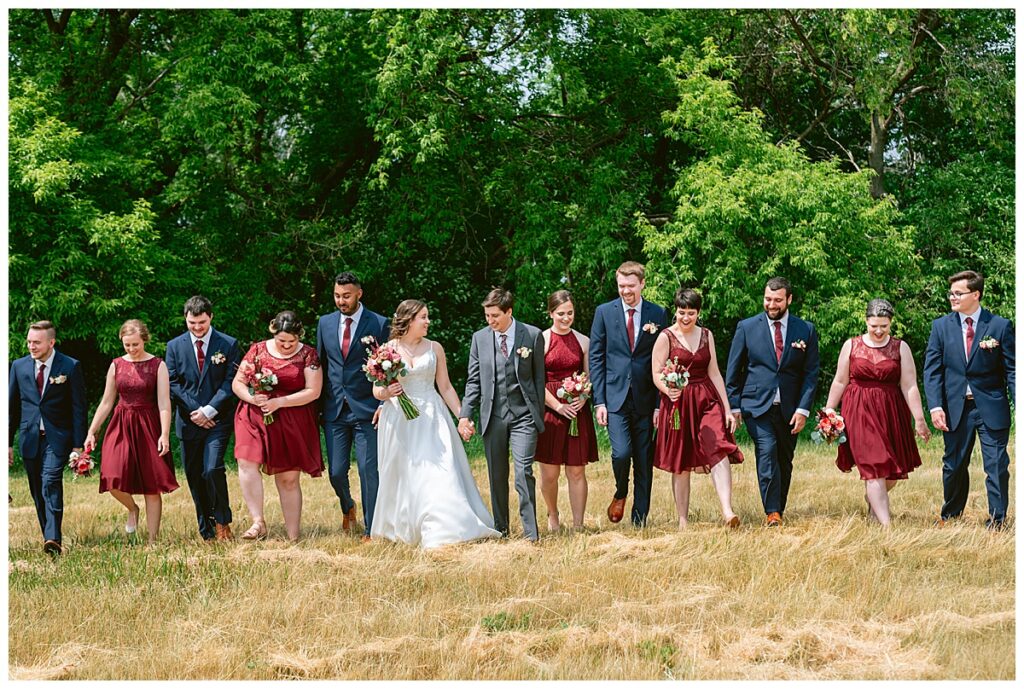 Green Acres was the perfect venue for Nick and Nia to tie the knot. The girls began their warm June day at Coles Salon in Savage with hair and make up and then headed over to the venue. Nick and his groomsmen met them there and they all began getting ready in the gorgeous barn venue. Nia‘s beautiful white Maggie Soretto dress from the wedding shop was perfect when paired with the burgundy and pink flowers design in bloom created for the day. Nick and Nia had a joyous first look and their wedding party, dressed in burgundy tea length dresses from JJ’s house and gray suits from Millbourne’s clothing, then joined them for some fun. Family photos followed and then guests began to arrive to celebrate with the happy couple. Nia’s step grandfather married the couple, and they both exchanged rings from wedding day diamonds and brilliant earth. Guests celebrated as Nick and Nia exited and then greeted guests for their cocktail hour where the bartenders whipped up drinks perfect to celebrate the occasion.