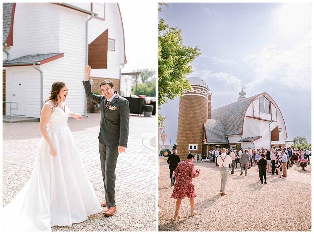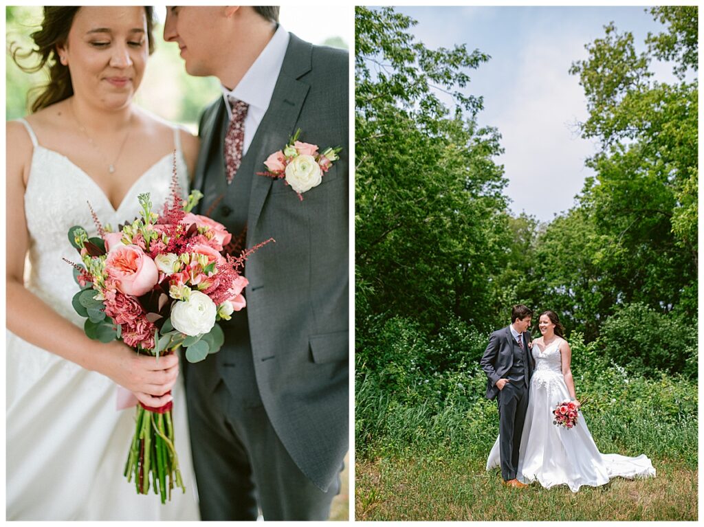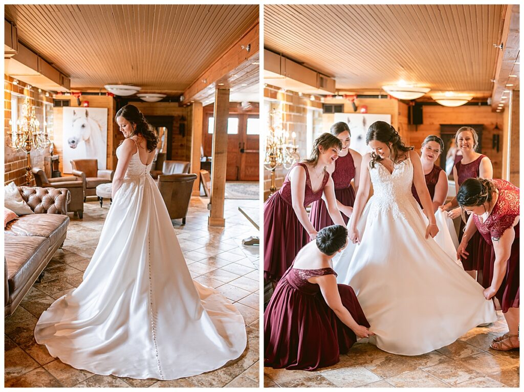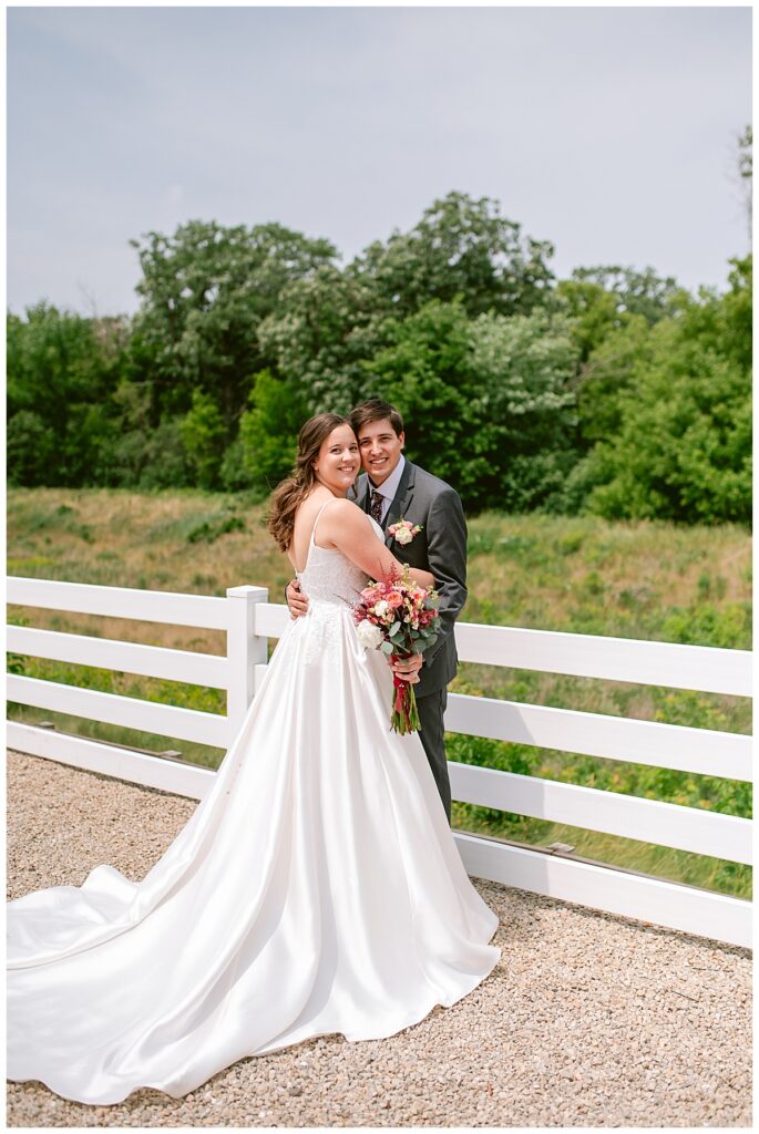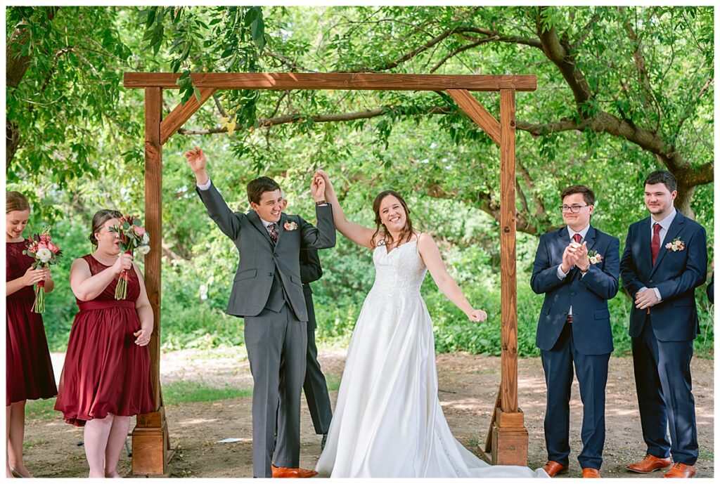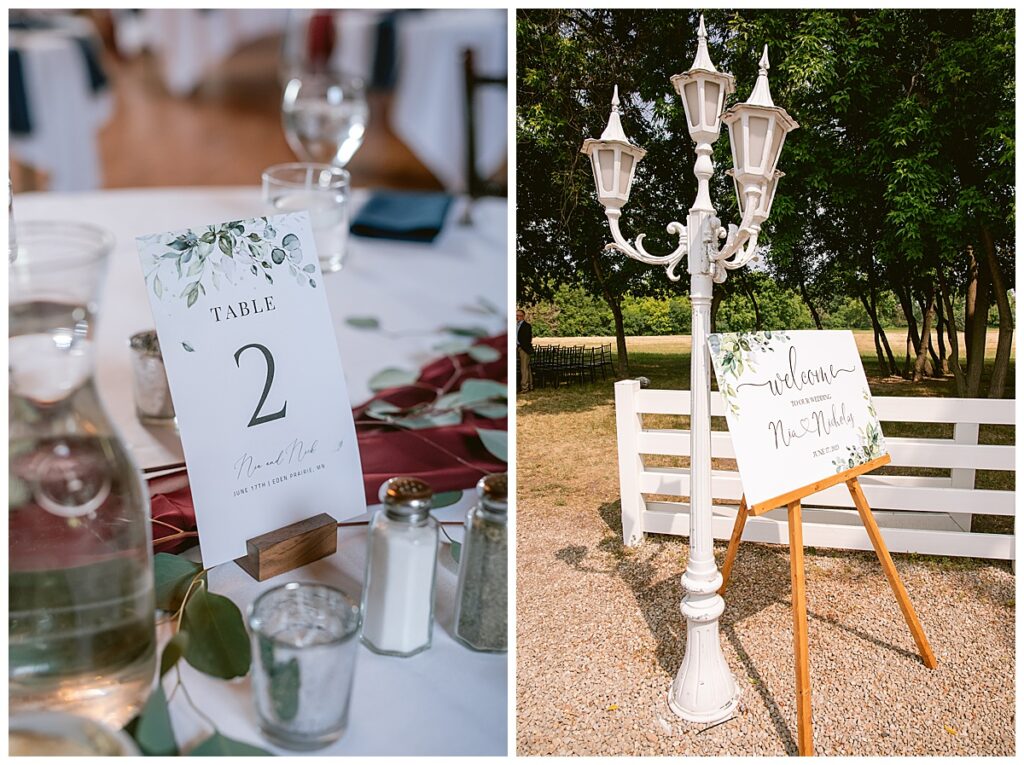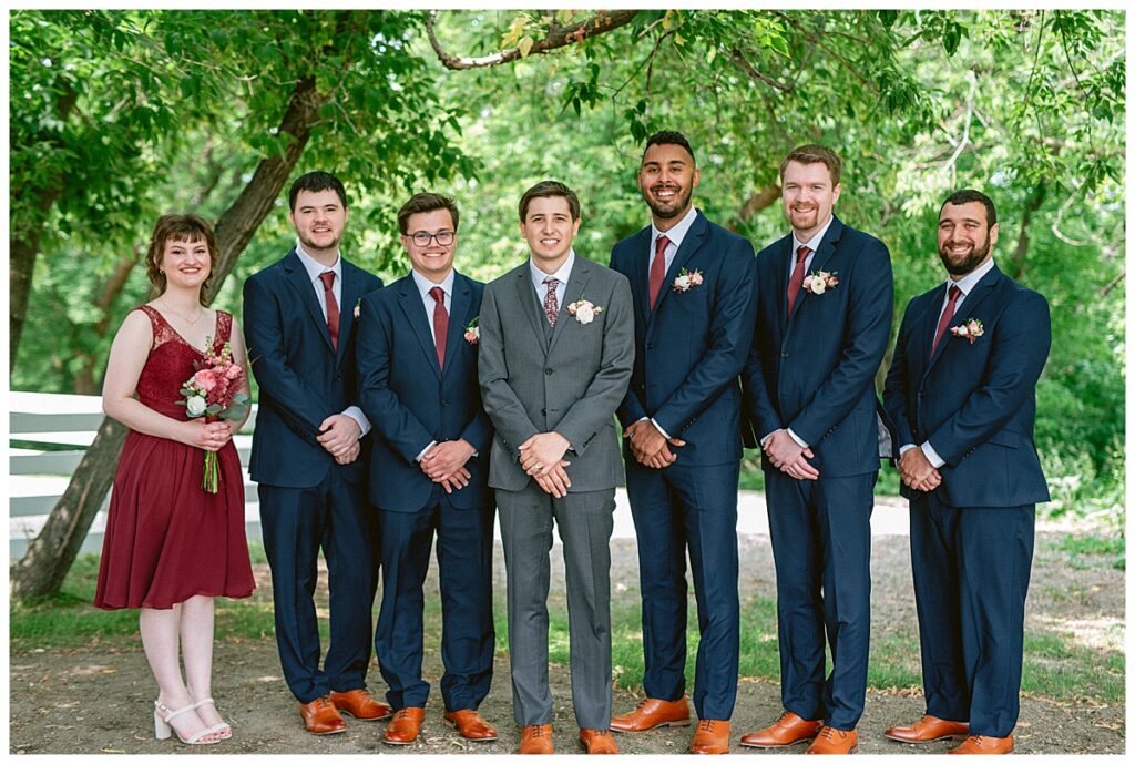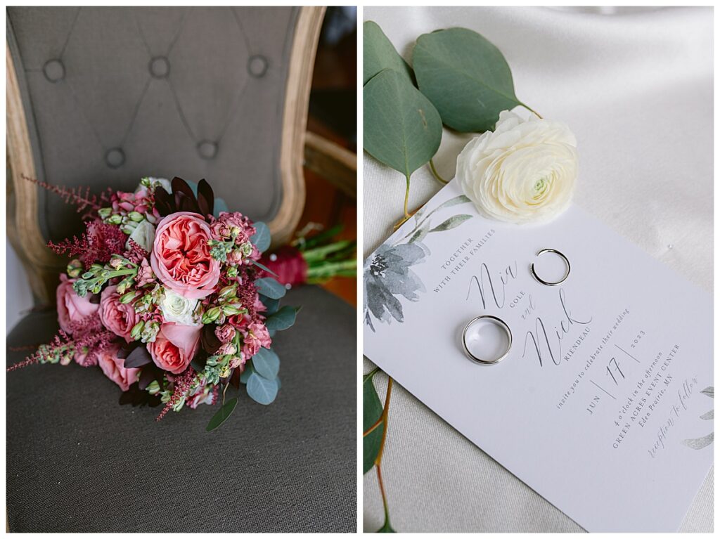Green Acres was the perfect venue for Nick and Nia to tie the knot. The girls began their warm June day at Coles Salon in Savage with hair and make up and then headed over to the venue. Nick and his groomsmen met them there and they all began getting ready in the gorgeous barn venue. Nia‘s beautiful white Maggie Soretto dress from the wedding shop was perfect when paired with the burgundy and pink flowers design in bloom created for the day. Nick and Nia had a joyous first look and their wedding party, dressed in burgundy tea length dresses from JJ’s house and gray suits from Millbourne’s clothing, then joined them for some fun. Family photos followed and then guests began to arrive to celebrate with the happy couple. Nia’s step grandfather married the couple, and they both exchanged rings from wedding day diamonds and brilliant earth. Guests celebrated as Nick and Nia exited and then greeted guests for their cocktail hour where the bartenders whipped up drinks perfect to celebrate the occasion.