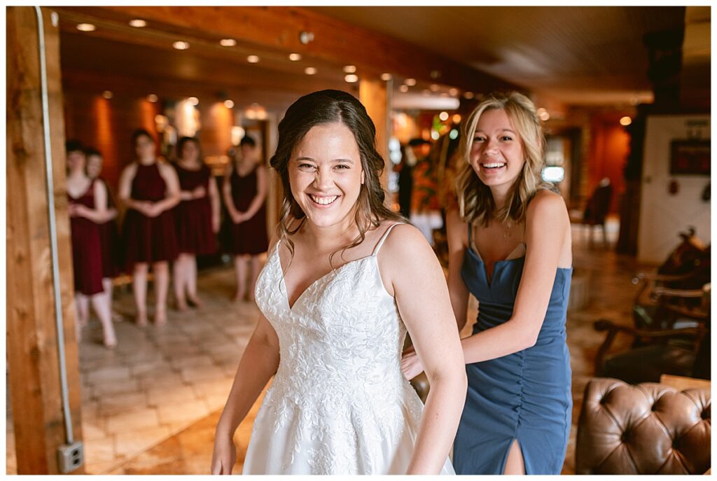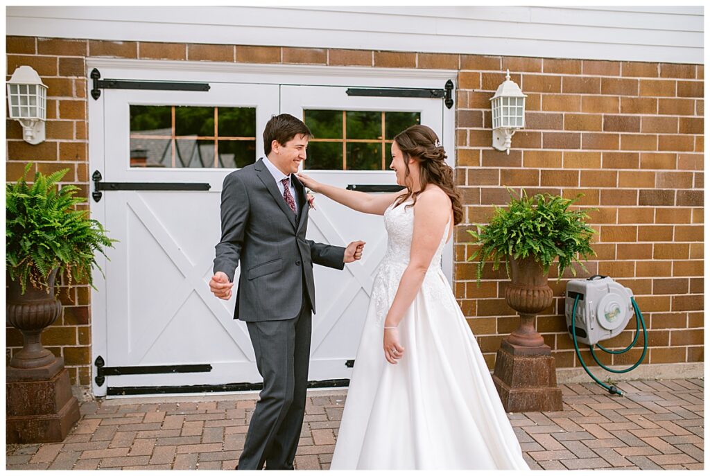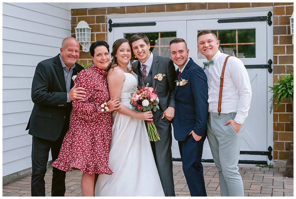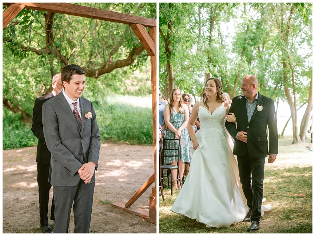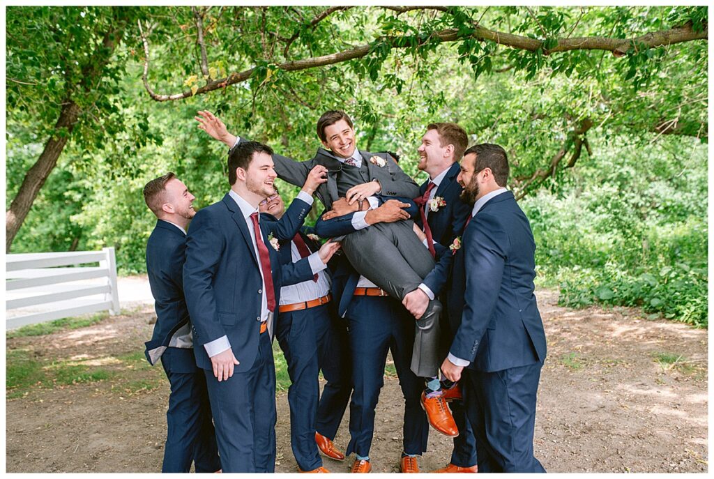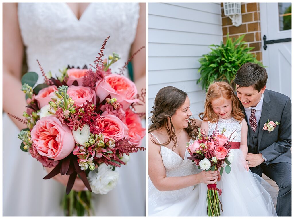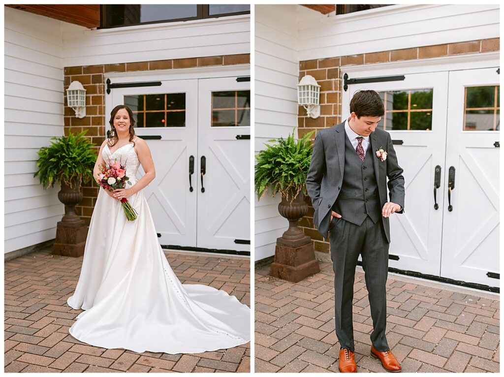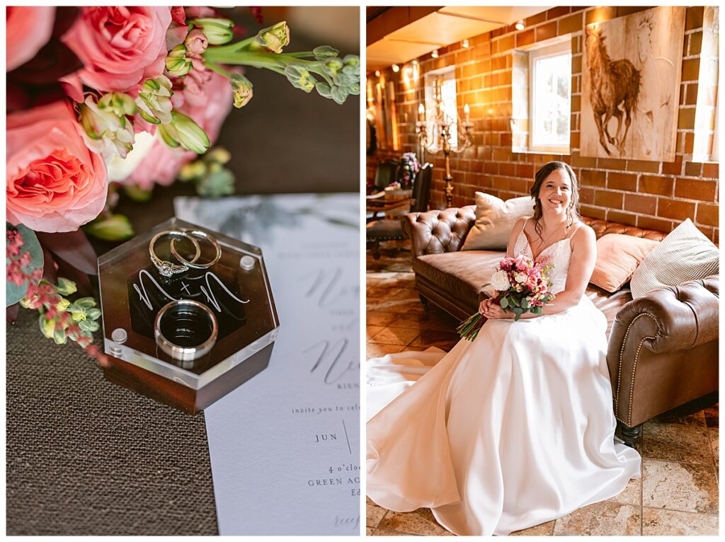 Green Acres was the perfect venue for Nick and Nia to tie the knot. The girls began their warm June day at Coles Salon in Savage with hair and make up and then headed over to the venue. Nick and his groomsmen met them there and they all began getting ready in the gorgeous barn venue. Nia‘s beautiful white Maggie Soretto dress from the wedding shop was perfect when paired with the burgundy and pink flowers design in bloom created for the day. Nick and Nia had a joyous first look and their wedding party, dressed in burgundy tea length dresses from JJ’s house and gray suits from Millbourne’s clothing, then joined them for some fun. Family photos followed and then guests began to arrive to celebrate with the happy couple. Nia’s step grandfather married the couple, and they both exchanged rings from wedding day diamonds and brilliant earth. Guests celebrated as Nick and Nia exited and then greeted guests for their cocktail hour where the bartenders whipped up drinks perfect to celebrate the occasion.