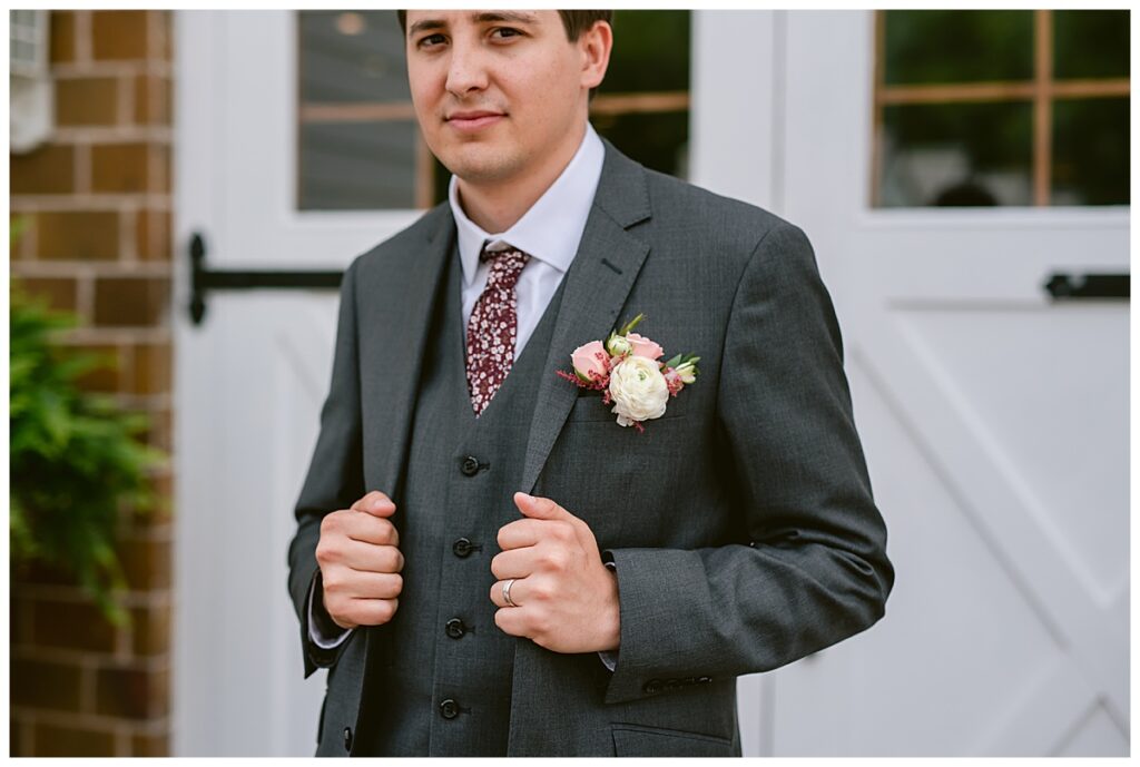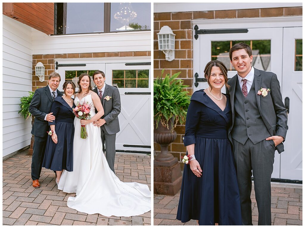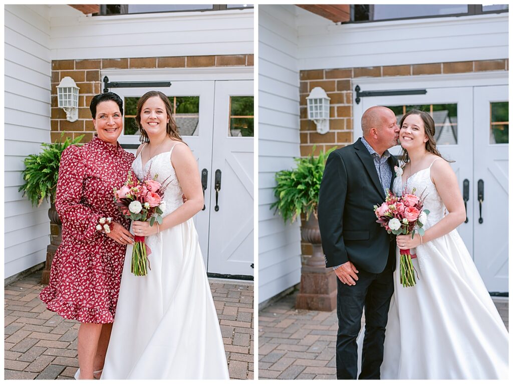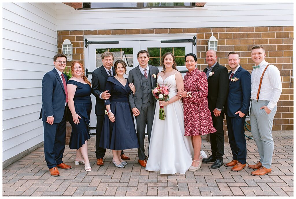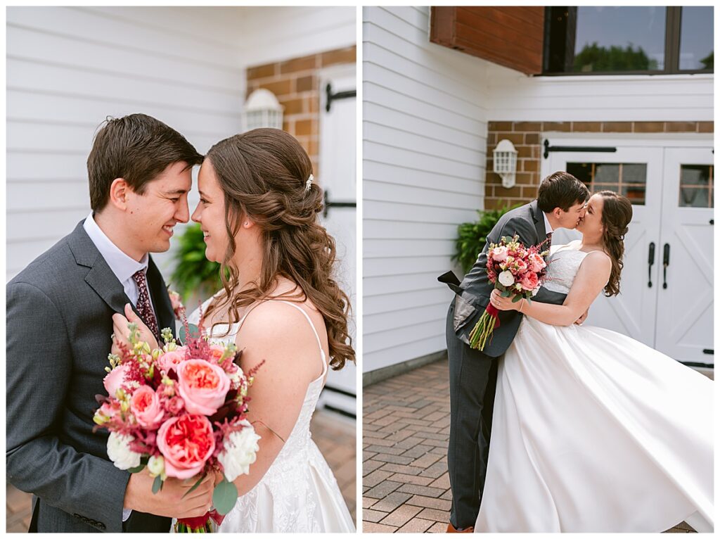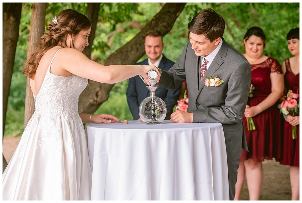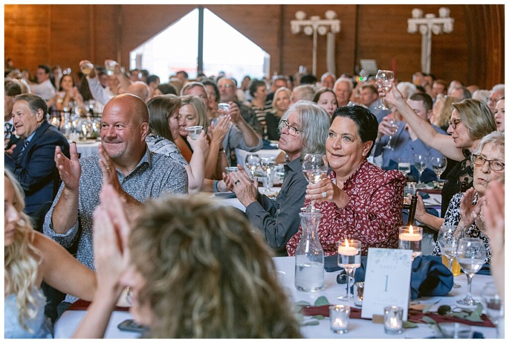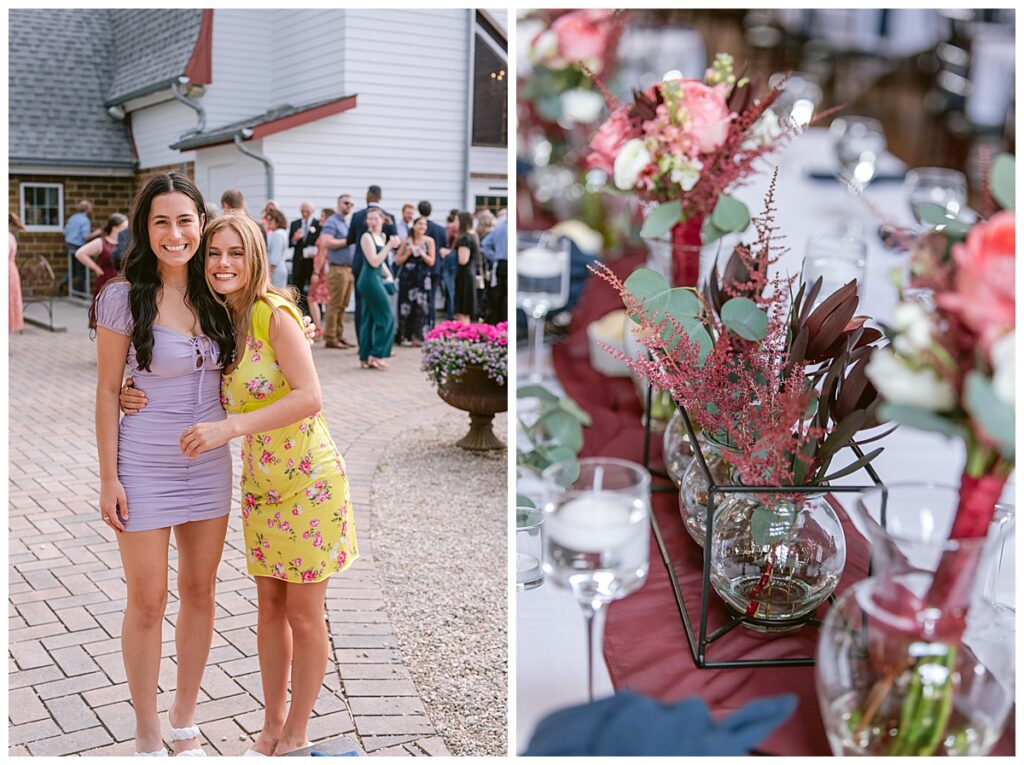 Green Acres was the perfect venue for Nick and Nia to tie the knot. The girls began their warm June day at Coles Salon in Savage with hair and make up and then headed over to the venue. Nick and his groomsmen met them there and they all began getting ready in the gorgeous barn venue. Nia‘s beautiful white Maggie Soretto dress from the wedding shop was perfect when paired with the burgundy and pink flowers design in bloom created for the day. Nick and Nia had a joyous first look and their wedding party, dressed in burgundy tea length dresses from JJ’s house and gray suits from Millbourne’s clothing, then joined them for some fun. Family photos followed and then guests began to arrive to celebrate with the happy couple. Nia’s step grandfather married the couple, and they both exchanged rings from wedding day diamonds and brilliant earth. Guests celebrated as Nick and Nia exited and then greeted guests for their cocktail hour where the bartenders whipped up drinks perfect to celebrate the occasion.