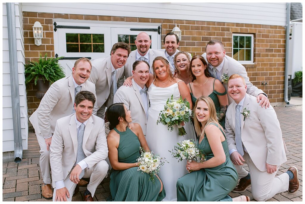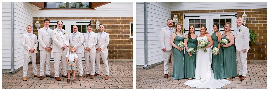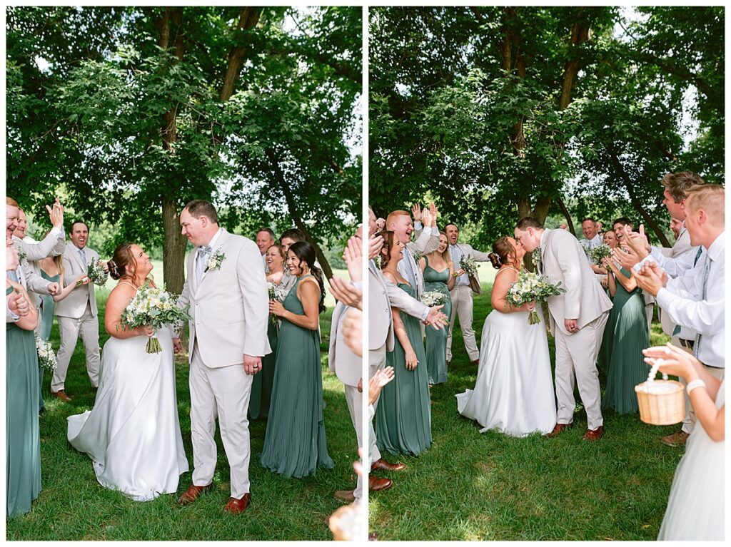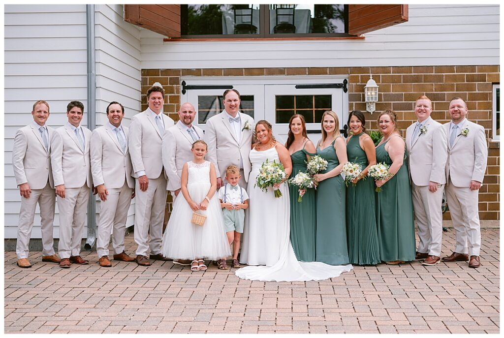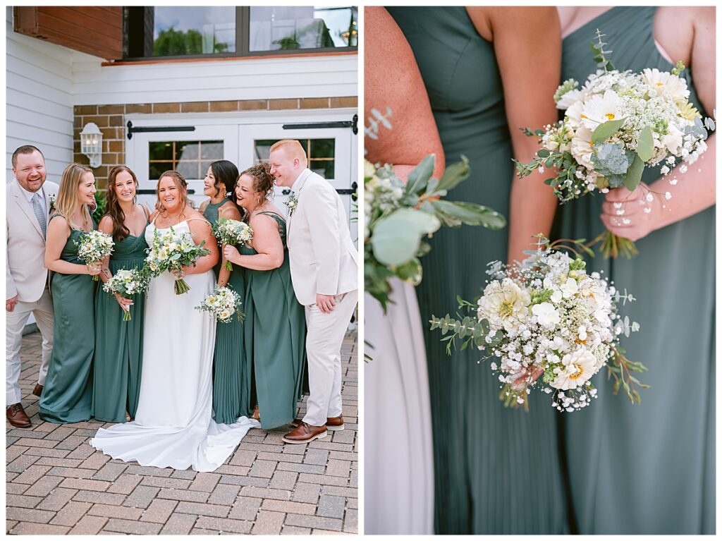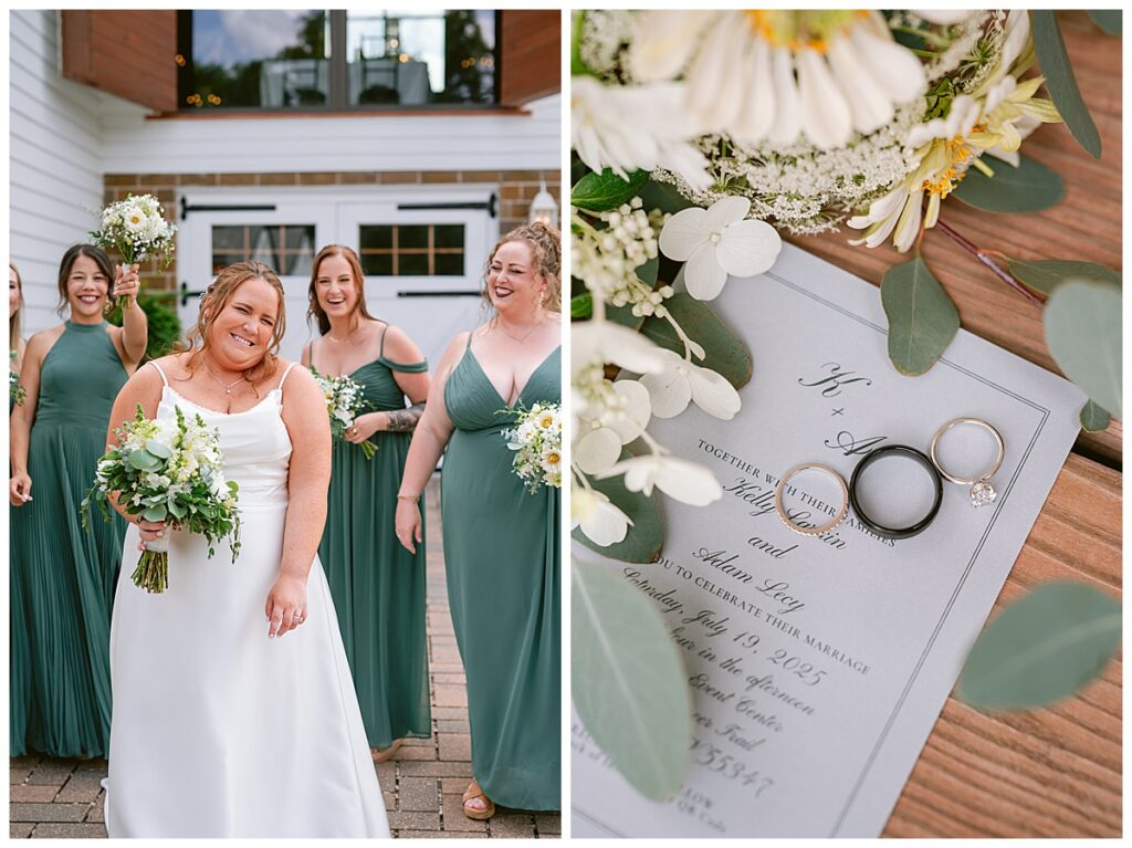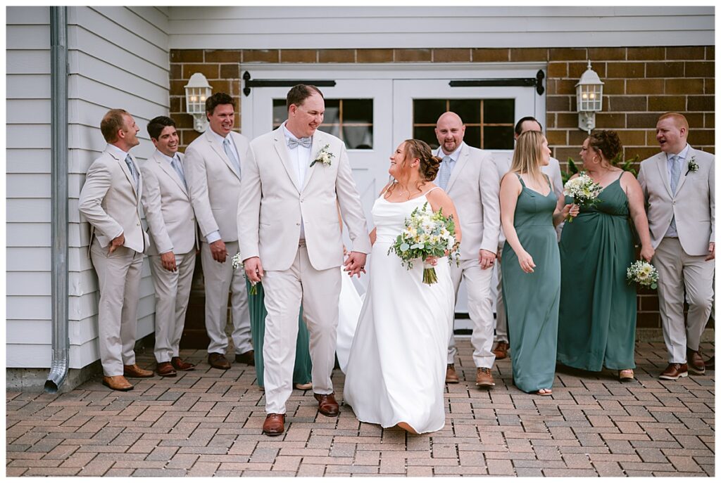 Kelly was radiant in her elegant Stella York gown, which she found at Luxe Bridal Couture. The dress suited her so perfectly; timeless, flattering, and full of joy. Her bridesmaids wore stunning sage dresses from Azazie, while the men looked sharp in suits from Men’s Wearhouse, adding a polished balance to the rustic surroundings.