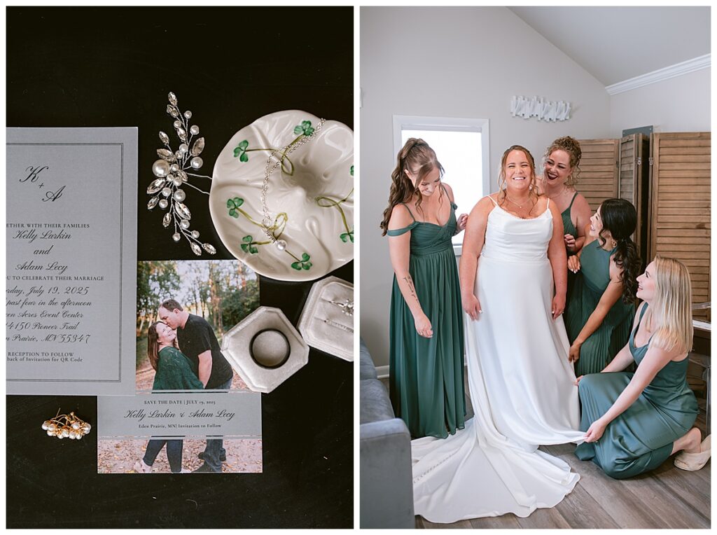 The morning of their wedding was everything Kelly hoped for; peaceful, joyful, and full of sweet anticipation. She got ready with Abbi Zwilling of Styled by Abbi, who handled both hair and makeup with such a calming presence. Shelly Olson also joined for hair styling, helping bring a soft, romantic look to life for Kelly and her bridal party.