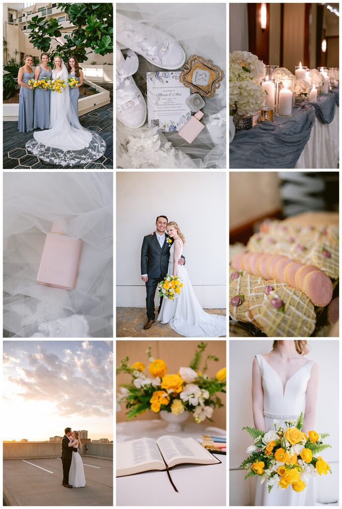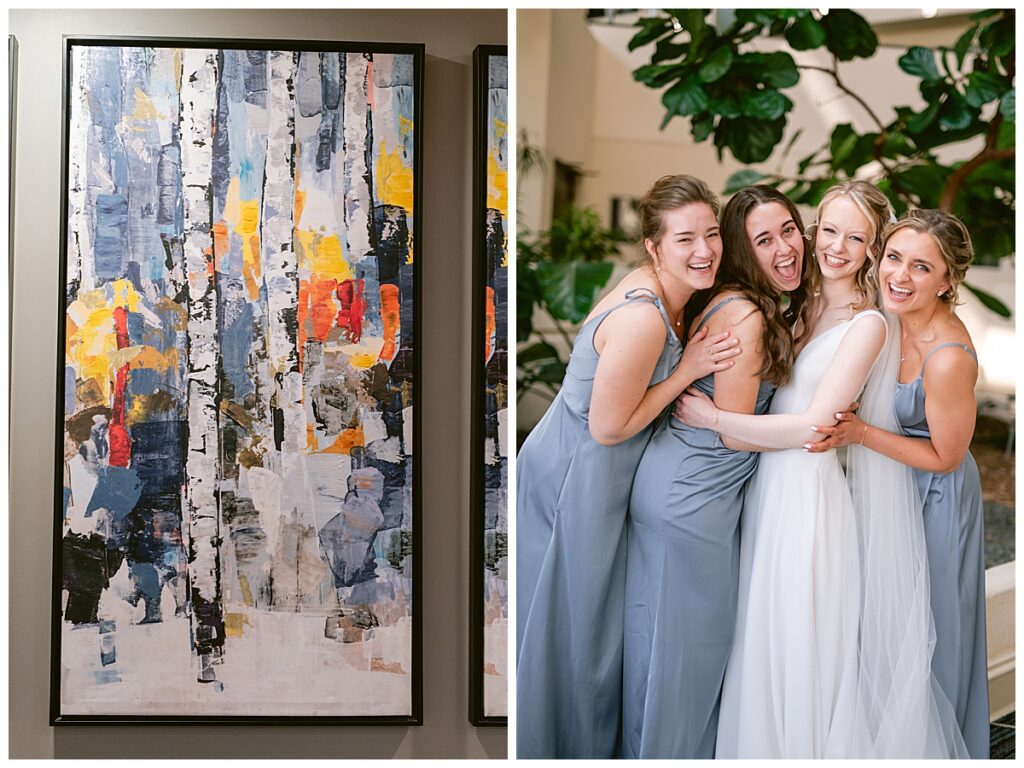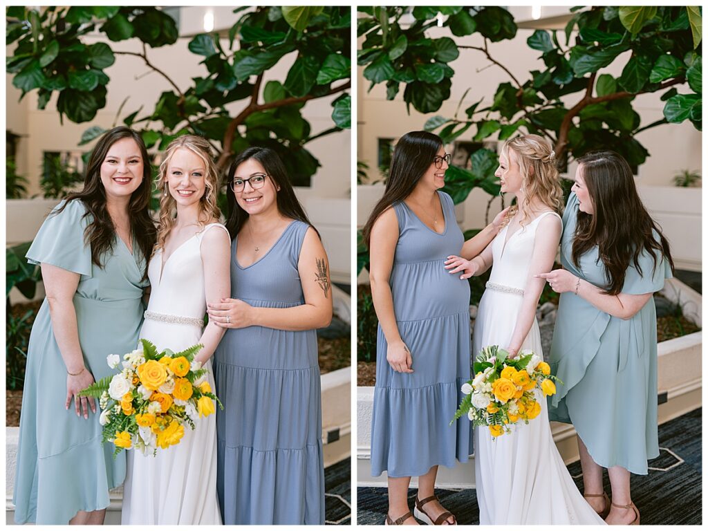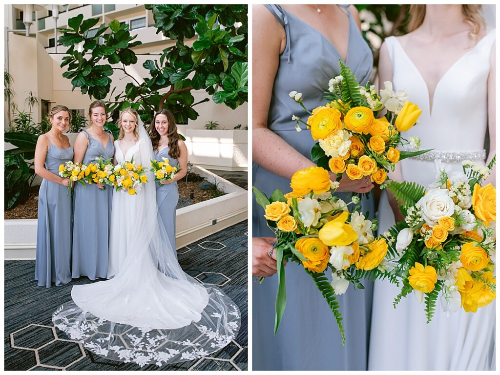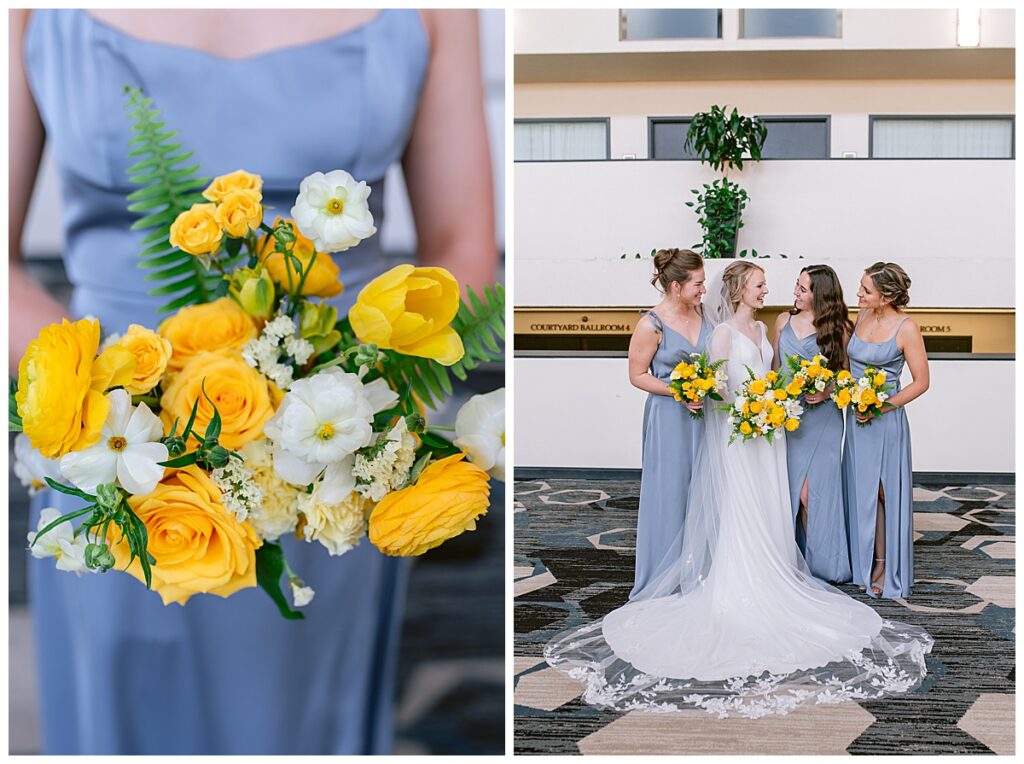 The day began with excitement as the bridesmaids giggled and rolled down the hallways in carts, creating unforgettable memories while the groomsmen toasted and cheered for Alex as he got ready. With the talented team from Taylor Marie Beauty taking care of hair and makeup, Maria and her bridesmaids were a vision of elegance and grace in their stunning dusty blue Azazie dresses.