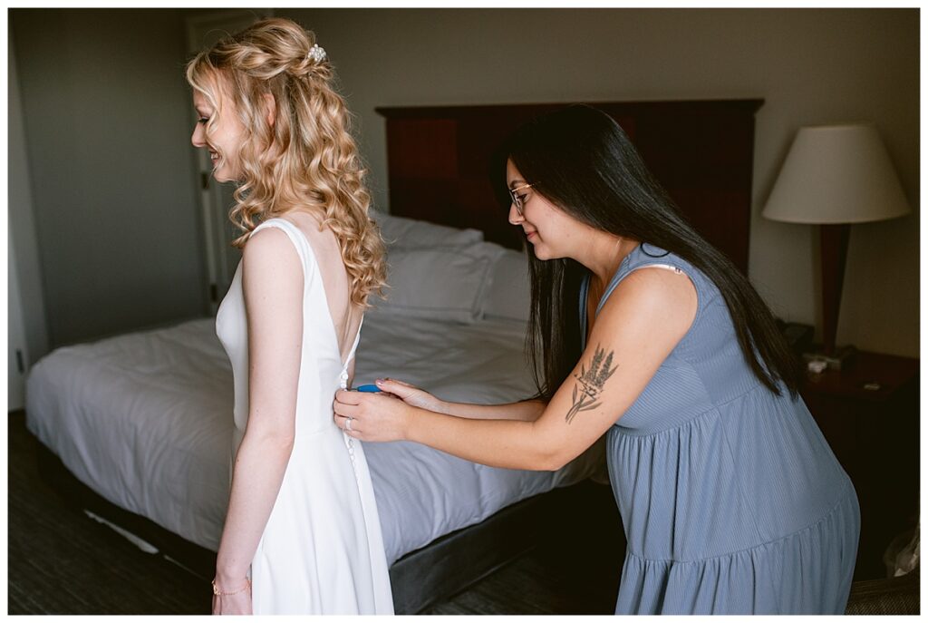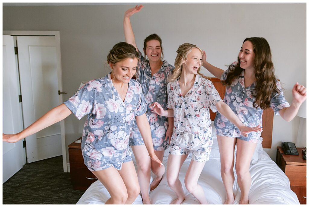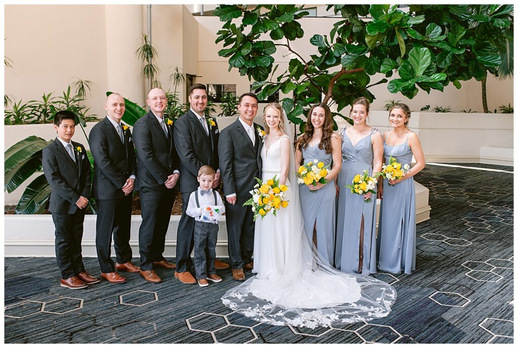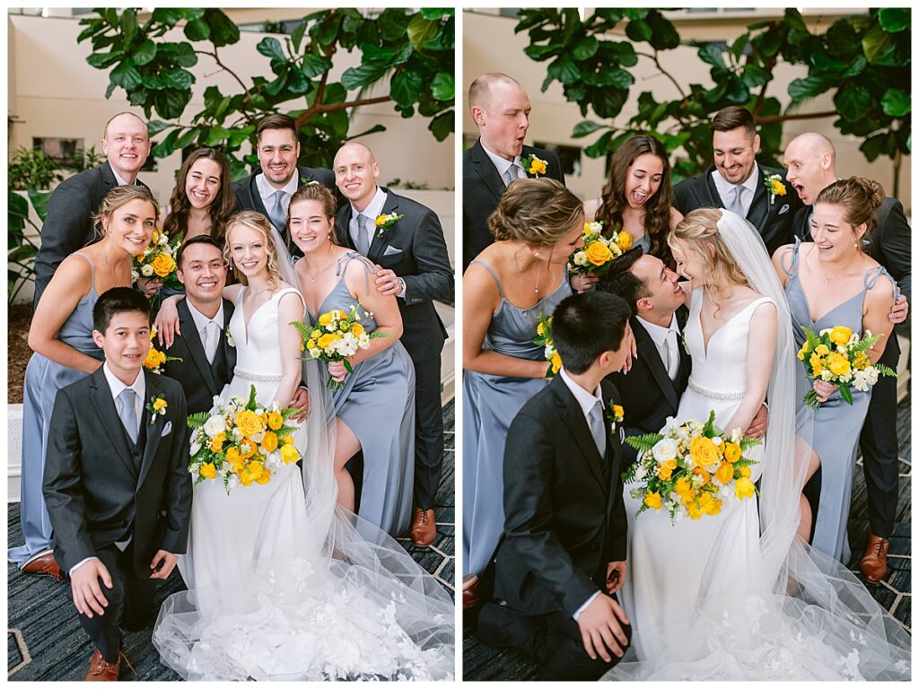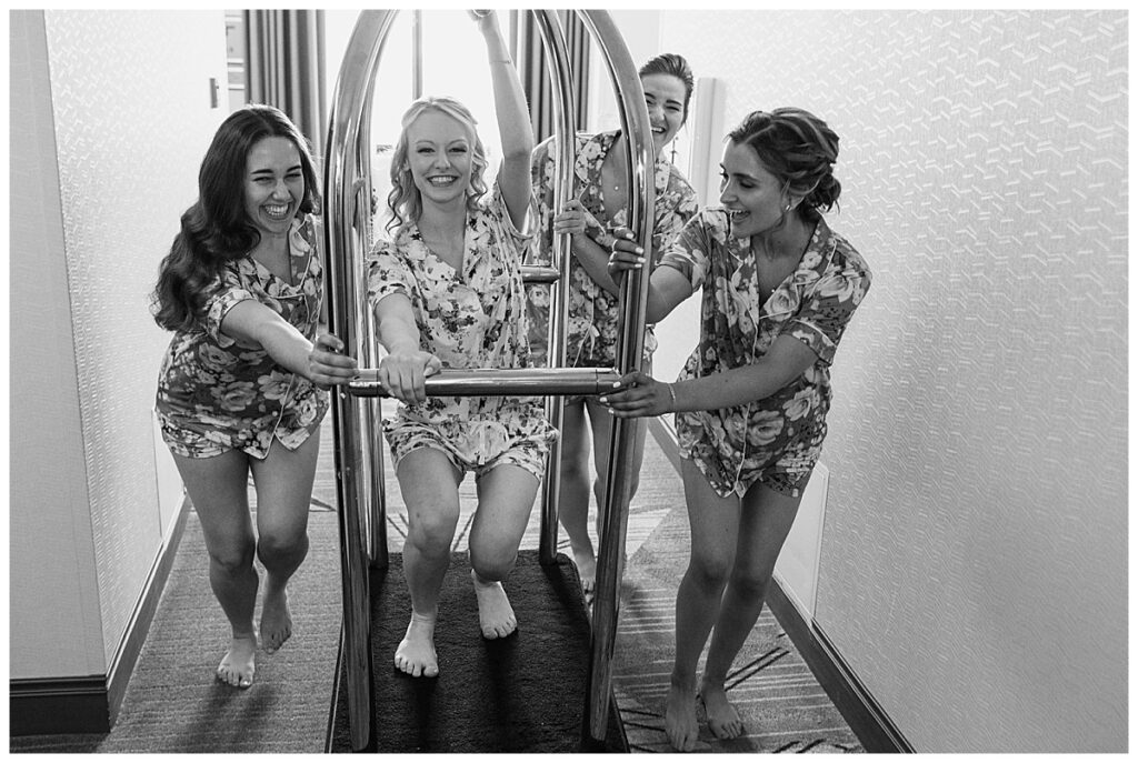 The day began with excitement as the bridesmaids giggled and rolled down the hallways in carts, creating unforgettable memories while the groomsmen toasted and cheered for Alex as he got ready. With the talented team from Taylor Marie Beauty taking care of hair and makeup, Maria and her bridesmaids were a vision of elegance and grace in their stunning dusty blue Azazie dresses.