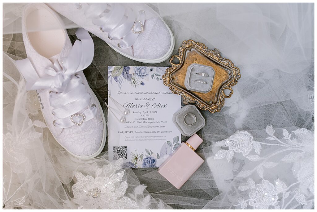 The first look moments were truly emotional. Maria was helped into her elegant dress purchased at the Wedding Shoppe in St. Paul by her mother, and then went to meet her father for their first look. As she stepped out to meet Alex, looking dapper in his dark suit from Knights of Chamber, the love and anticipation were palpable. Love, joy, and excitement radiated from the couple as they prepared to embark on their new chapter together.