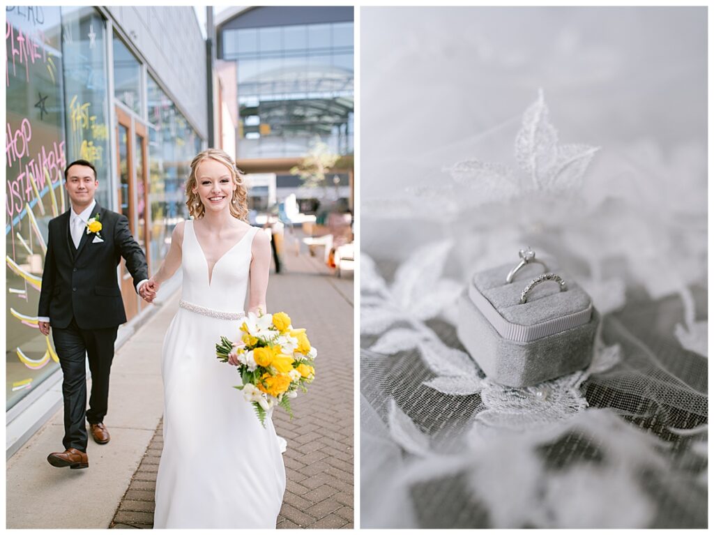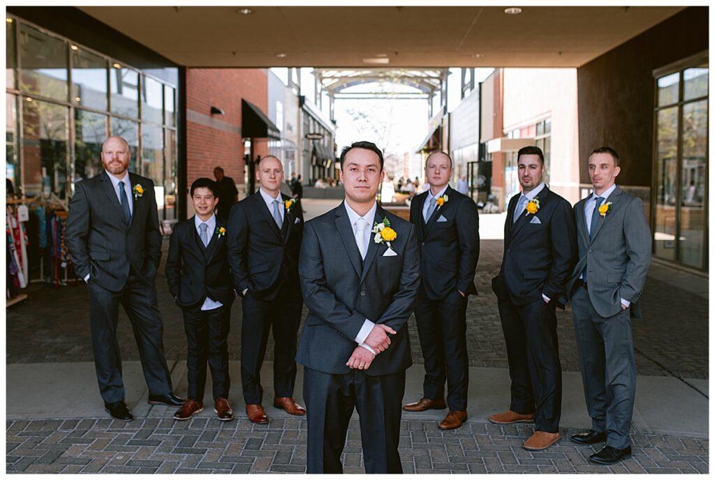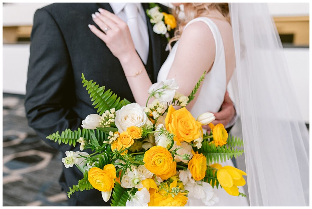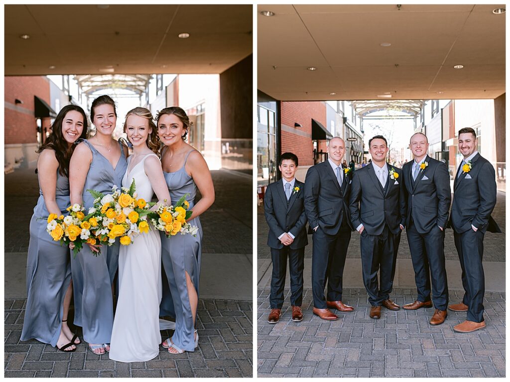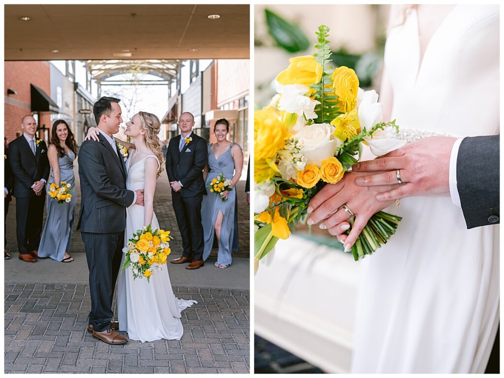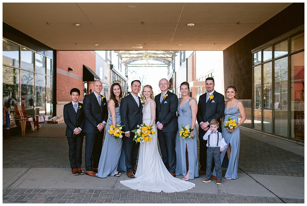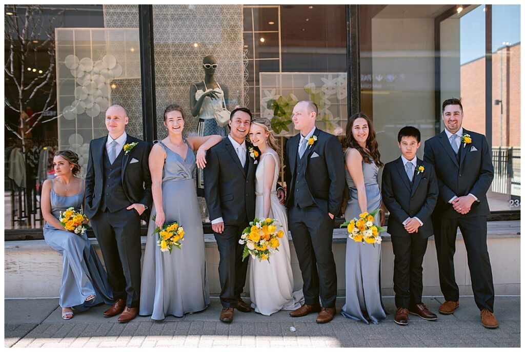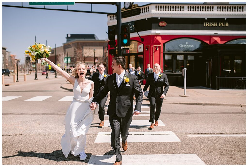 Along with the stunning wedding party, Maria and Alex took to the streets around the West End, where cheers and well-wishes followed them. We had so much fun enjoying the beautiful day and walking the streets of St. Louis Park where spring was truly in the air. Megan Charlton of Blooma by Design had crafted stunning spring floral arrangements with pops of yellow tulips, ferns, and white roses that added a touch of natural beauty to the urban setting.