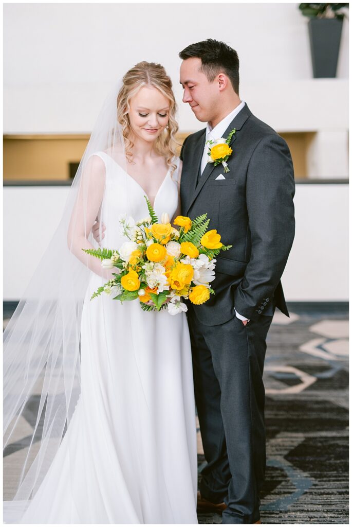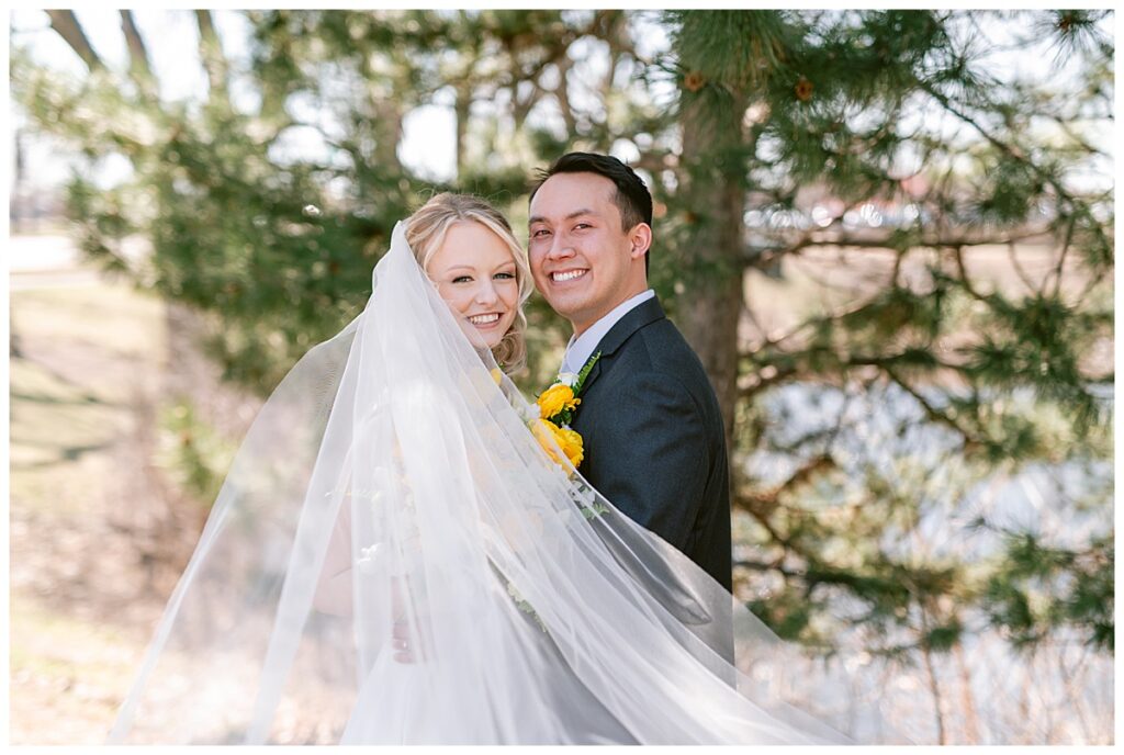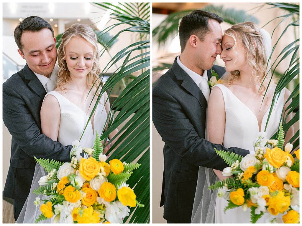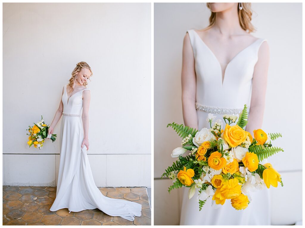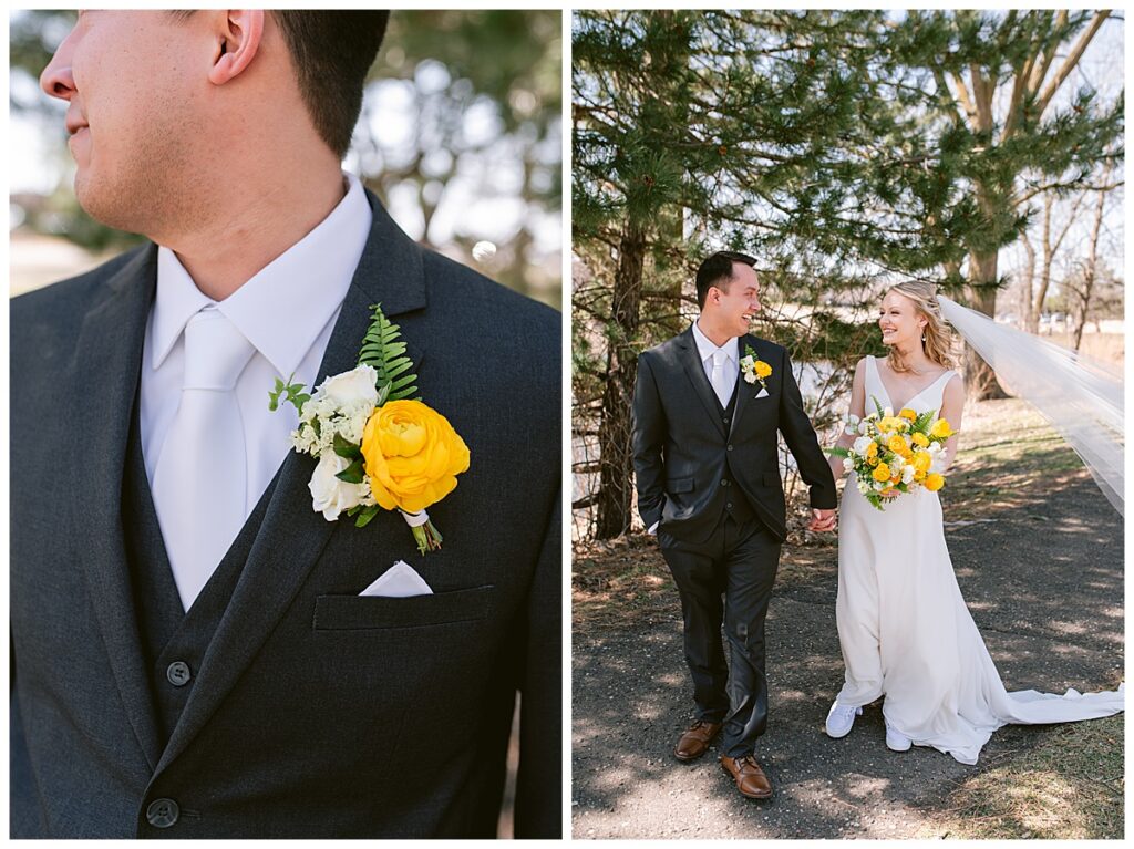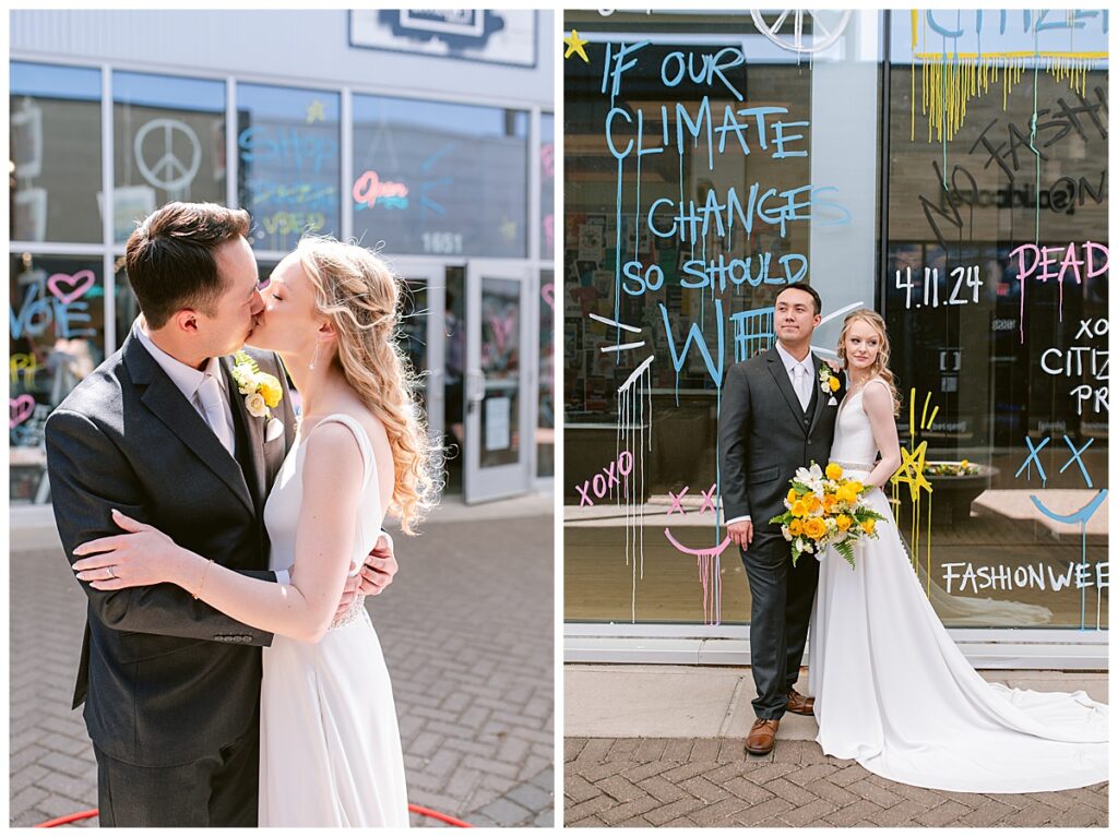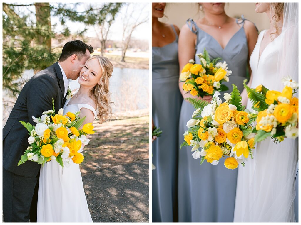 Along with the stunning wedding party, Maria and Alex took to the streets around the West End, where cheers and well-wishes followed them. We had so much fun enjoying the beautiful day and walking the streets of St. Louis Park where spring was truly in the air. Megan Charlton of Blooma by Design had crafted stunning spring floral arrangements with pops of yellow tulips, ferns, and white roses that added a touch of natural beauty to the urban setting.