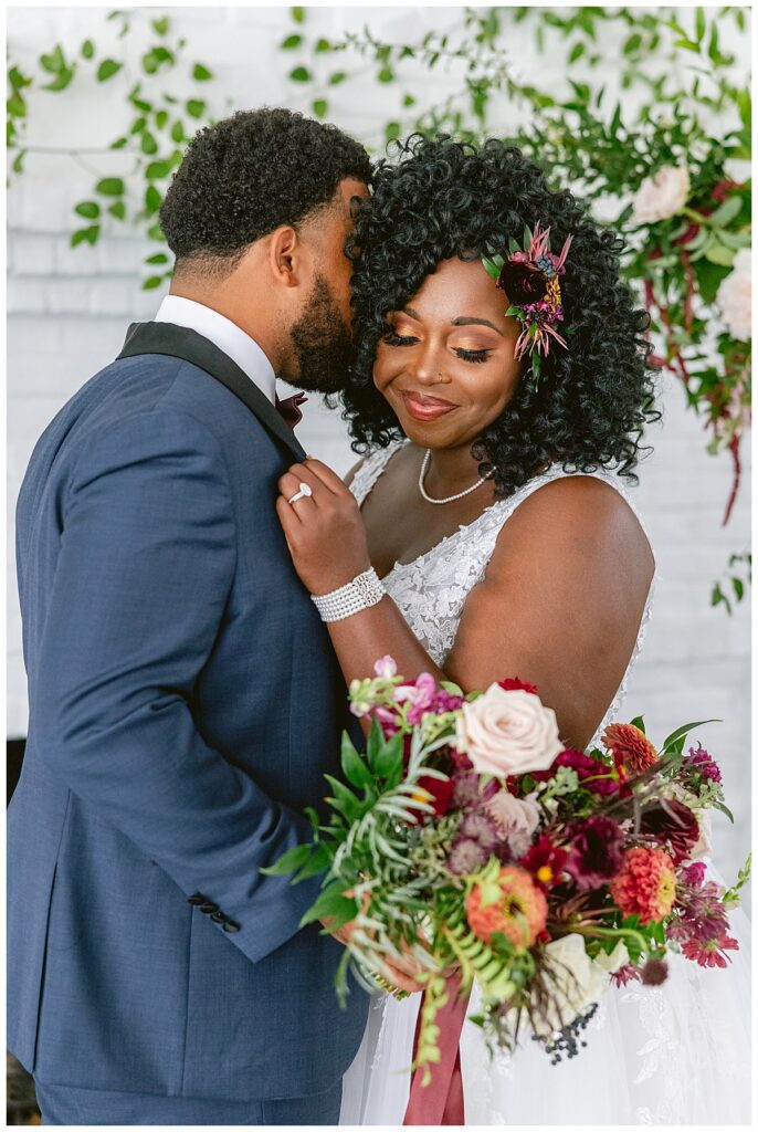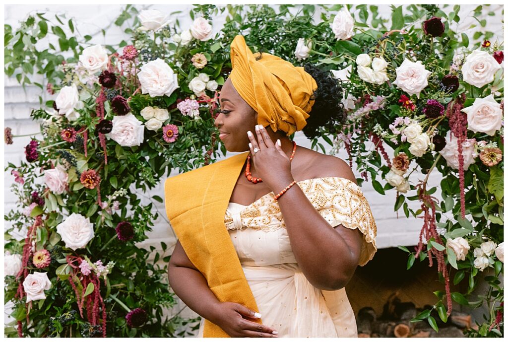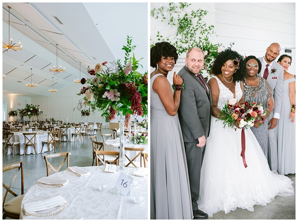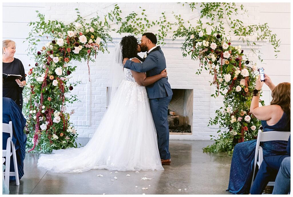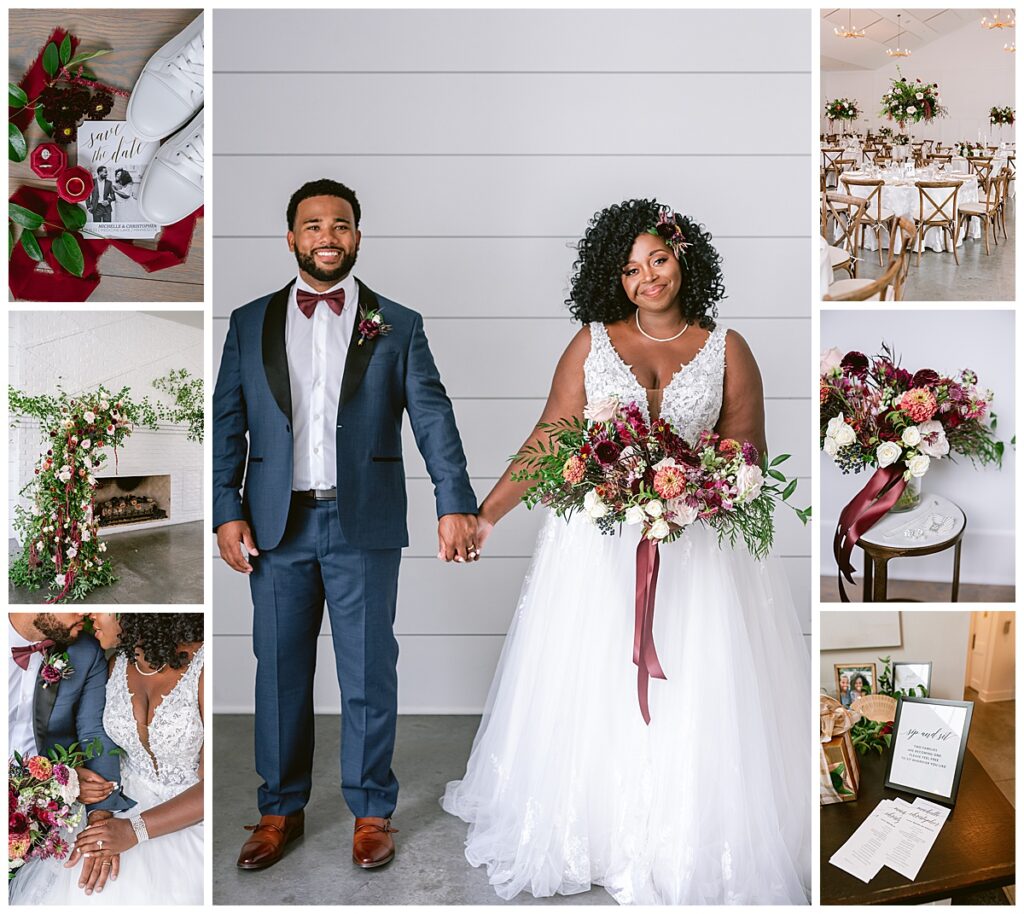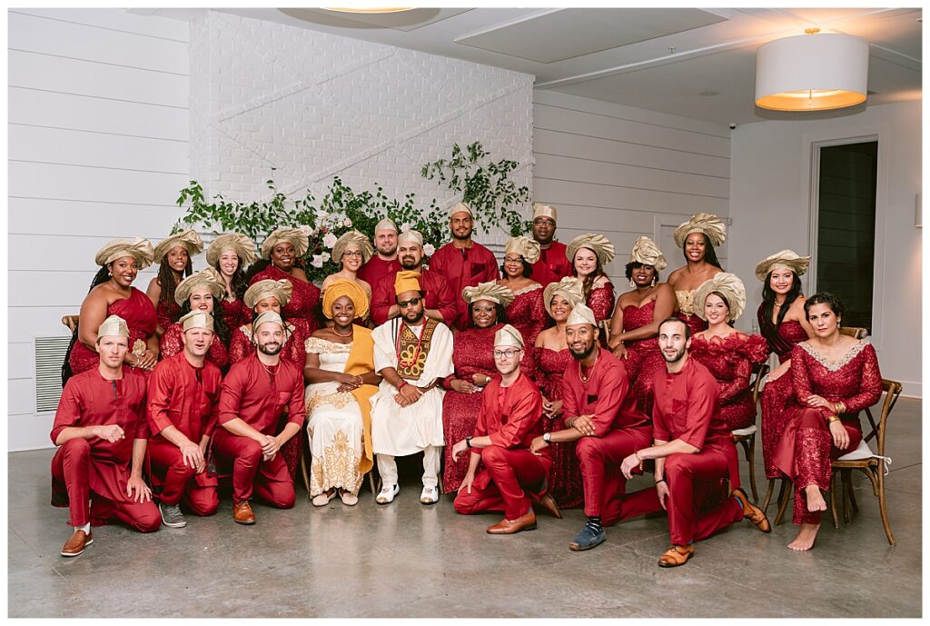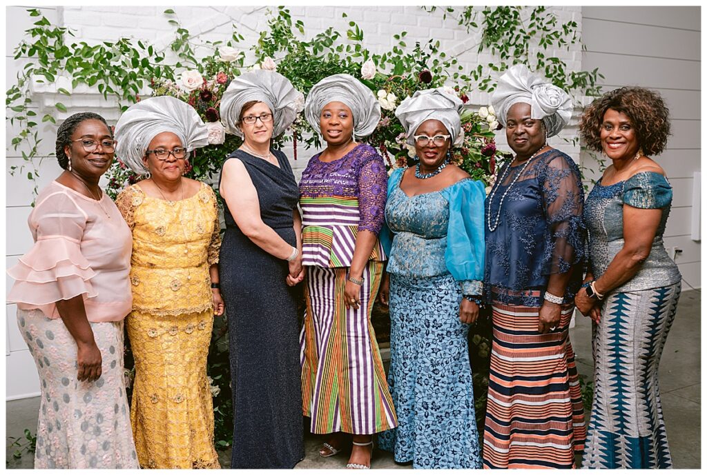 The day began with Michelle and her bridal party getting hair done at the Jai b Experience and Kahuah and May doing make up. They party arrived in the party bus provided by Renae’s Limo’s and then her mother helped Michelle into her beautiful bridal gown from Raffine’s Bridal. Michelle’s bridal party all wore grey attire with dresses purchased at David’s Bridal and Chris’ bridal party wore navy blue with the men purchasing suits from Men’s Warehouse. The incredible floral arrangements created by Wilderland Floral paired beautifully with the blues and grays and looked stunning in the Hutton House. Being that Michelle is a first generation American, she wanted to incorporate her Nigerian heritage into most of the day. One of those wonderful attributes was having a group of people (her Aso-Ebi tribe), a group of people who encourages you and is a big part of your life and also wears the same traditional dress, be a part of photos. After doing photos with family and wedding party in front of the beautiful floral arch, Chris and Michelle chose to be married indoors. The ceremony was rich with family, love and honor for one another. After exchanging rings from Brilliant Earth and Cartier in front of their guests, Michelle and Chris were pronounced husband and wife and retreated to a room to exchange their vows to one another privately.