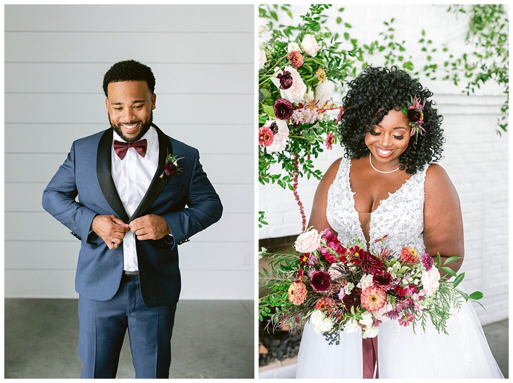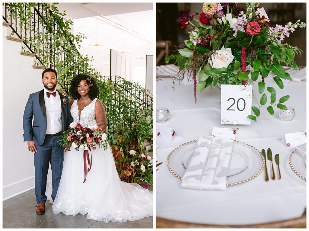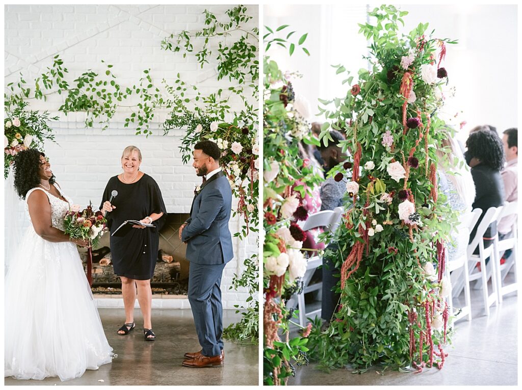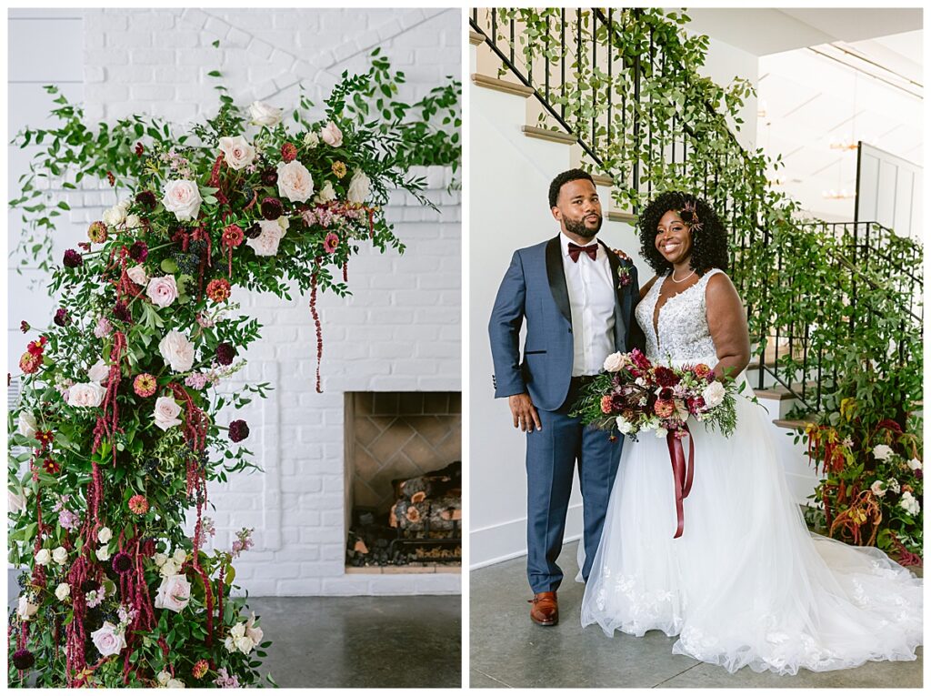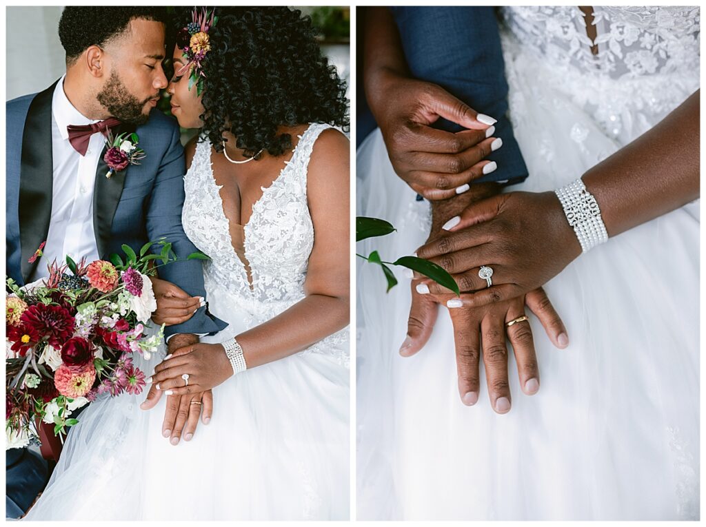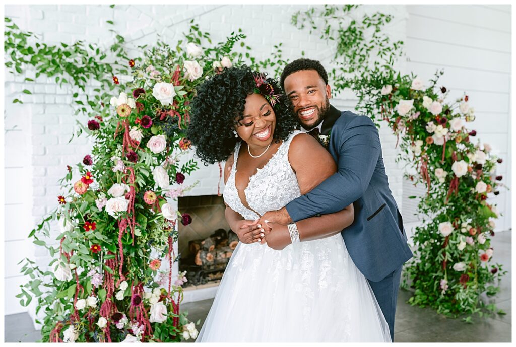 The day began with Michelle and her bridal party getting hair done at the Jai b Experience and Kahuah and May doing make up. They party arrived in the party bus provided by Renae’s Limo’s and then her mother helped Michelle into her beautiful bridal gown from Raffine’s Bridal. Michelle’s bridal party all wore grey attire with dresses purchased at David’s Bridal and Chris’ bridal party wore navy blue with the men purchasing suits from Men’s Warehouse. The incredible floral arrangements created by Wilderland Floral paired beautifully with the blues and grays and looked stunning in the Hutton House. Being that Michelle is a first generation American, she wanted to incorporate her Nigerian heritage into most of the day. One of those wonderful attributes was having a group of people (her Aso-Ebi tribe), a group of people who encourages you and is a big part of your life and also wears the same traditional dress, be a part of photos. After doing photos with family and wedding party in front of the beautiful floral arch, Chris and Michelle chose to be married indoors. The ceremony was rich with family, love and honor for one another. After exchanging rings from Brilliant Earth and Cartier in front of their guests, Michelle and Chris were pronounced husband and wife and retreated to a room to exchange their vows to one another privately.