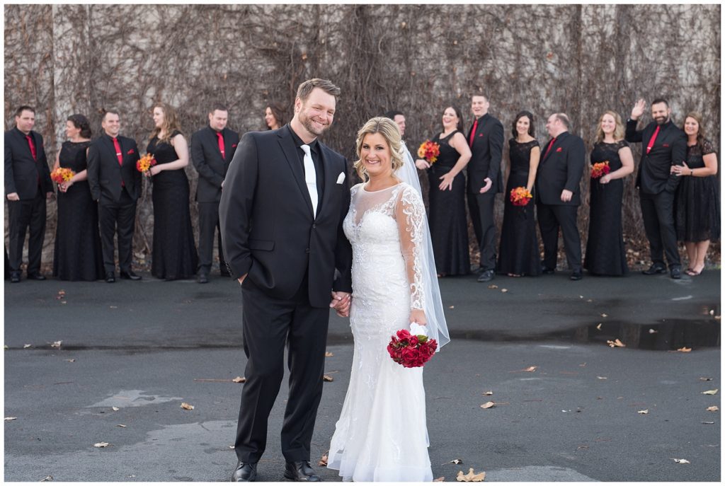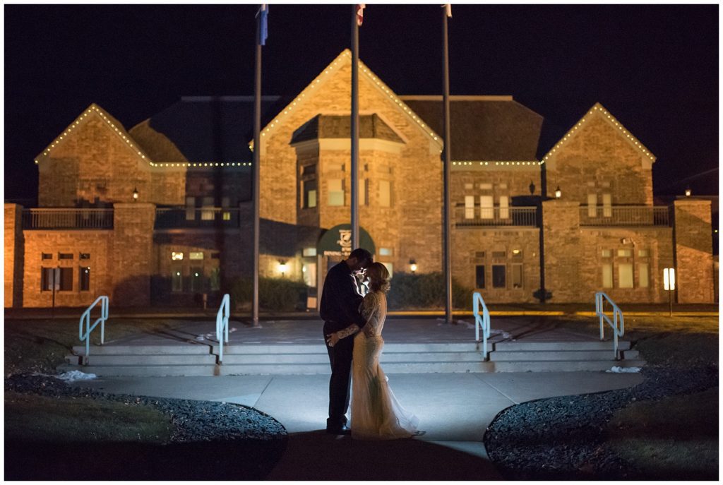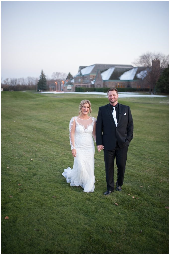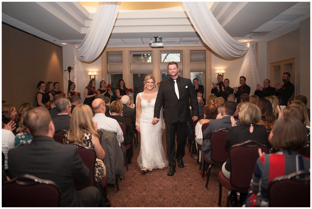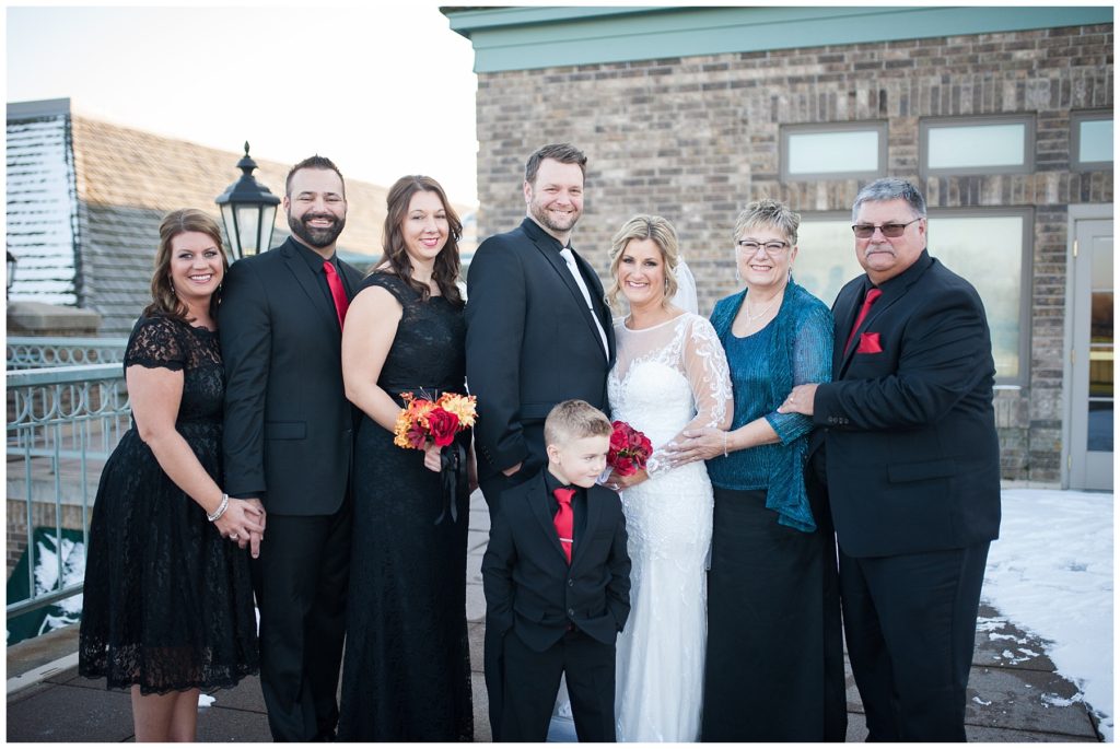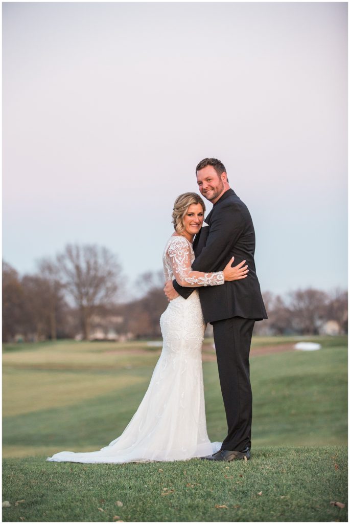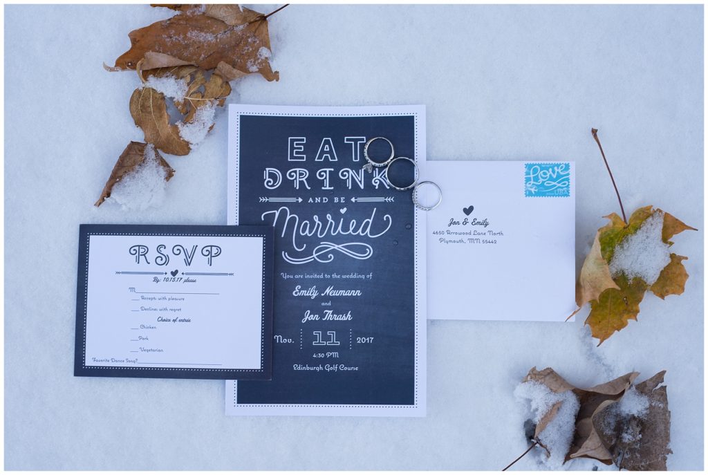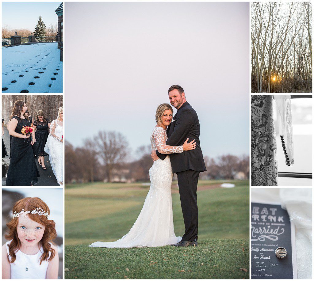 Their November wedding day was filled with friends and family who joyfully celebrated with them at Edinburgh Golf Course in Minneapolis. Emily’s elegant long sleeve Mori Lee lace gown from the Wedding Shoppe was paired perfectly with the elegant black dresses her bridesmaids wore from Diamond Bride. The fall blooms from I Do Florals were a perfect pop of color against the dresses. Natassja Larkin from CaJah Salon created the most romantic updo for Emily, while make-up artist Merry White from Salon Junallo added to Emily’s natural beauty. Shane Co. provided the most beautiful solitaire and setting for Emily’s ring as well as added more bling with her stackable bands. John and his groomsmen wore black suits and shirts from Macy’s with a pop of red in their ties. Vista Print created the invitations and stationary while Buttercream brought in the most amazing cake. Guests energetically danced the night away with music from Instant Request and there was even a moment where I thought Michael Jackson might have reappeared 🙂 .
