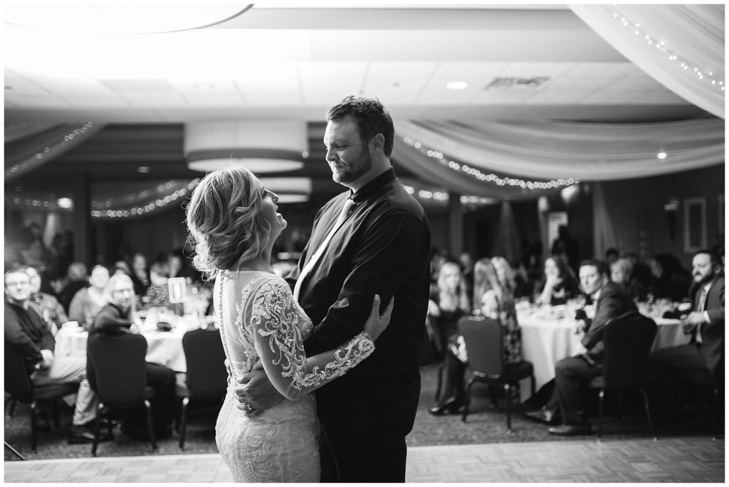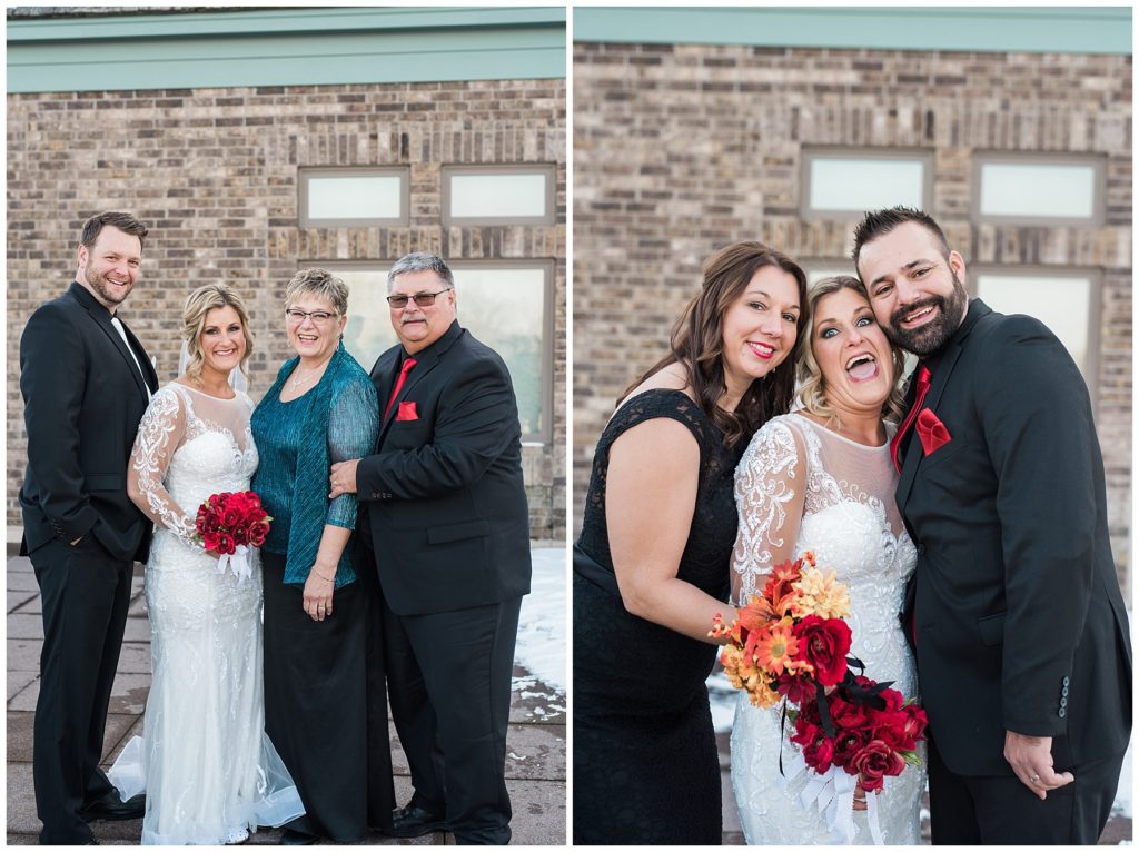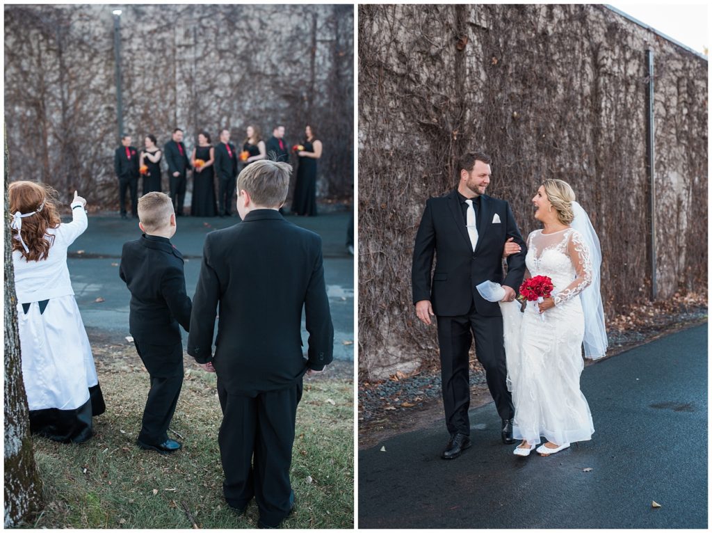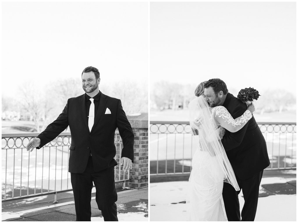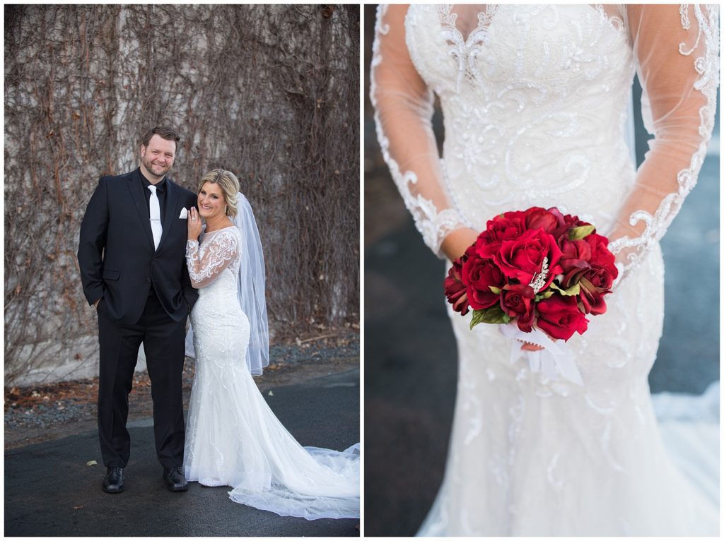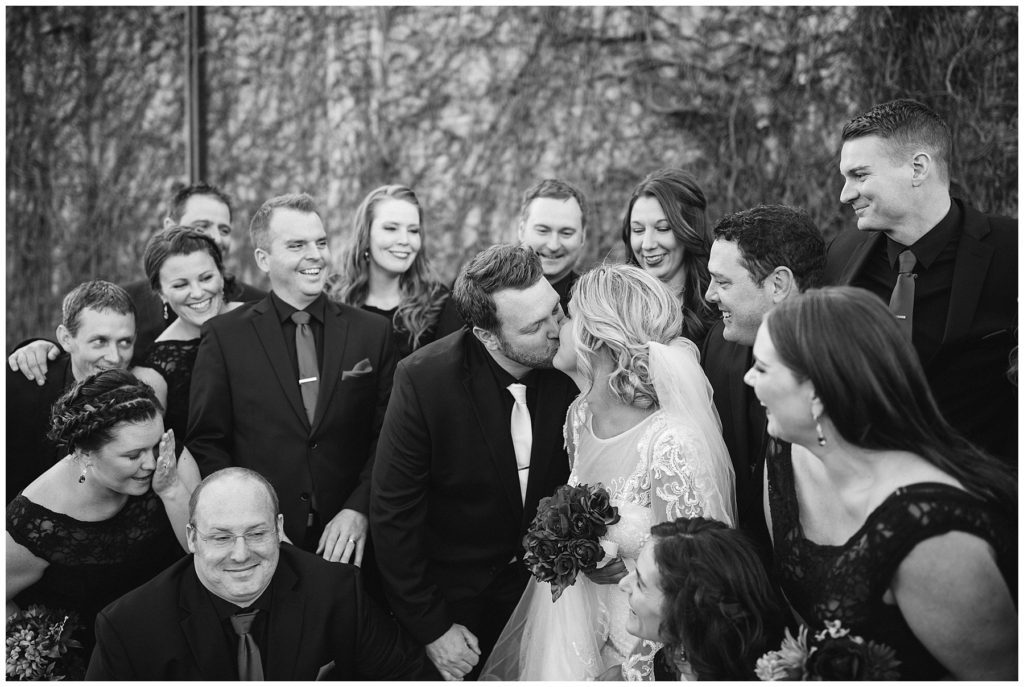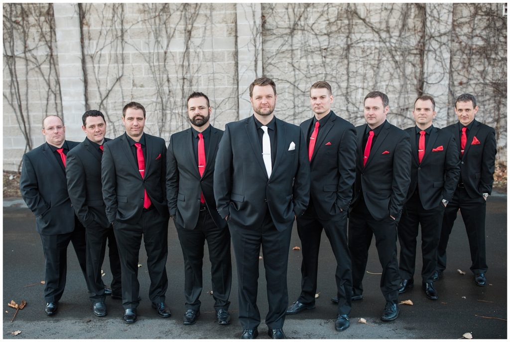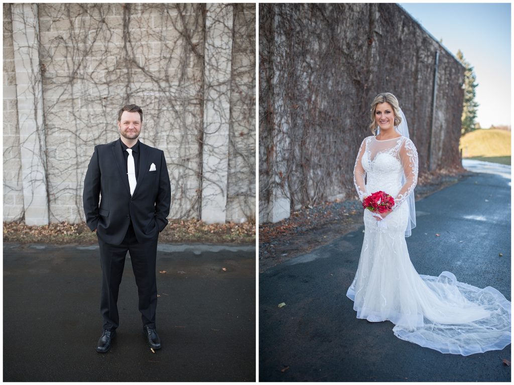 Their November wedding day was filled with friends and family who joyfully celebrated with them at Edinburgh Golf Course in Minneapolis. Emily’s elegant long sleeve Mori Lee lace gown from the Wedding Shoppe was paired perfectly with the elegant black dresses her bridesmaids wore from Diamond Bride. The fall blooms from I Do Florals were a perfect pop of color against the dresses. Natassja Larkin from CaJah Salon created the most romantic updo for Emily, while make-up artist Merry White from Salon Junallo added to Emily’s natural beauty. Shane Co. provided the most beautiful solitaire and setting for Emily’s ring as well as added more bling with her stackable bands. John and his groomsmen wore black suits and shirts from Macy’s with a pop of red in their ties. Vista Print created the invitations and stationary while Buttercream brought in the most amazing cake. Guests energetically danced the night away with music from Instant Request and there was even a moment where I thought Michael Jackson might have reappeared 🙂 .