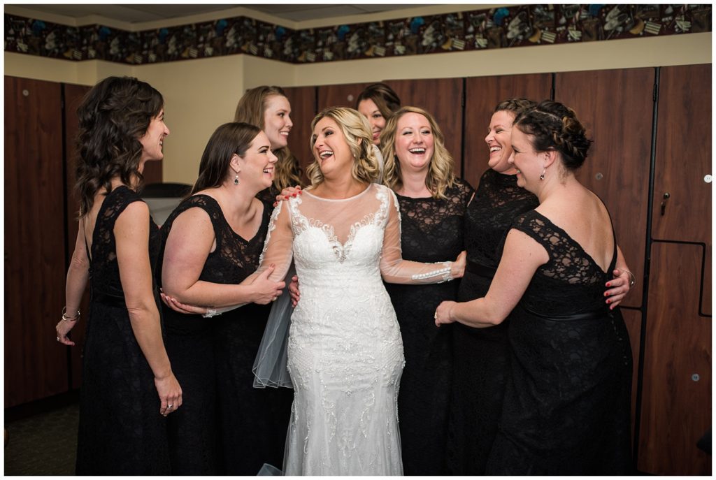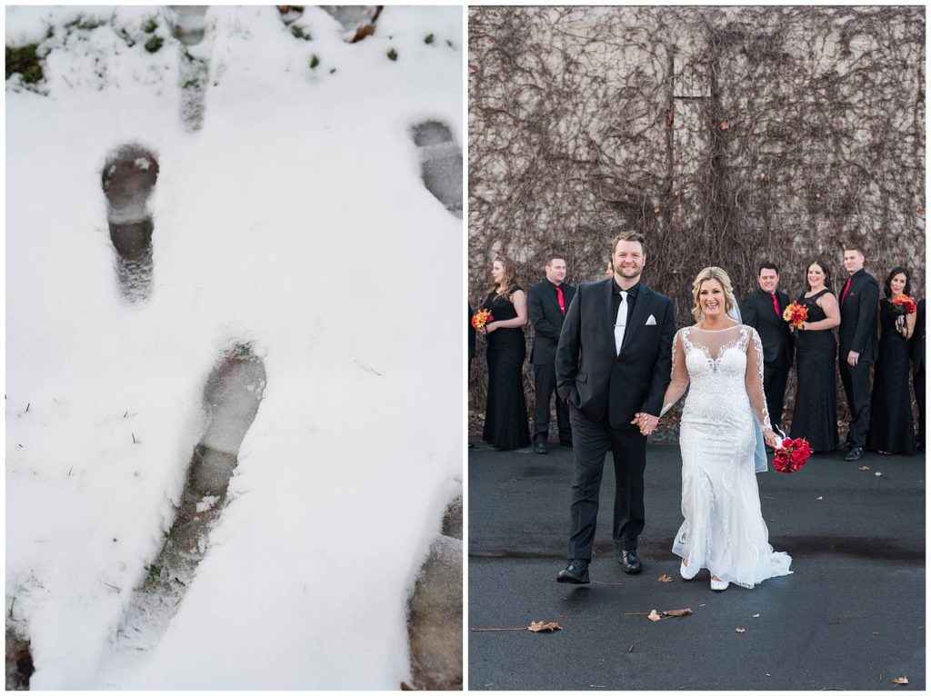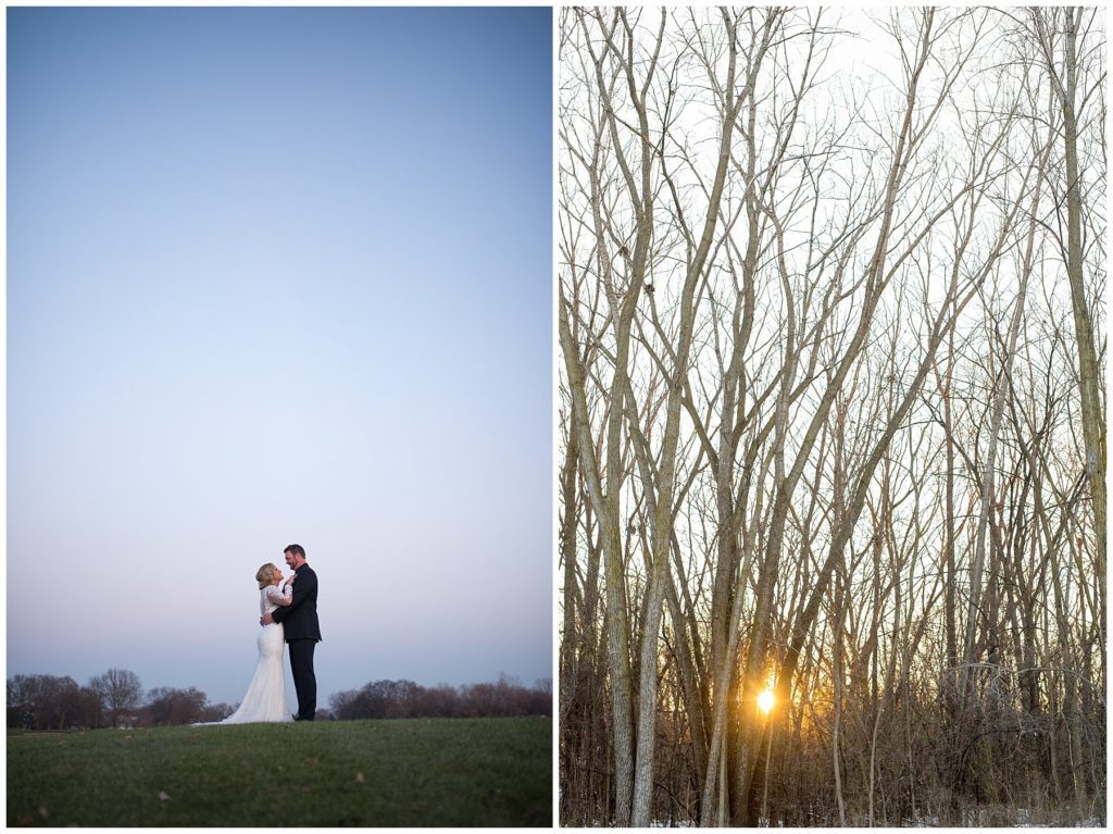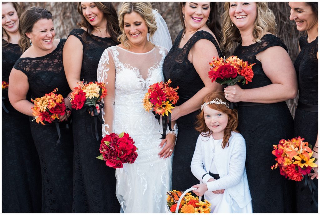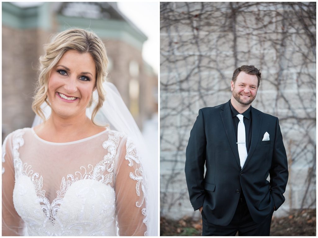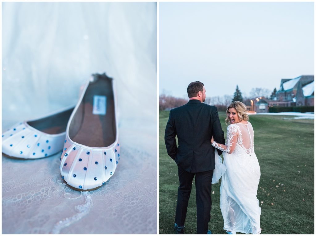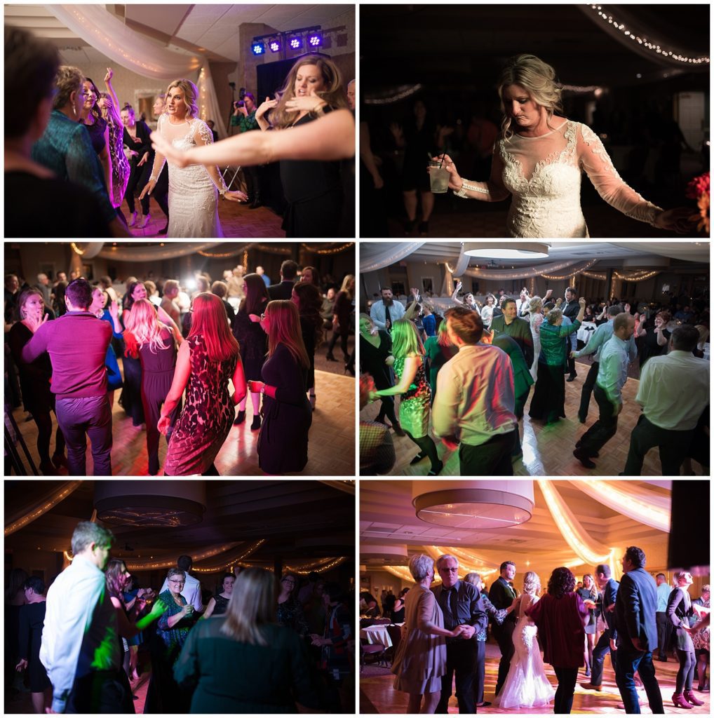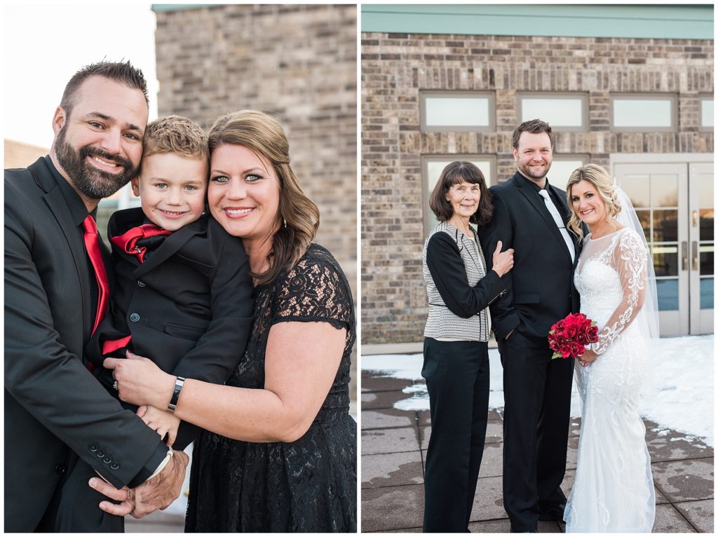 Their November wedding day was filled with friends and family who joyfully celebrated with them at Edinburgh Golf Course in Minneapolis. Emily’s elegant long sleeve Mori Lee lace gown from the Wedding Shoppe was paired perfectly with the elegant black dresses her bridesmaids wore from Diamond Bride. The fall blooms from I Do Florals were a perfect pop of color against the dresses. Natassja Larkin from CaJah Salon created the most romantic updo for Emily, while make-up artist Merry White from Salon Junallo added to Emily’s natural beauty. Shane Co. provided the most beautiful solitaire and setting for Emily’s ring as well as added more bling with her stackable bands. John and his groomsmen wore black suits and shirts from Macy’s with a pop of red in their ties. Vista Print created the invitations and stationary while Buttercream brought in the most amazing cake. Guests energetically danced the night away with music from Instant Request and there was even a moment where I thought Michael Jackson might have reappeared 🙂 .