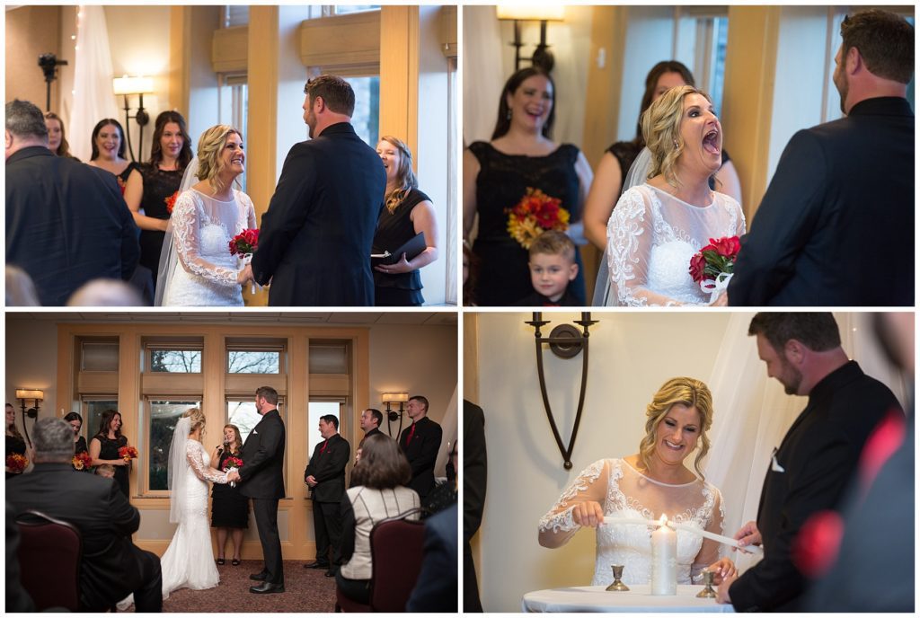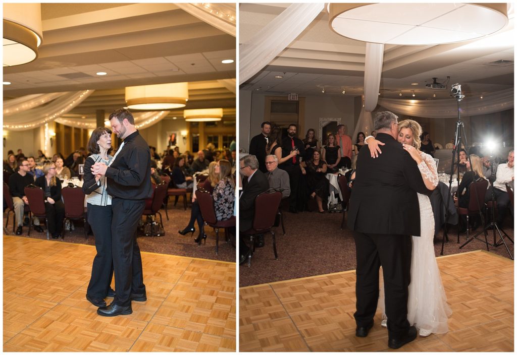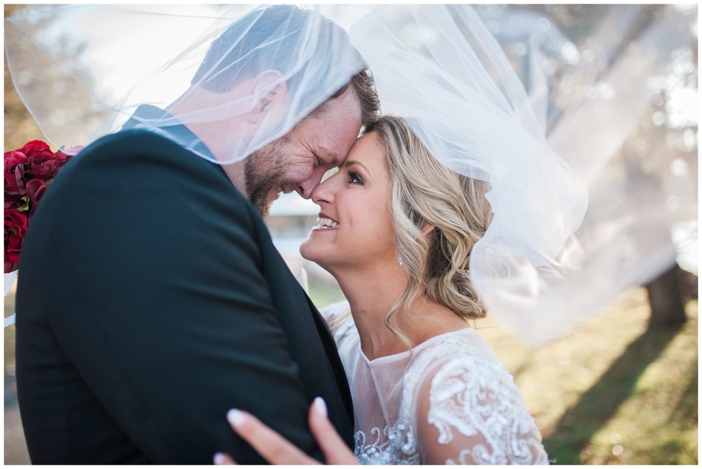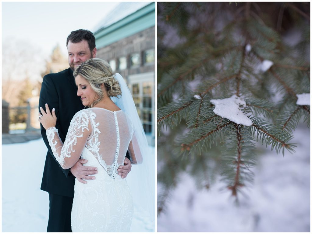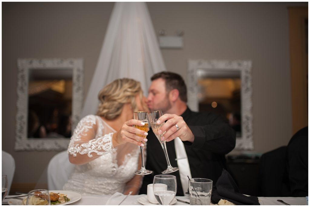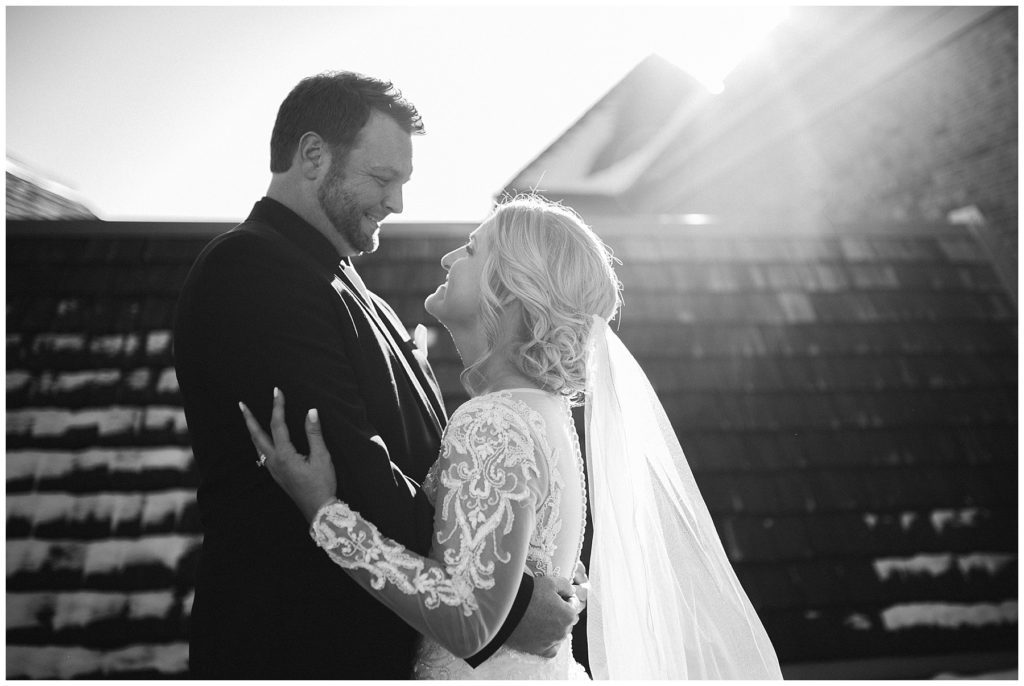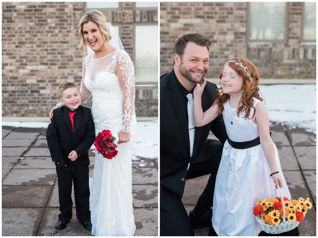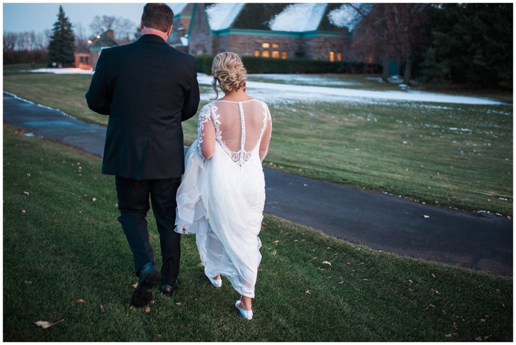 Their November wedding day was filled with friends and family who joyfully celebrated with them at Edinburgh Golf Course in Minneapolis. Emily’s elegant long sleeve Mori Lee lace gown from the Wedding Shoppe was paired perfectly with the elegant black dresses her bridesmaids wore from Diamond Bride. The fall blooms from I Do Florals were a perfect pop of color against the dresses. Natassja Larkin from CaJah Salon created the most romantic updo for Emily, while make-up artist Merry White from Salon Junallo added to Emily’s natural beauty. Shane Co. provided the most beautiful solitaire and setting for Emily’s ring as well as added more bling with her stackable bands. John and his groomsmen wore black suits and shirts from Macy’s with a pop of red in their ties. Vista Print created the invitations and stationary while Buttercream brought in the most amazing cake. Guests energetically danced the night away with music from Instant Request and there was even a moment where I thought Michael Jackson might have reappeared 🙂 .