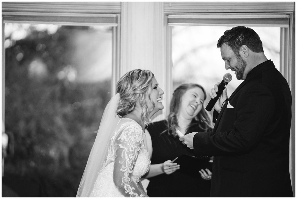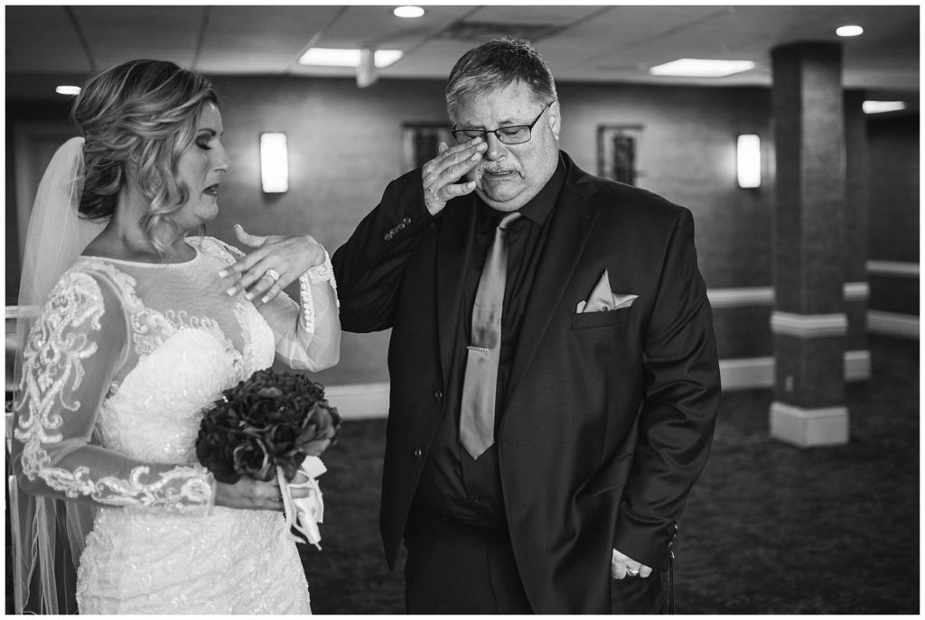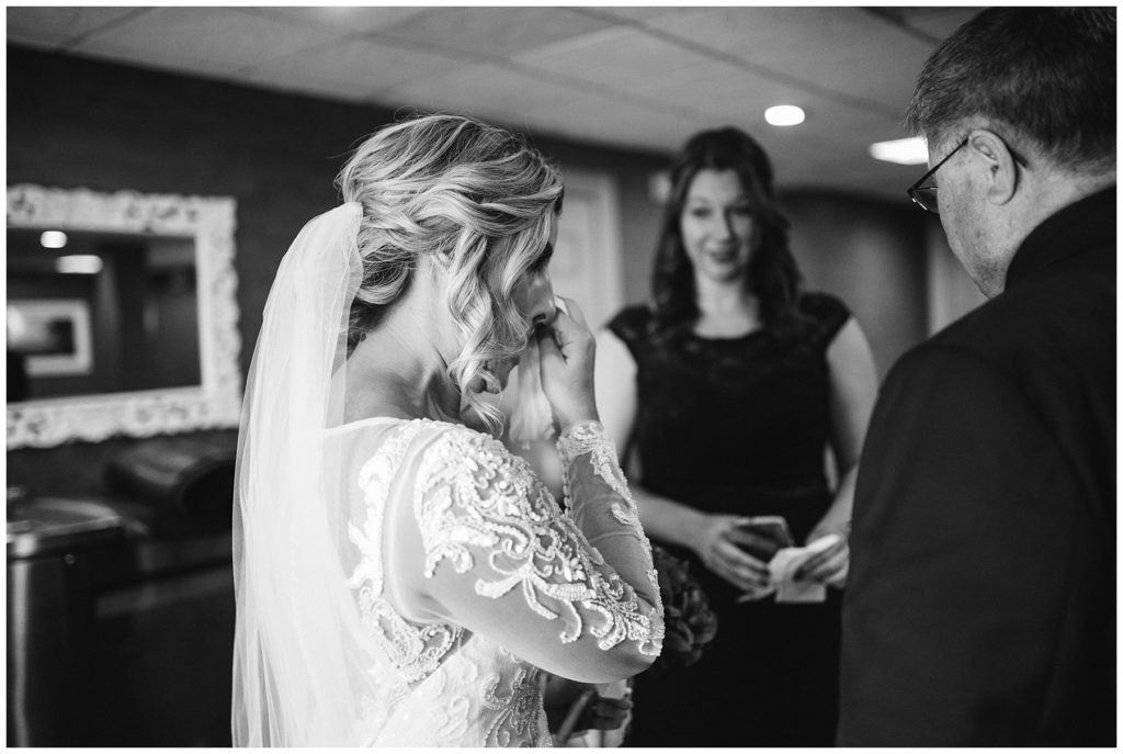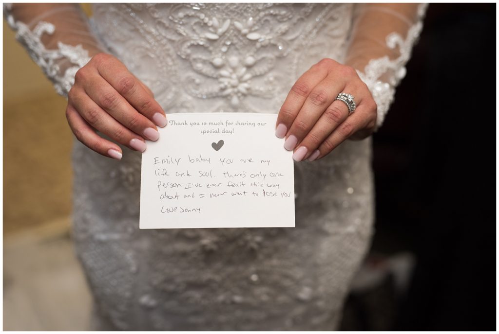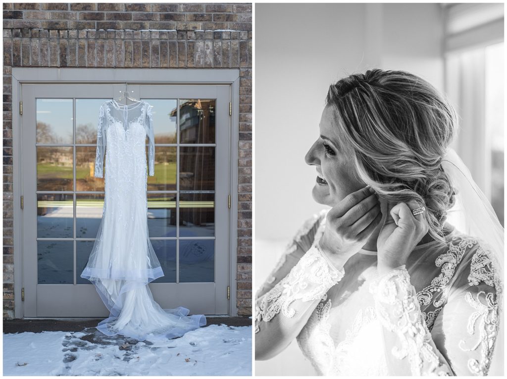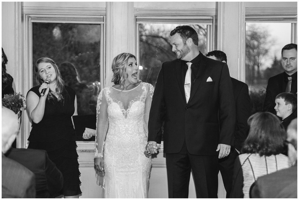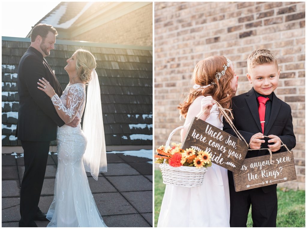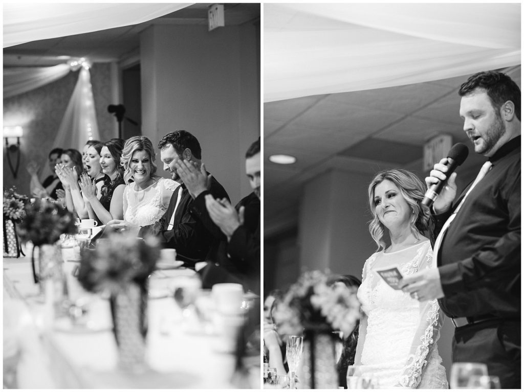 Their November wedding day was filled with friends and family who joyfully celebrated with them at Edinburgh Golf Course in Minneapolis. Emily’s elegant long sleeve Mori Lee lace gown from the Wedding Shoppe was paired perfectly with the elegant black dresses her bridesmaids wore from Diamond Bride. The fall blooms from I Do Florals were a perfect pop of color against the dresses. Natassja Larkin from CaJah Salon created the most romantic updo for Emily, while make-up artist Merry White from Salon Junallo added to Emily’s natural beauty. Shane Co. provided the most beautiful solitaire and setting for Emily’s ring as well as added more bling with her stackable bands. John and his groomsmen wore black suits and shirts from Macy’s with a pop of red in their ties. Vista Print created the invitations and stationary while Buttercream brought in the most amazing cake. Guests energetically danced the night away with music from Instant Request and there was even a moment where I thought Michael Jackson might have reappeared 🙂 .