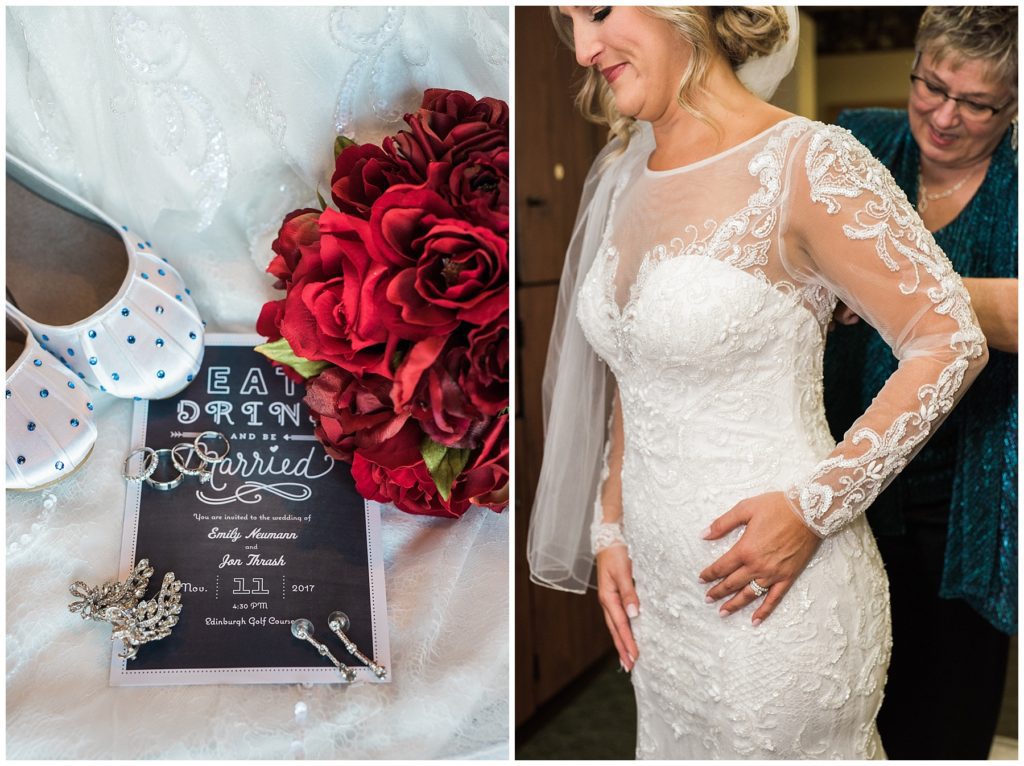 Ceremony and Reception:: Edinburgh Golf Course //Hair:: Natassja Larkin from CaJah Salon // Make-Up::Merry White from Salon Junallo// Caterer:: Lancer Catering// Florist:: I Do Florals // Wedding Dress:: Mori Lee purchased at the Wedding Shoppe// Bridesmaids Dresses:: Diamond Bride // Men’s Ware:: Macy’s// Rings:: Shane Co.// Stationery:: Vista Print // DJ:: Instant Request // Cake:: Buttercream // Video:: Chuck Goldman // Second Shooter:: Crystal Hedberg