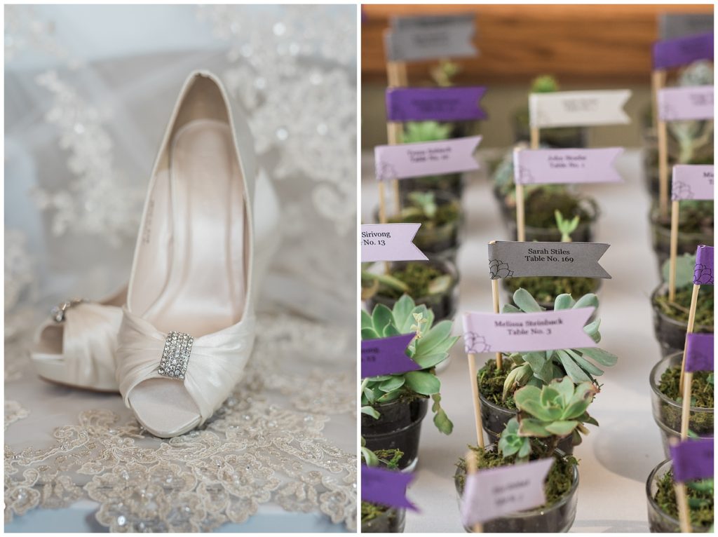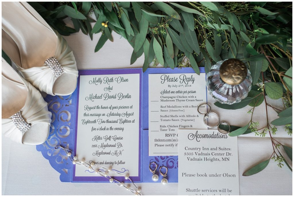 Shane Co. provided the a beautiful diamond for Molly’s diamond ring, and her amazing shoes from David’s Bridal.  Mike and his groomsmen wore classic grey suits from with a pop of purple in their ties. Get Krafty with it, an Etsy shoppe, created the intricate wedding invitations and stationary.