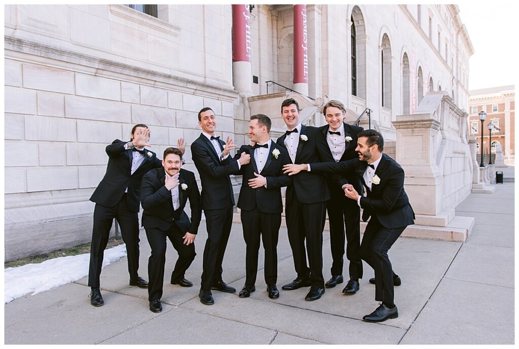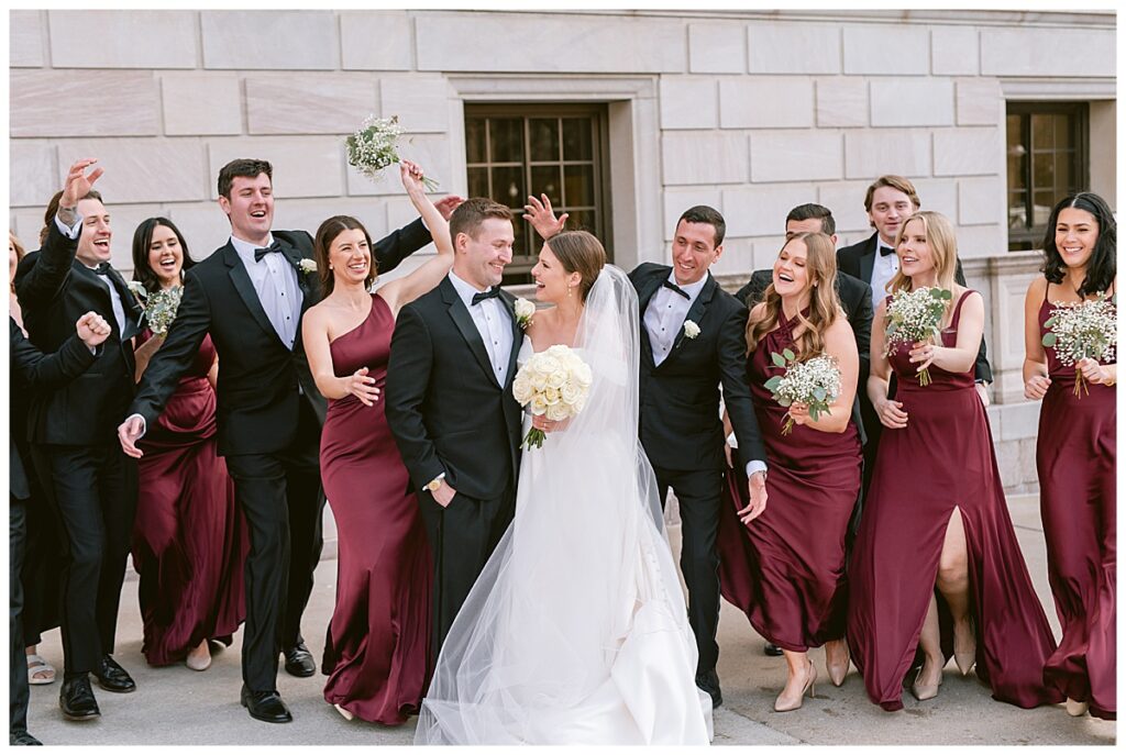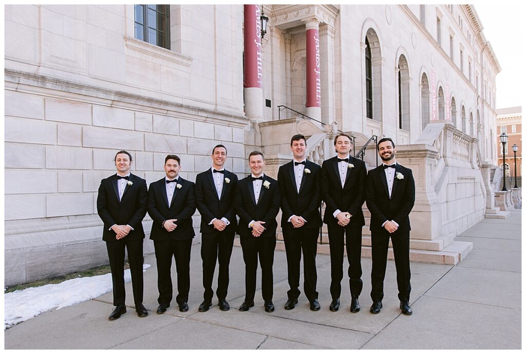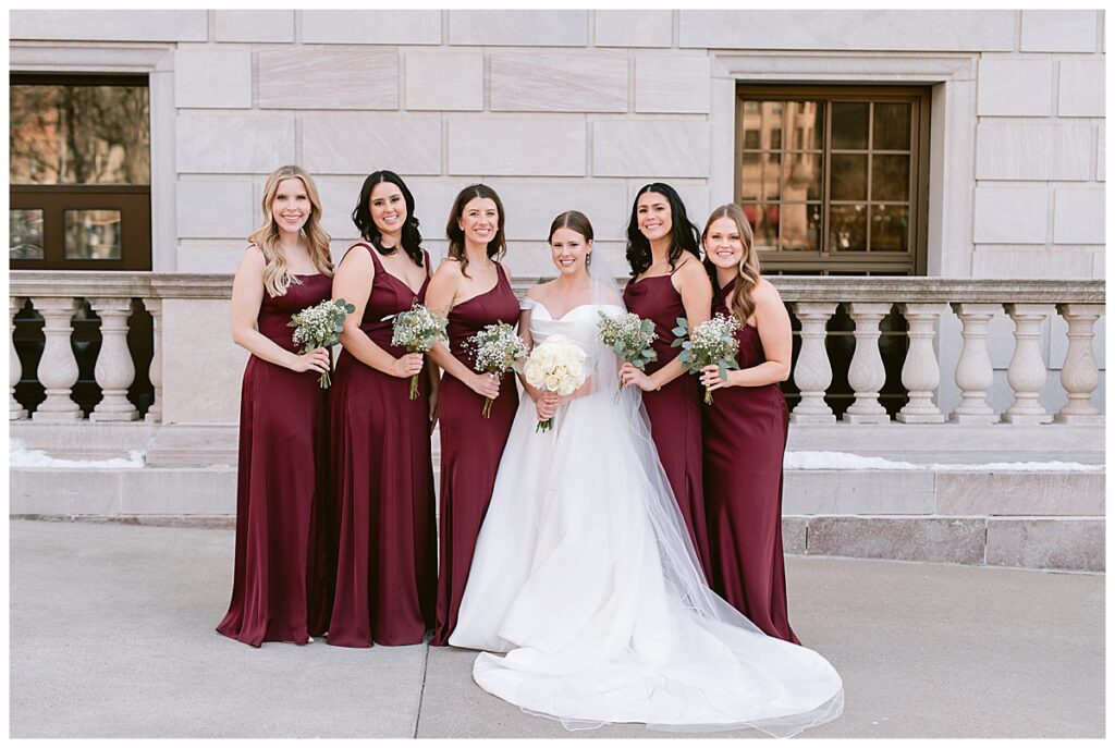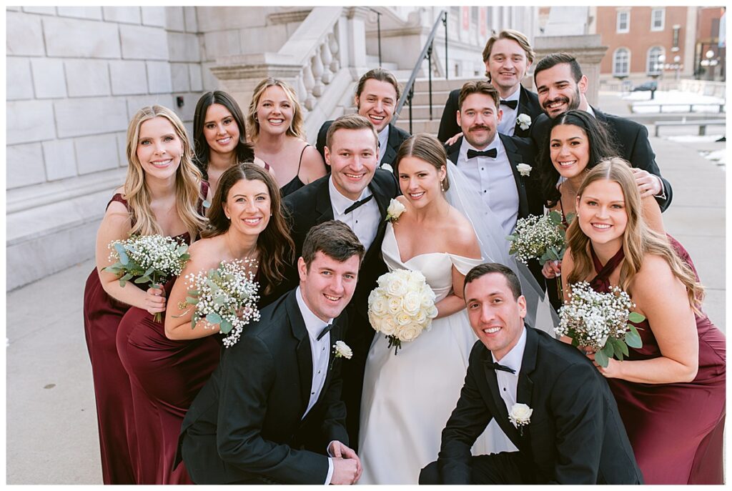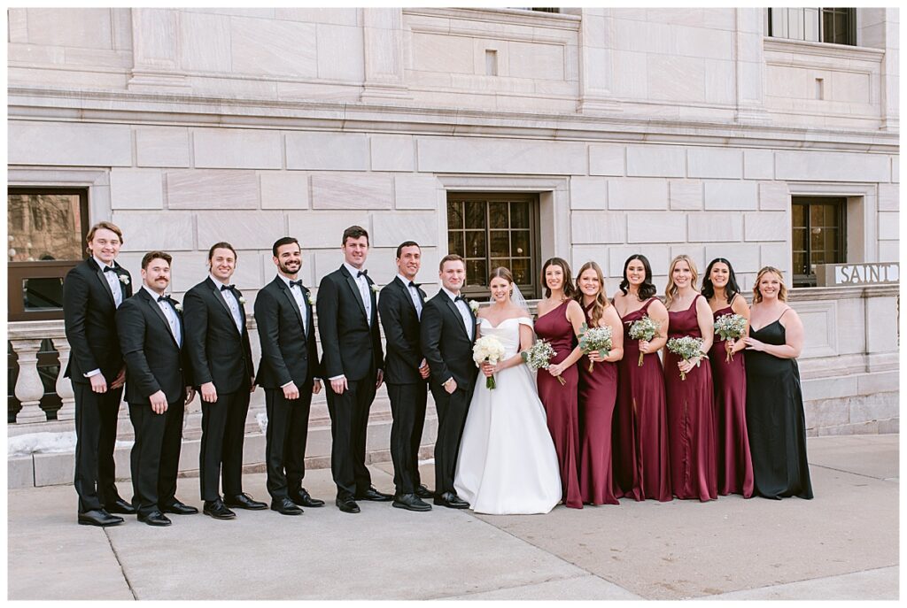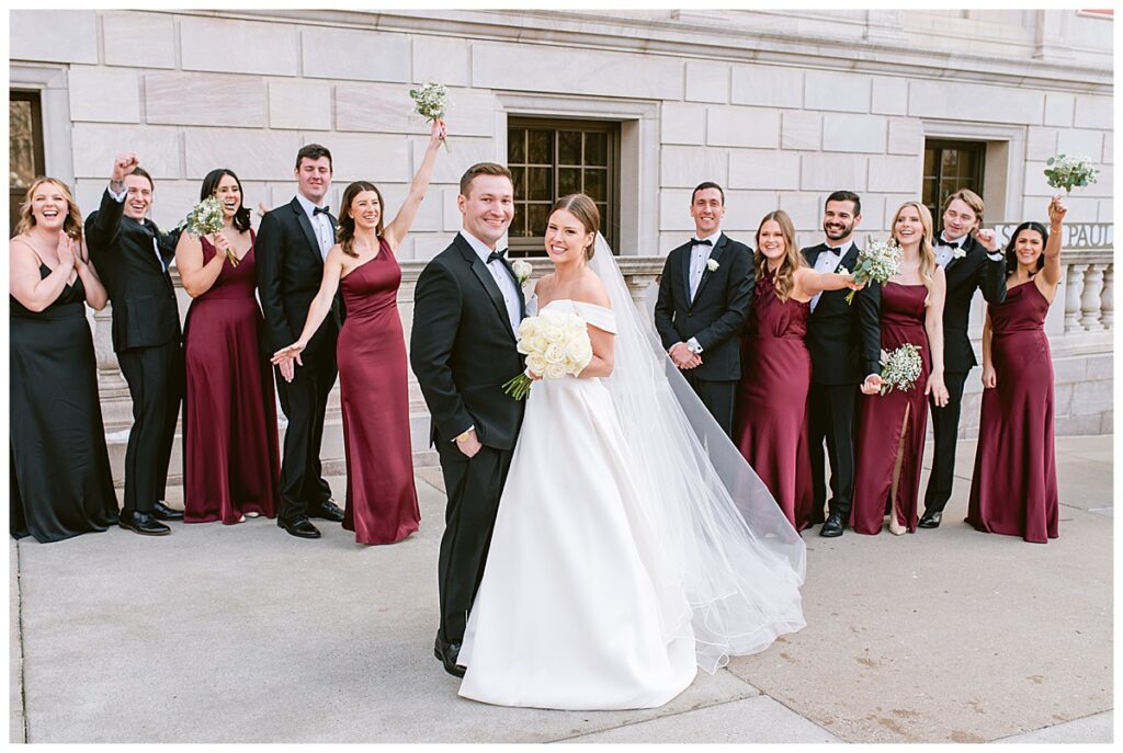 The grand staircase of the St. Paul Hotel served as the backdrop for Sophia and Christian’s unforgettable first look before heading outside. Accompanied by their wedding party, they ventured out to Rice Park for photos against the backdrop of the Landmark Center and the James J Hill Library. Decked in maroon dresses adorned with bouquets of baby’s breath, the bridesmaids radiated elegance, while the groomsmen, in classic black suits and bow ties from The Black Tux, exuded timeless charm. With the assistance of Laura Lonergan, Sophia’s white rose bridal bouquet became a masterpiece, adding a touch of ethereal charm to her ensemble.