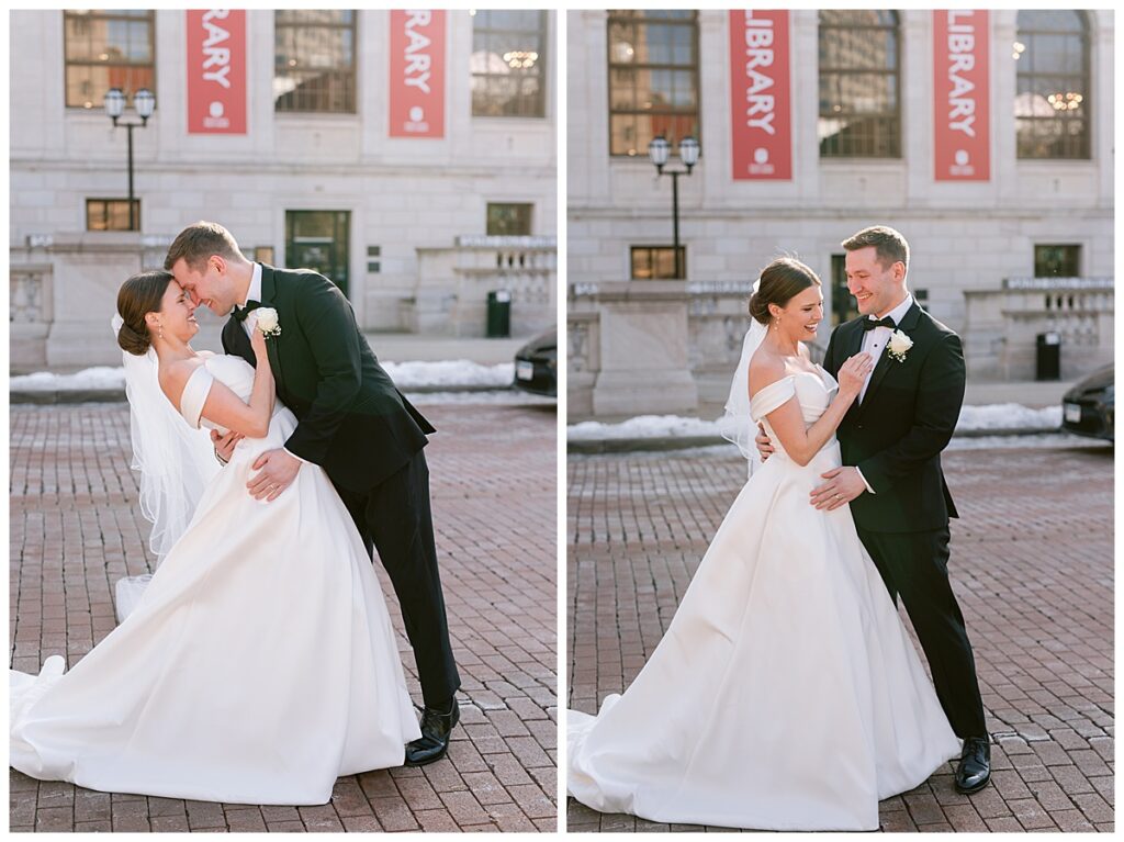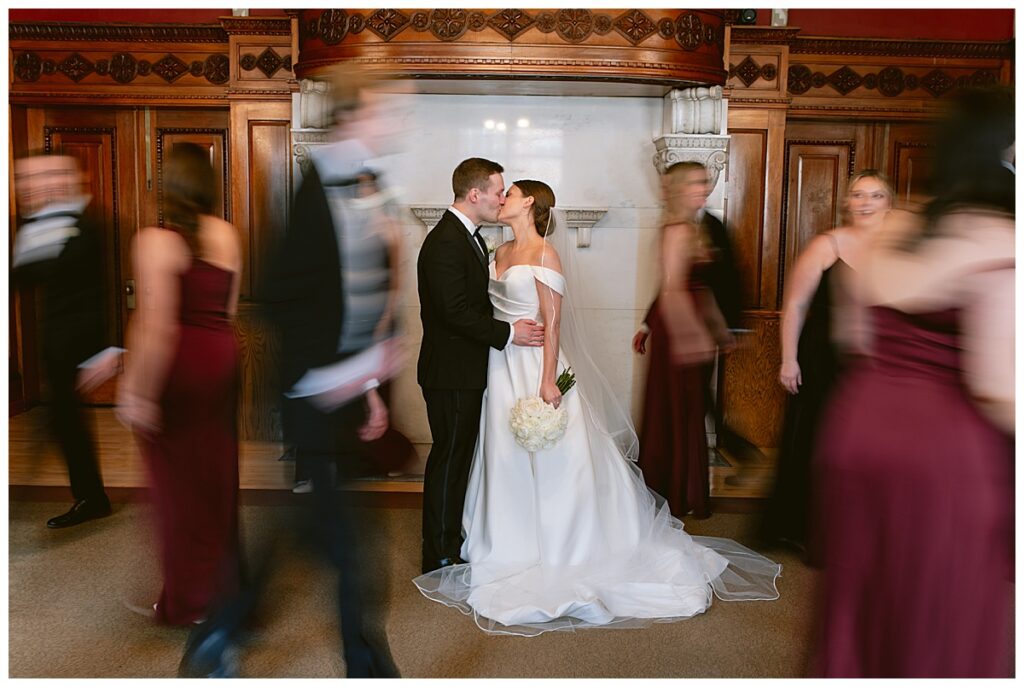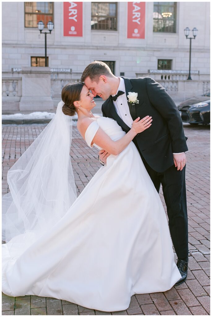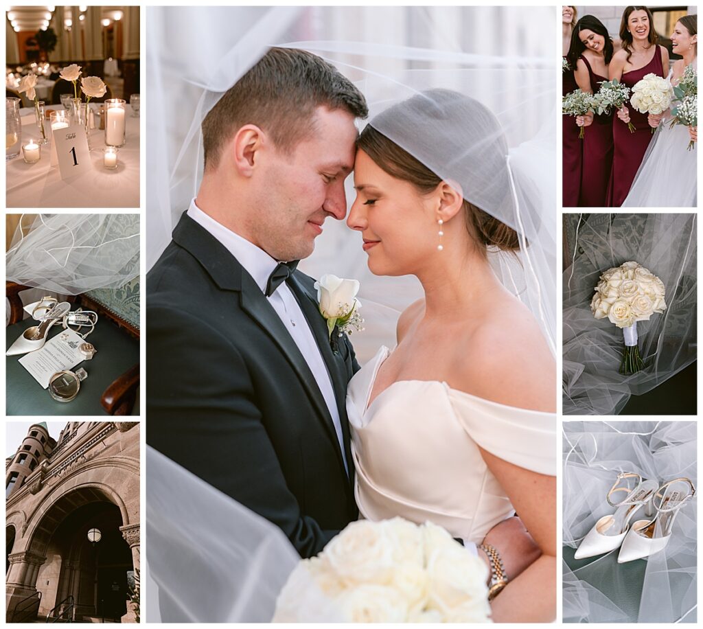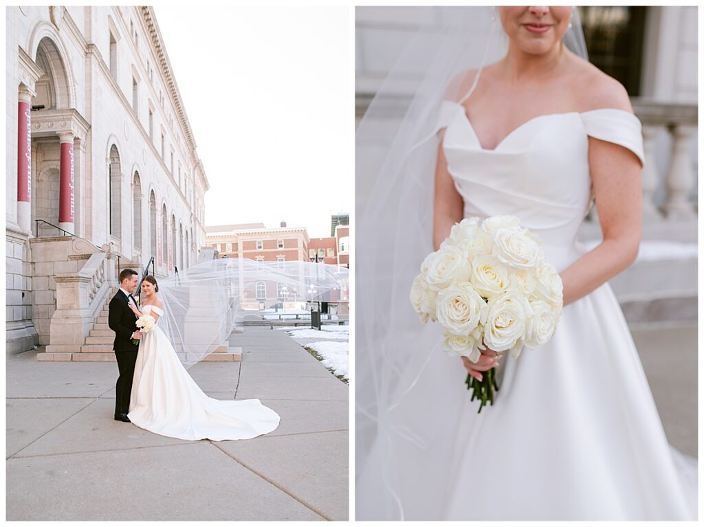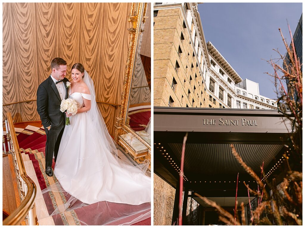 The grand staircase of the St. Paul Hotel served as the backdrop for Sophia and Christian’s unforgettable first look before heading outside. Accompanied by their wedding party, they ventured out to Rice Park for photos against the backdrop of the Landmark Center and the James J Hill Library. Decked in maroon dresses adorned with bouquets of baby’s breath, the bridesmaids radiated elegance, while the groomsmen, in classic black suits and bow ties from The Black Tux, exuded timeless charm. With the assistance of Laura Lonergan, Sophia’s white rose bridal bouquet became a masterpiece, adding a touch of ethereal charm to her ensemble.