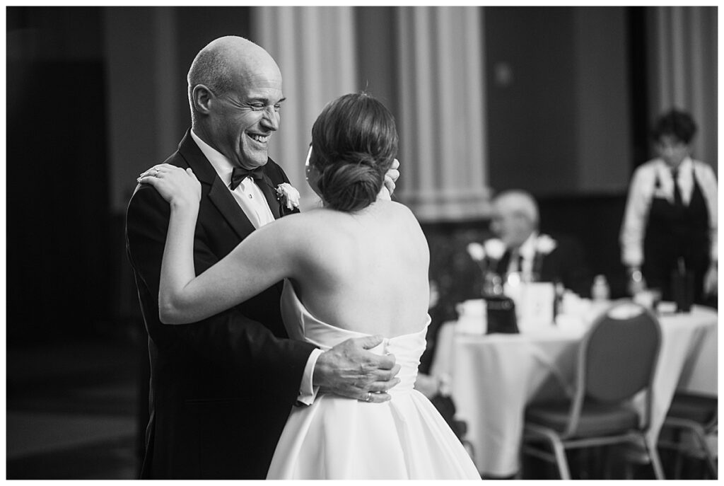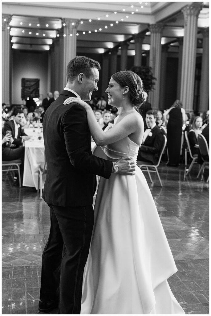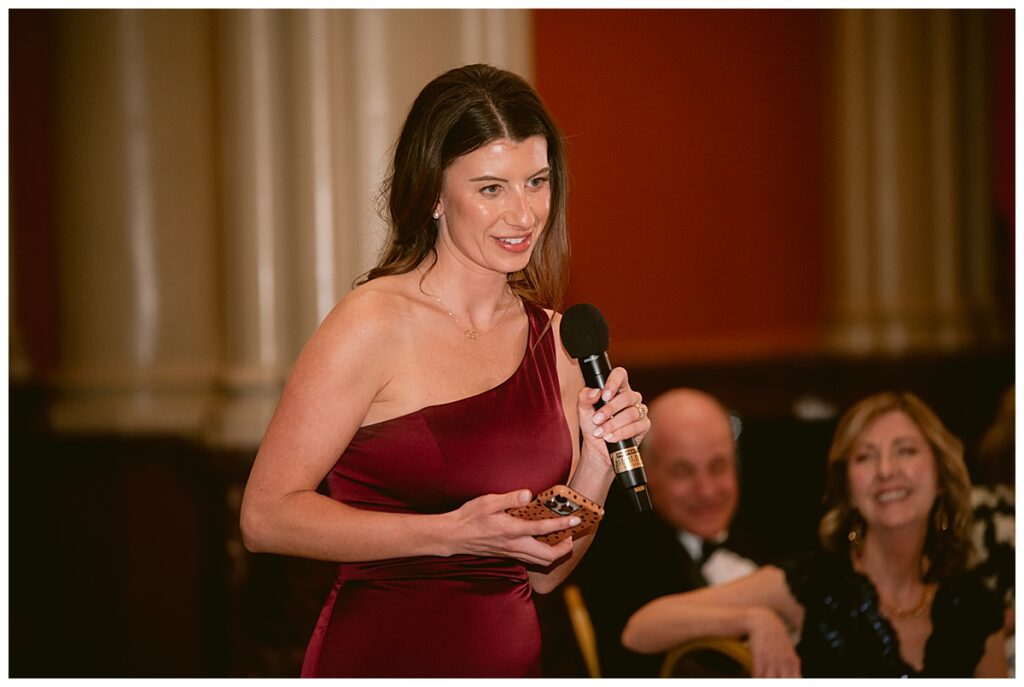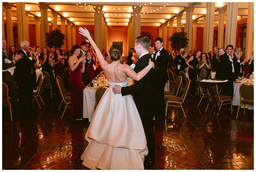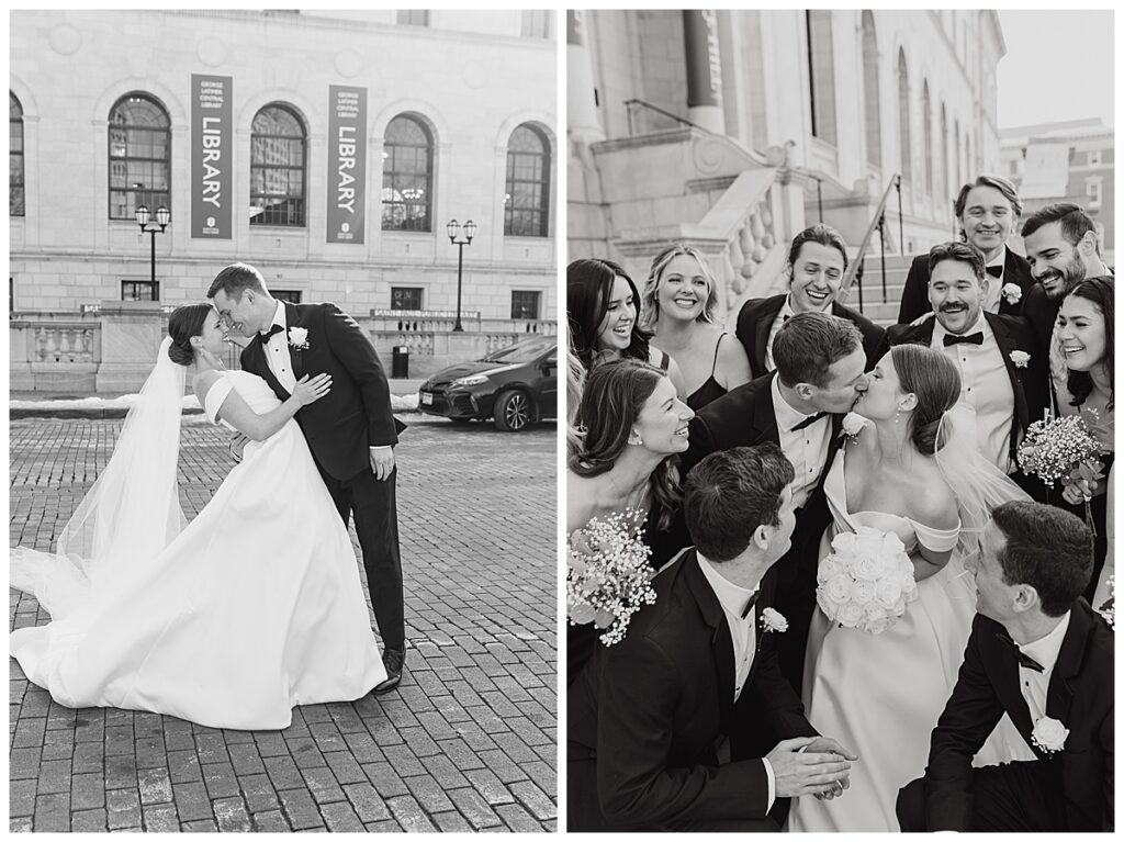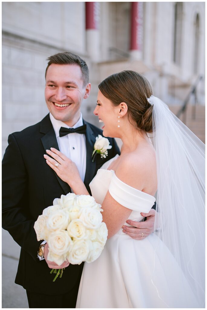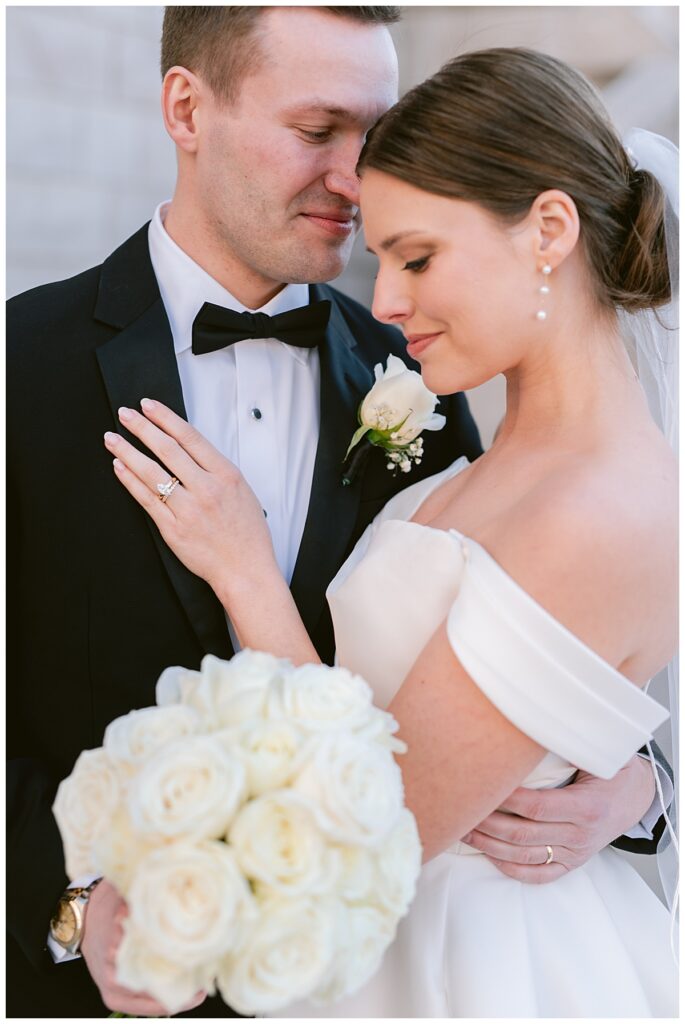 The grand staircase of the St. Paul Hotel served as the backdrop for Sophia and Christian’s unforgettable first look before heading outside. Accompanied by their wedding party, they ventured out to Rice Park for photos against the backdrop of the Landmark Center and the James J Hill Library. Decked in maroon dresses adorned with bouquets of baby’s breath, the bridesmaids radiated elegance, while the groomsmen, in classic black suits and bow ties from The Black Tux, exuded timeless charm. With the assistance of Laura Lonergan, Sophia’s white rose bridal bouquet became a masterpiece, adding a touch of ethereal charm to her ensemble.