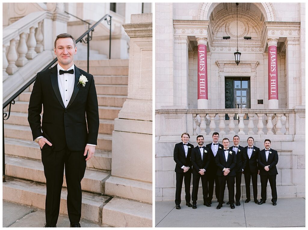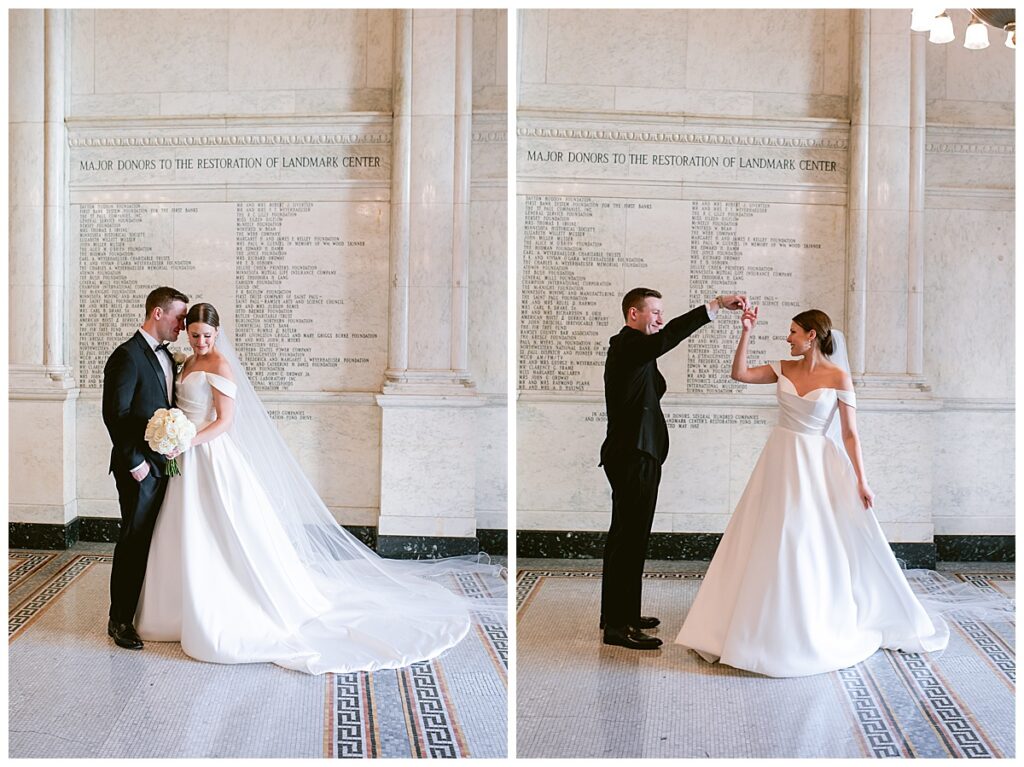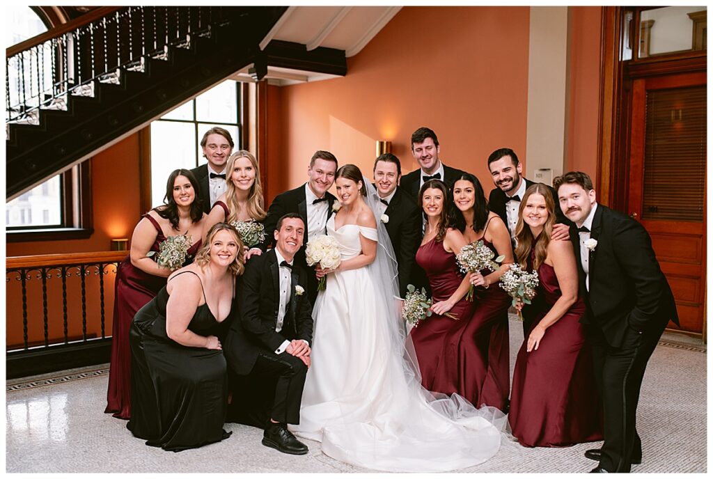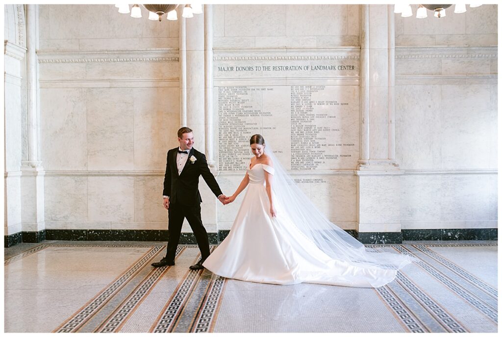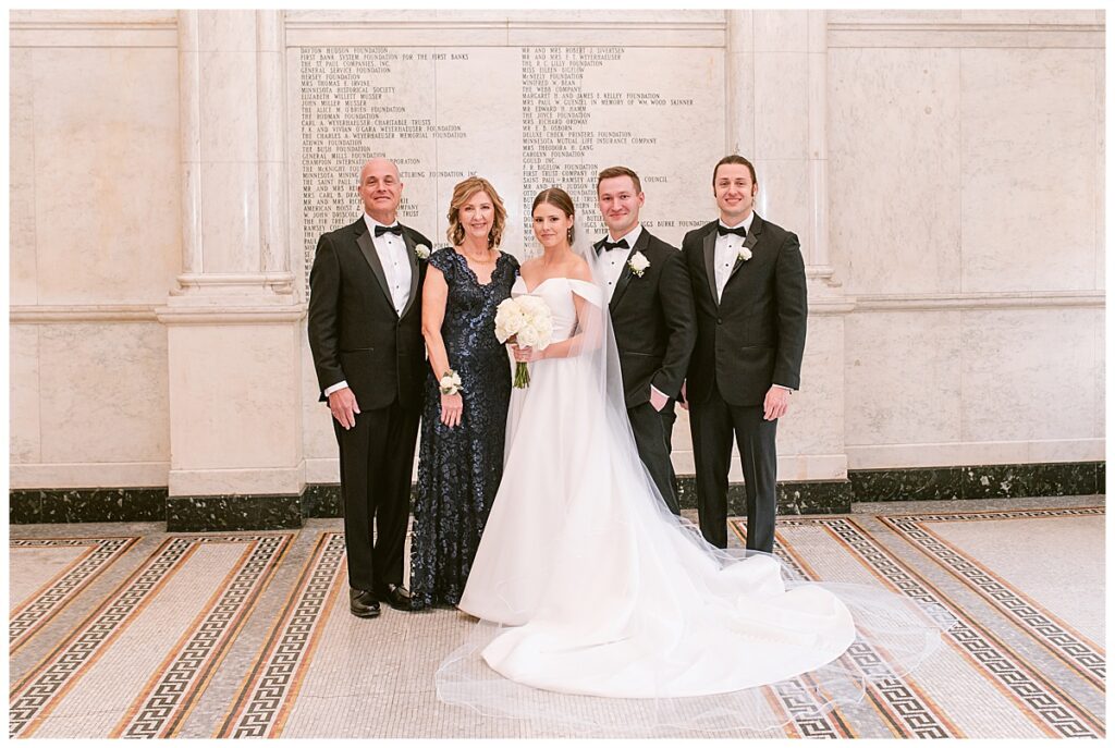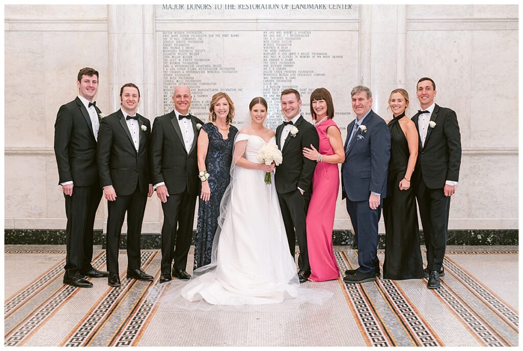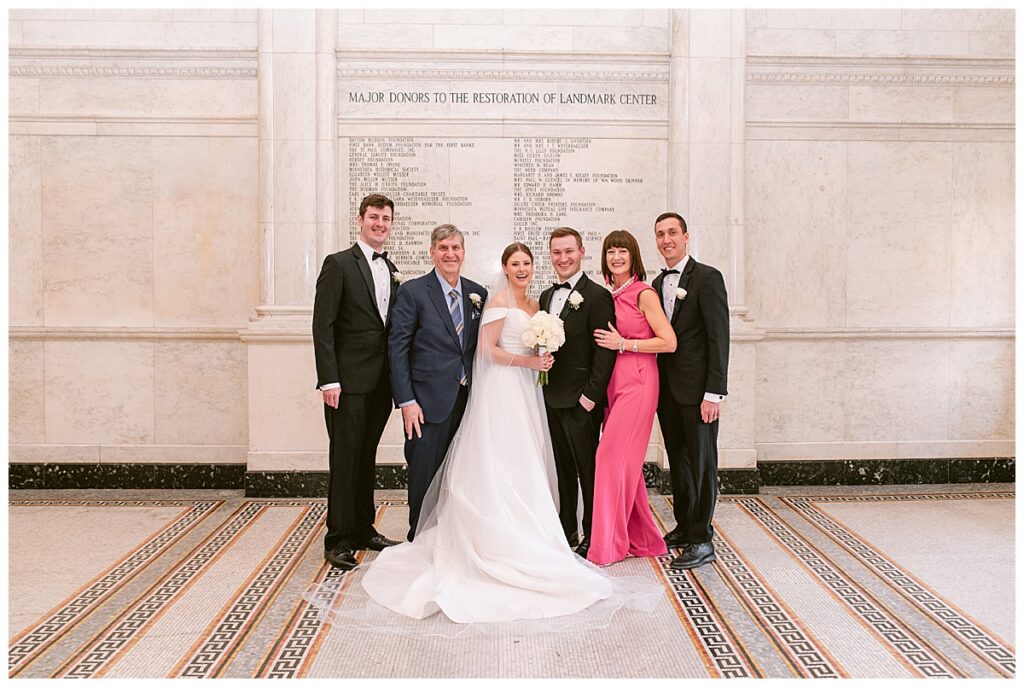 Back inside the Landmark Center, the couple and their wedding party explored the historic beauty of the building making sure to take photos in staircases and old courtrooms. From there, the family met the couple for family photos in the beautiful white entry way of the building.