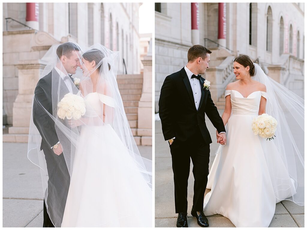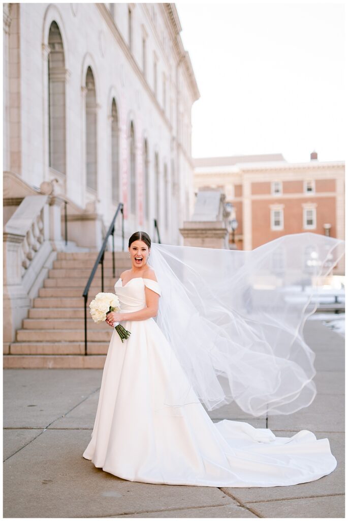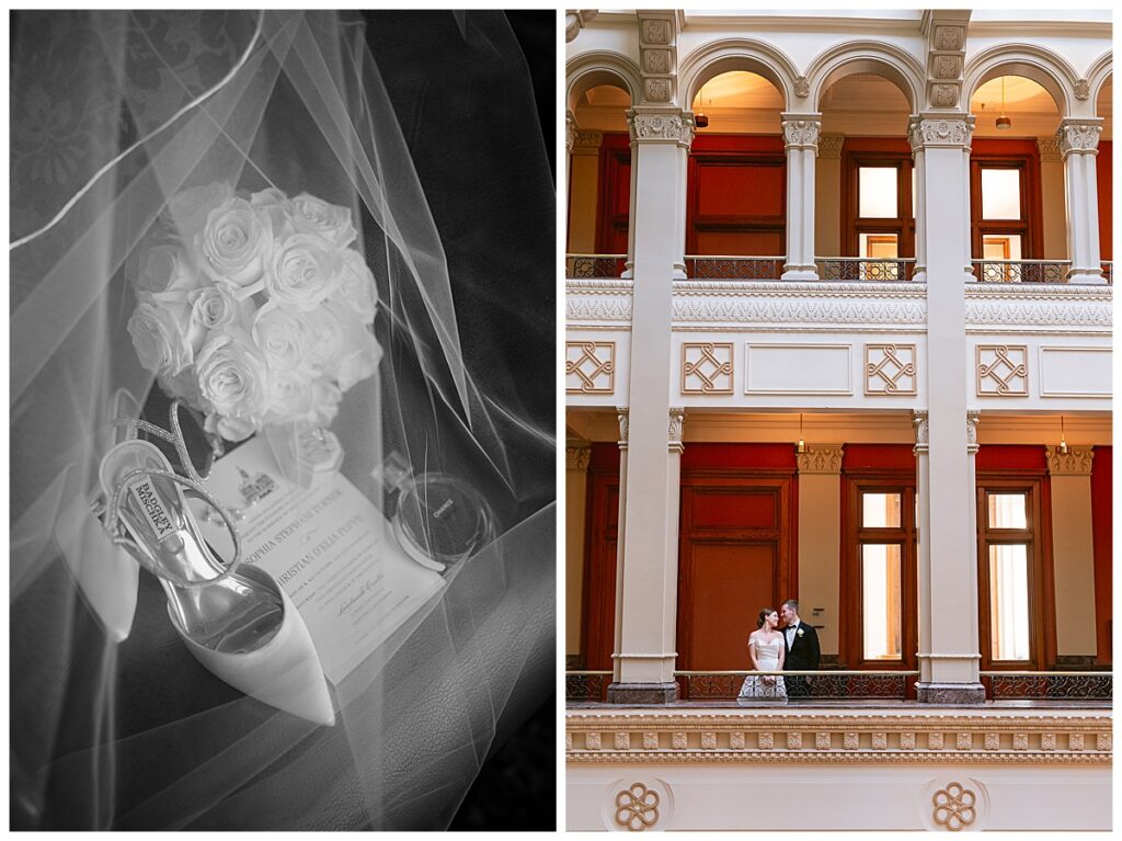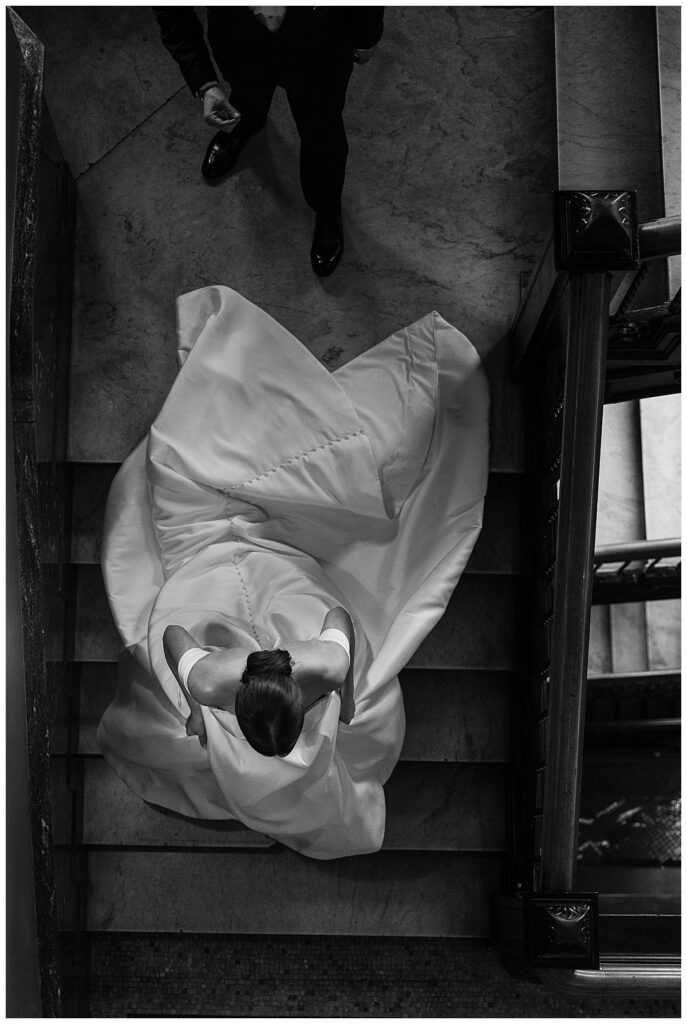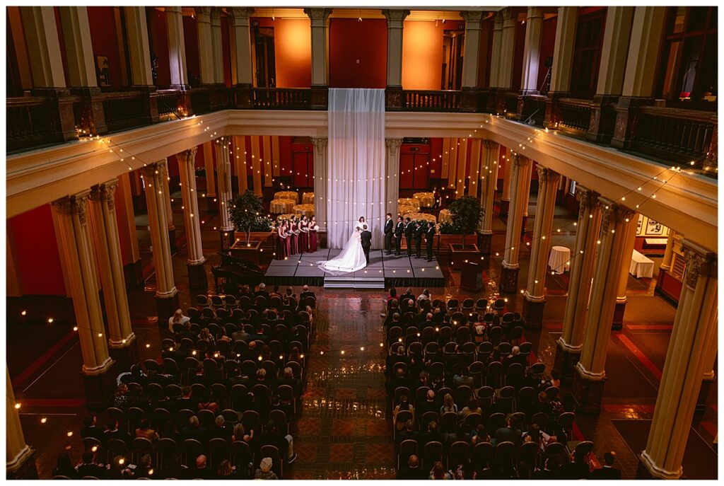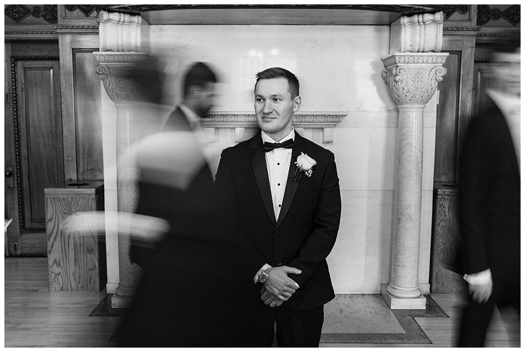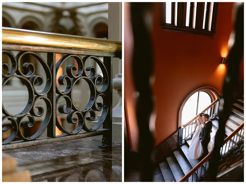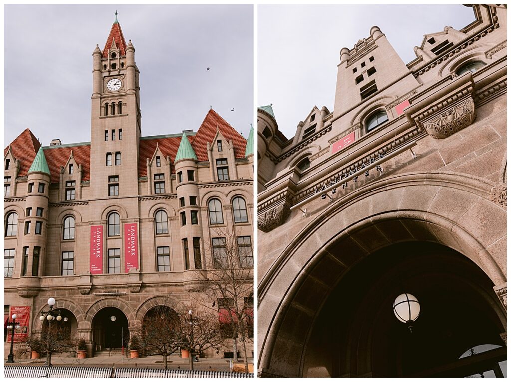 Back inside the Landmark Center, the couple and their wedding party explored the historic beauty of the building making sure to take photos in staircases and old courtrooms. From there, the family met the couple for family photos in the beautiful white entry way of the building.