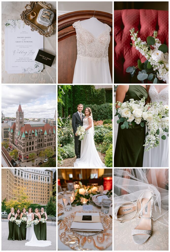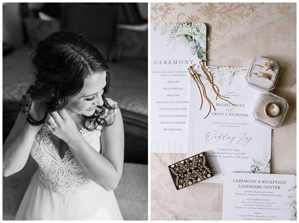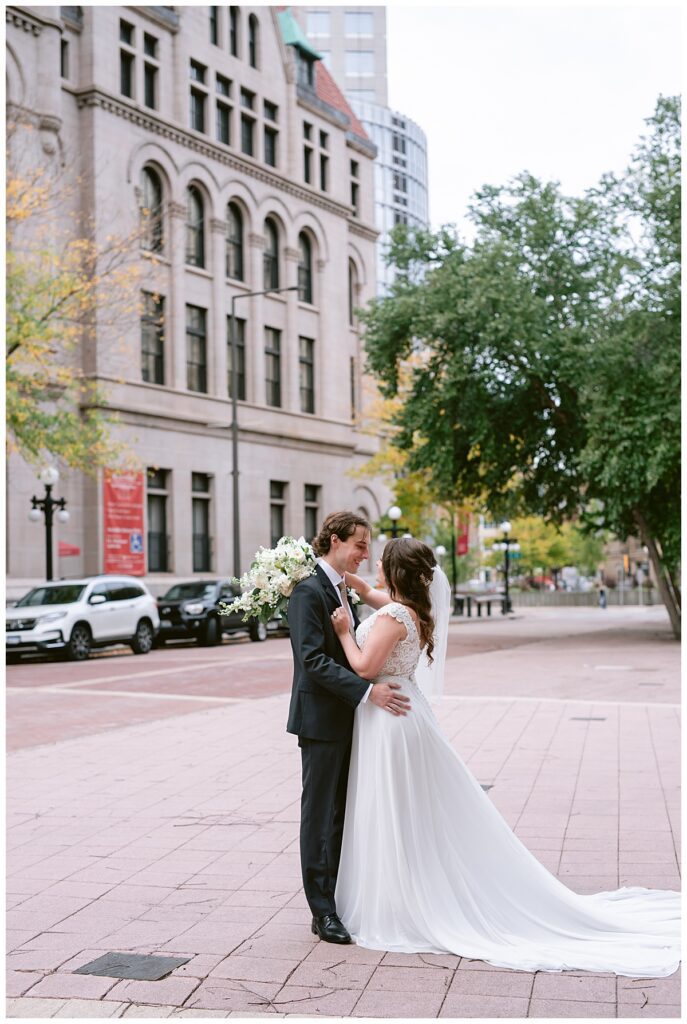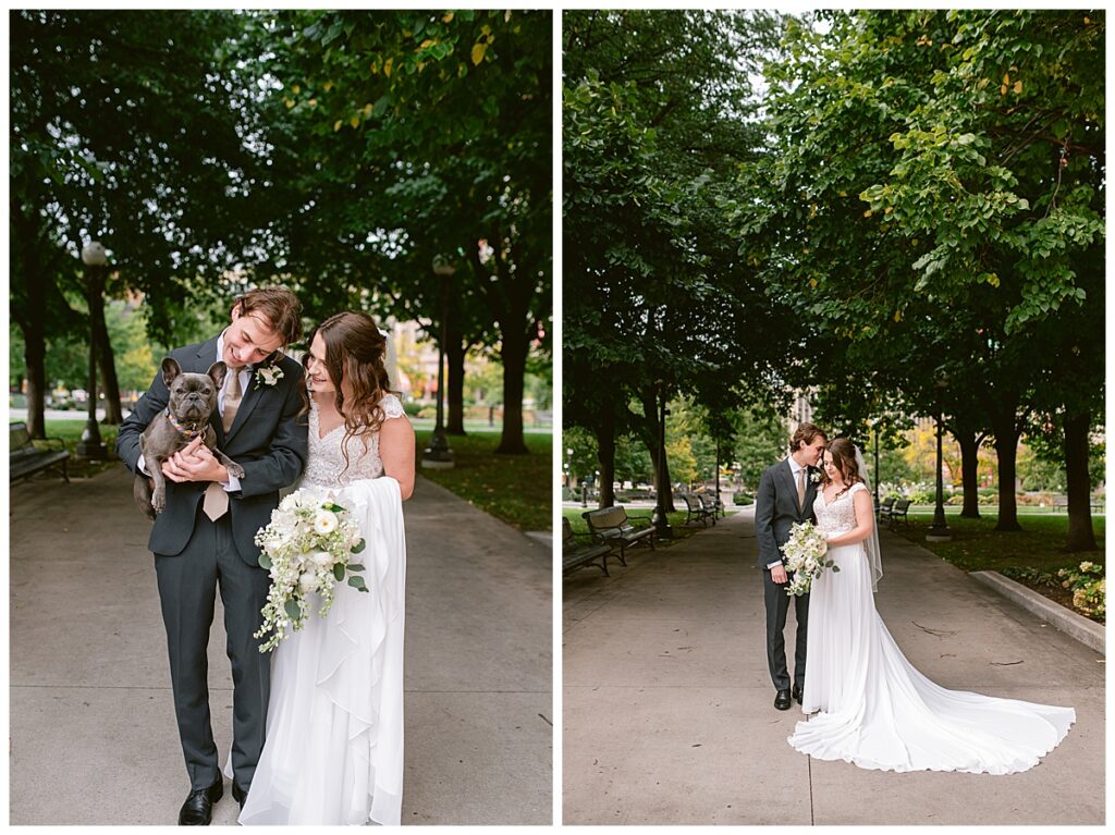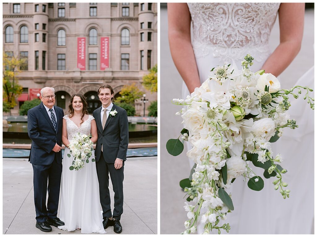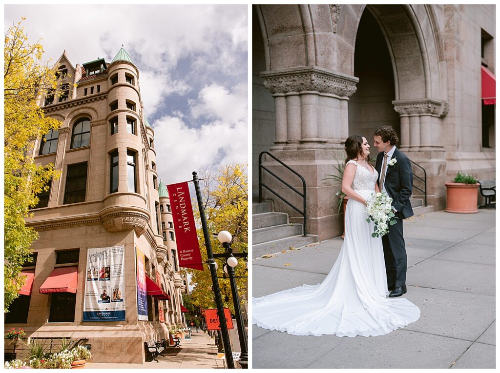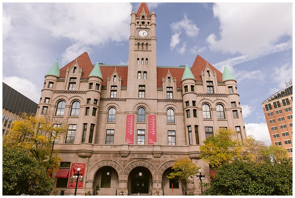 The Landmark Center in St. Paul, Minnesota was the perfect location for Rachel and Grant to host their beautiful October wedding. The day was filled with laughter and tears and it was an incredible joy to photograph so many emotional moments. Rachel and her bridesmaids began the morning by getting ready at the Saint Paul Hotel where Primped did hair and make-up for all the women in their suite. Rachel‘s mom then helped her get into her beautiful dress from Brides ‘n’ Bells and shoes from Nina Bridal. She then headed outside to the beautiful hotel garden to meet Grant. It was an emotional first look for both of them, but when they saw their sweet Frenchie, Haven, they were both back to smiles and laughter!