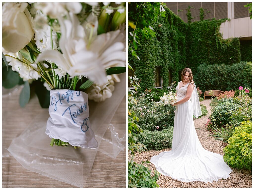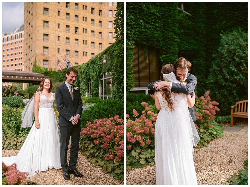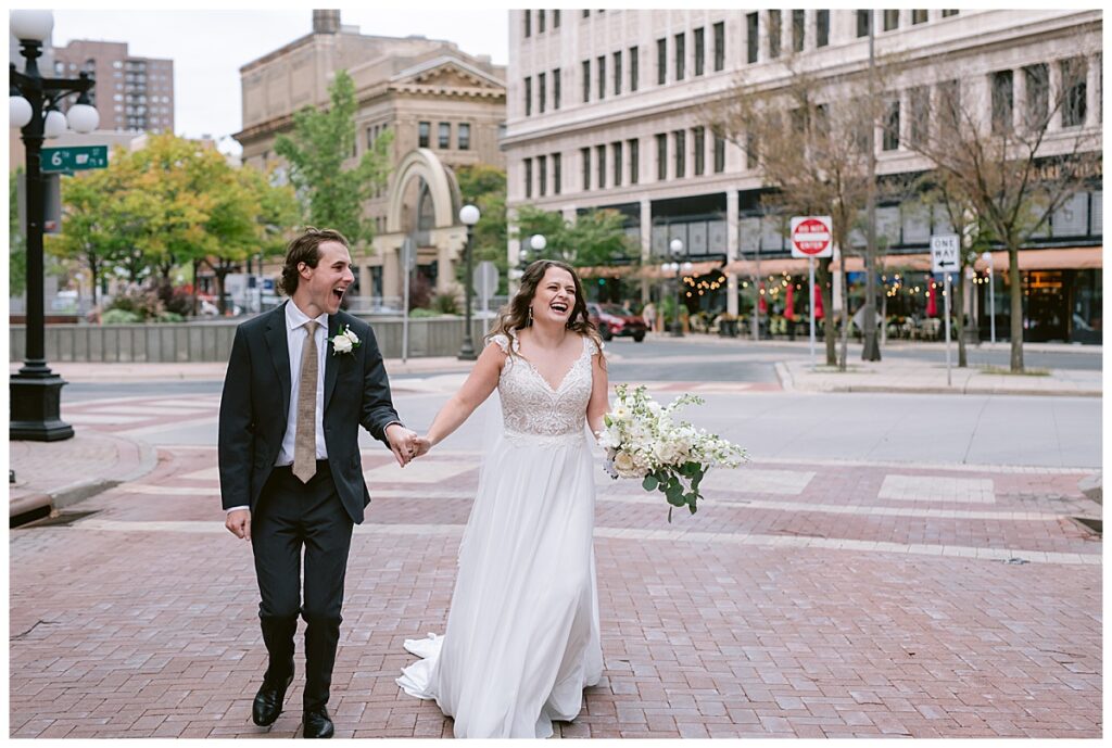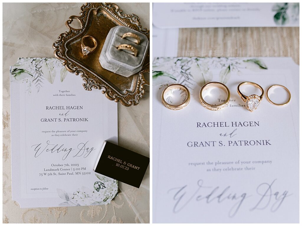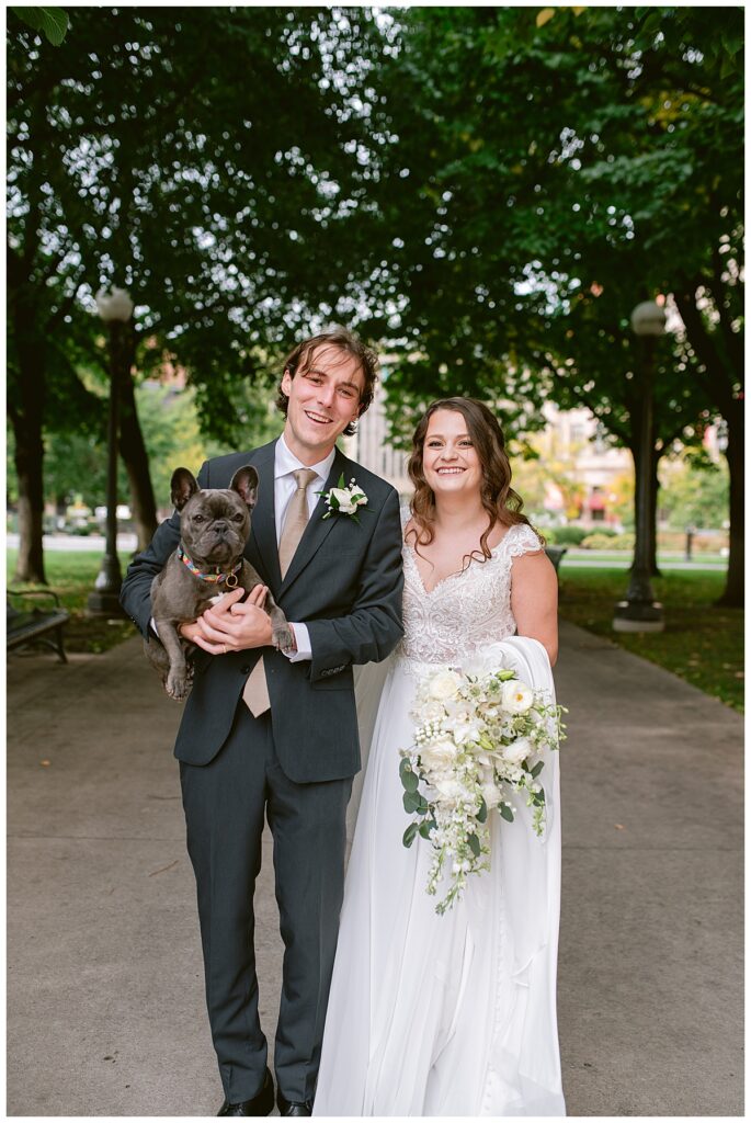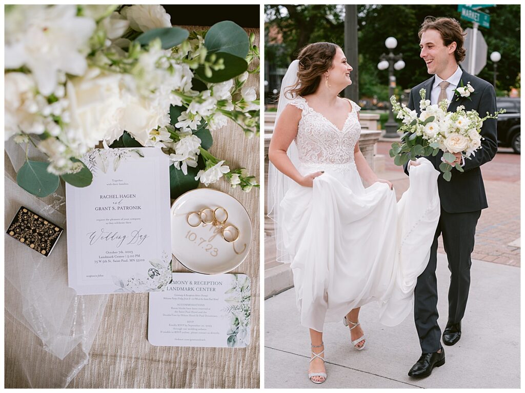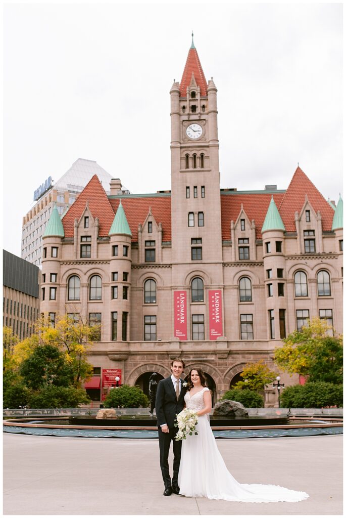 The Landmark Center in St. Paul, Minnesota was the perfect location for Rachel and Grant to host their beautiful October wedding. The day was filled with laughter and tears and it was an incredible joy to photograph so many emotional moments. Rachel and her bridesmaids began the morning by getting ready at the Saint Paul Hotel where Primped did hair and make-up for all the women in their suite. Rachel‘s mom then helped her get into her beautiful dress from Brides ‘n’ Bells and shoes from Nina Bridal. She then headed outside to the beautiful hotel garden to meet Grant. It was an emotional first look for both of them, but when they saw their sweet Frenchie, Haven, they were both back to smiles and laughter!