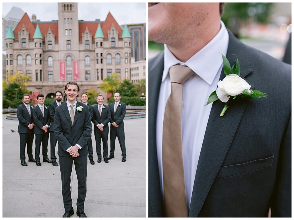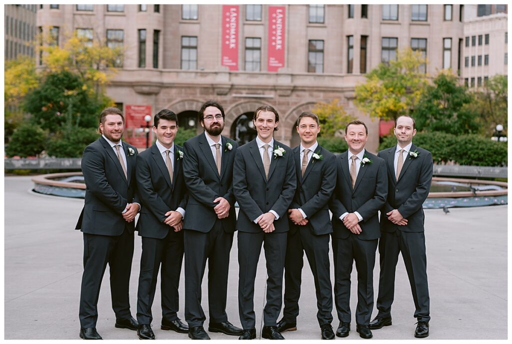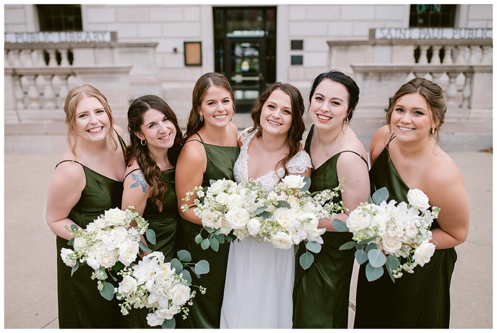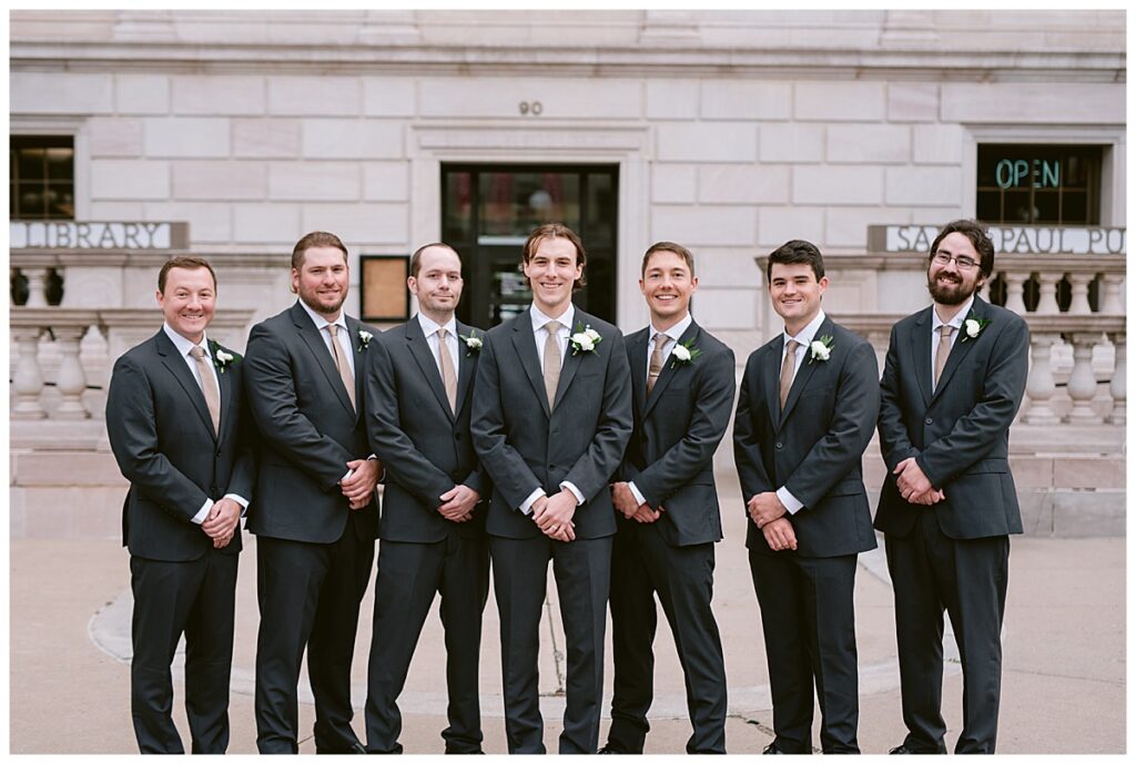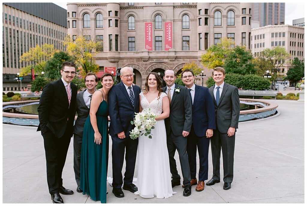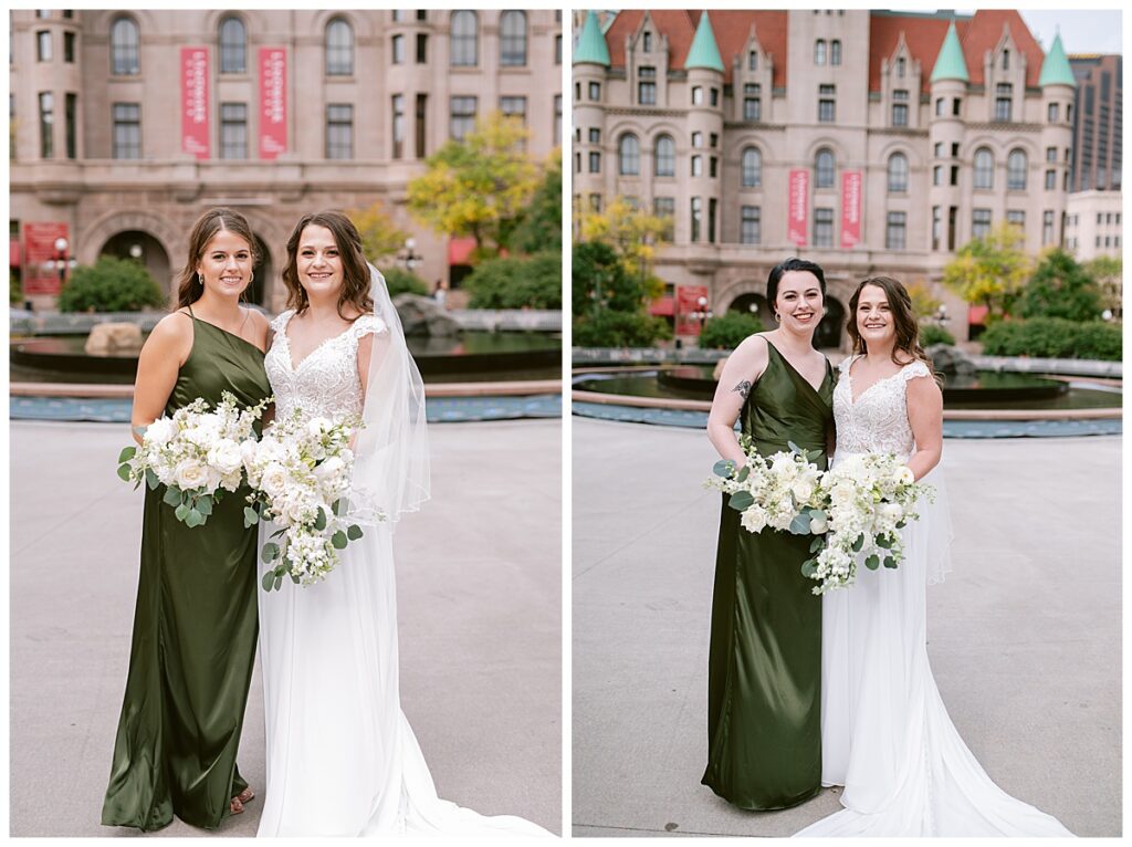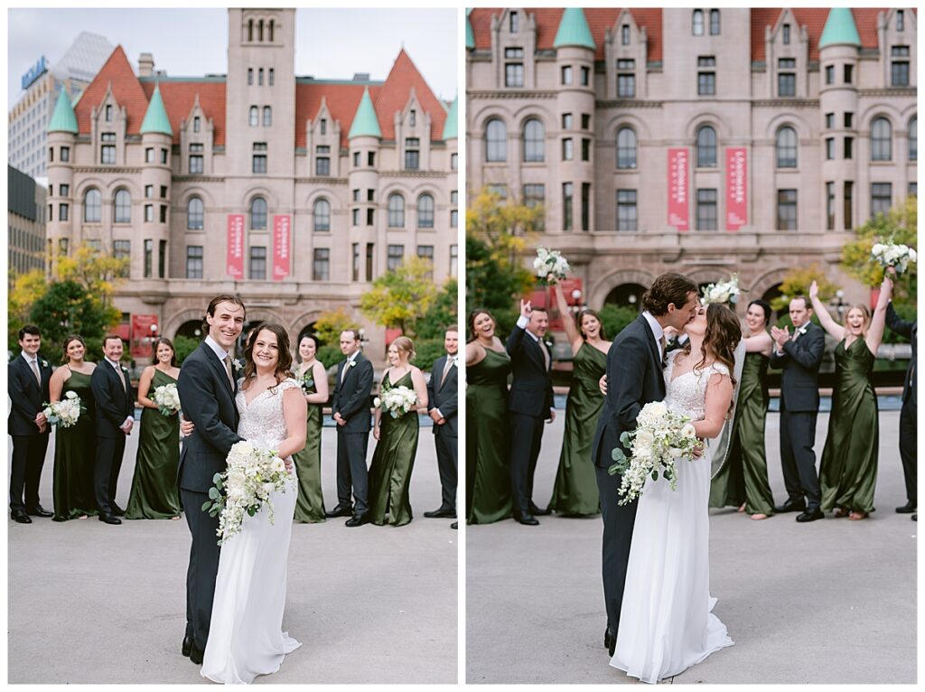 The wedding party then joined us for photos in Rice Park, the James J Hill Library, and in front of the Saint Paul Hotel. The women looked beautiful in their olive green dresses from David’s Bridal, while the men supported dapper grey suits from The Suit Shop. Family then joined us for more photos, and then we headed inside to get ready for their ceremony.