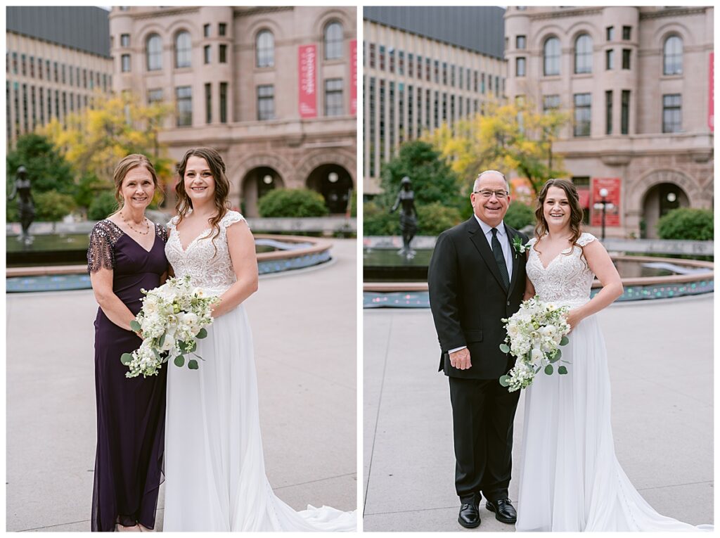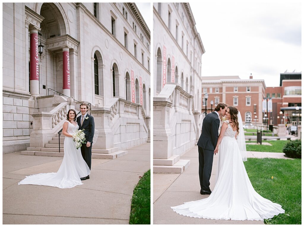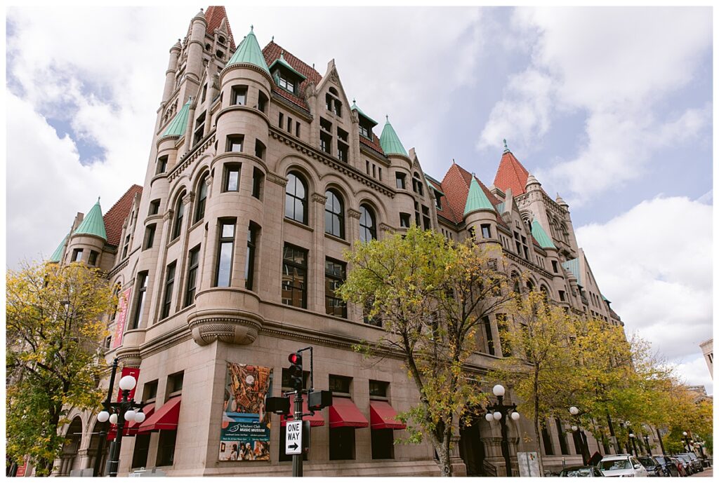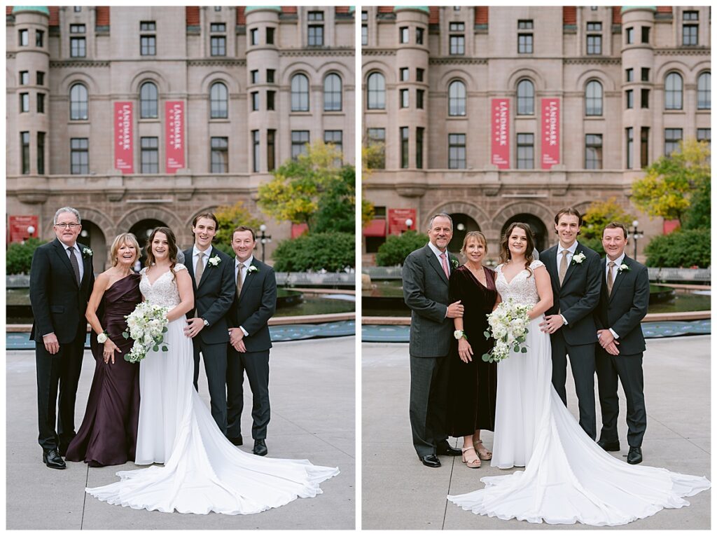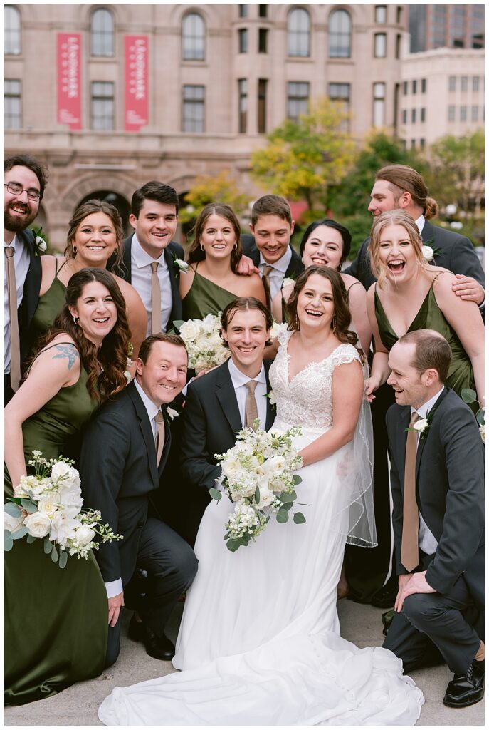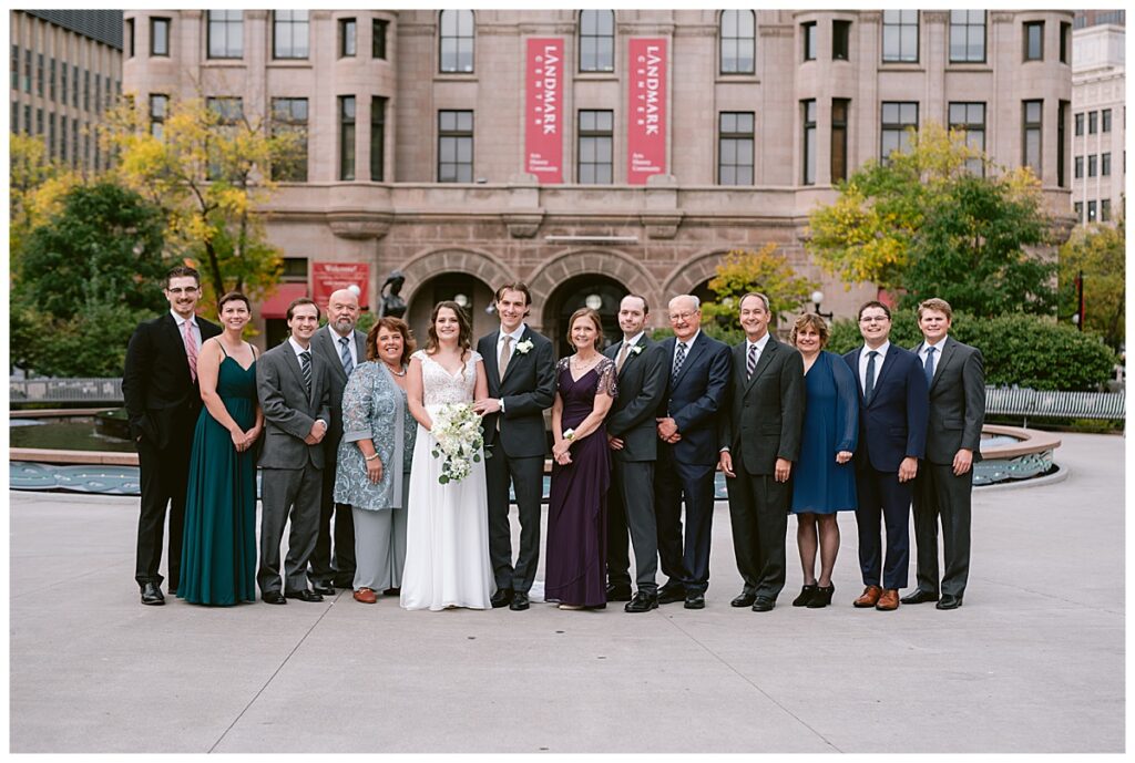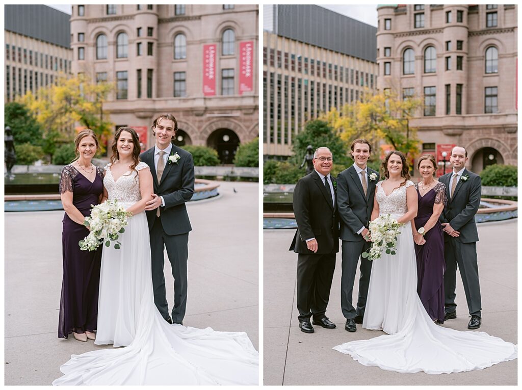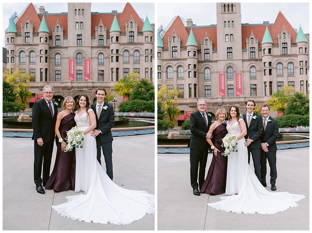 The wedding party then joined us for photos in Rice Park, the James J Hill Library, and in front of the Saint Paul Hotel. The women looked beautiful in their olive green dresses from David’s Bridal, while the men supported dapper grey suits from The Suit Shop. Family then joined us for more photos, and then we headed inside to get ready for their ceremony.