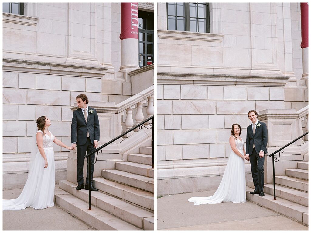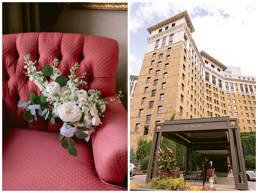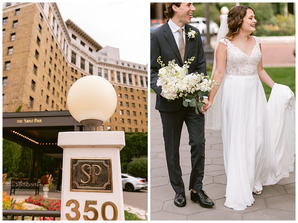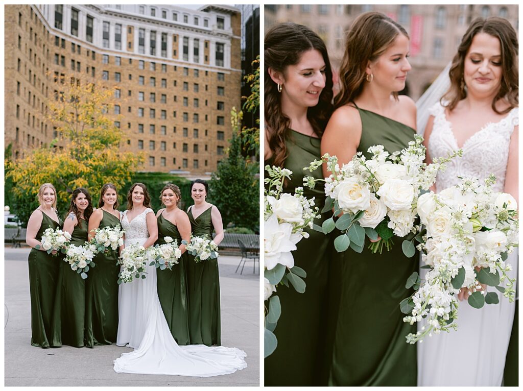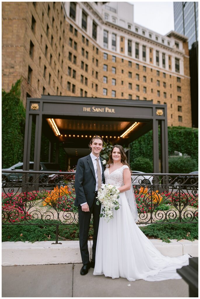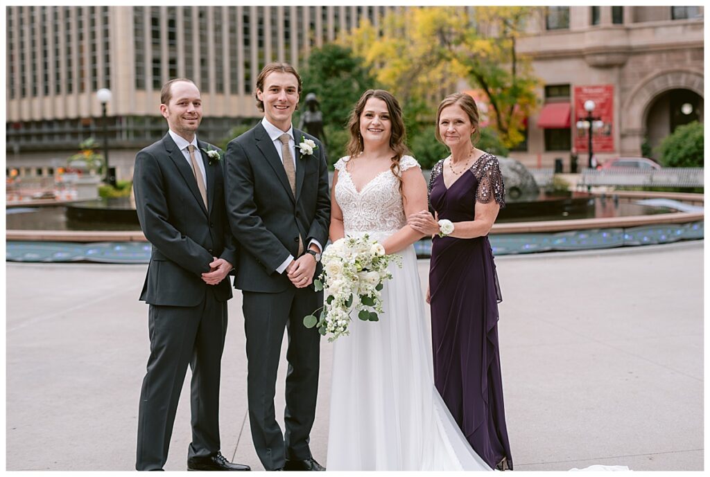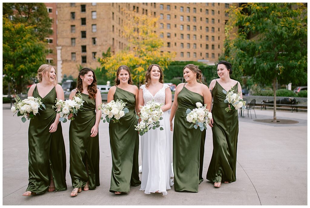 The wedding party then joined us for photos in Rice Park, the James J Hill Library, and in front of the Saint Paul Hotel. The women looked beautiful in their olive green dresses from David’s Bridal, while the men supported dapper grey suits from The Suit Shop. Family then joined us for more photos, and then we headed inside to get ready for their ceremony.