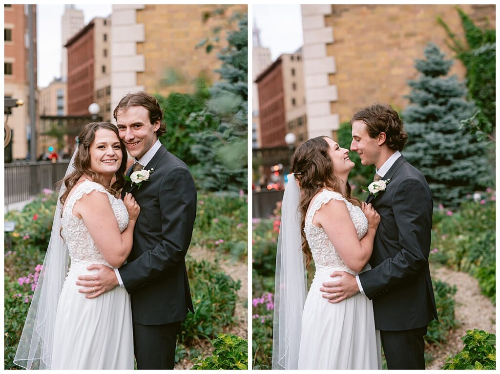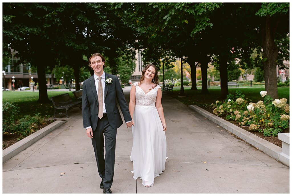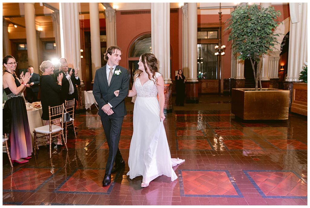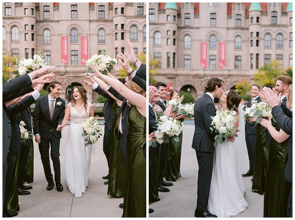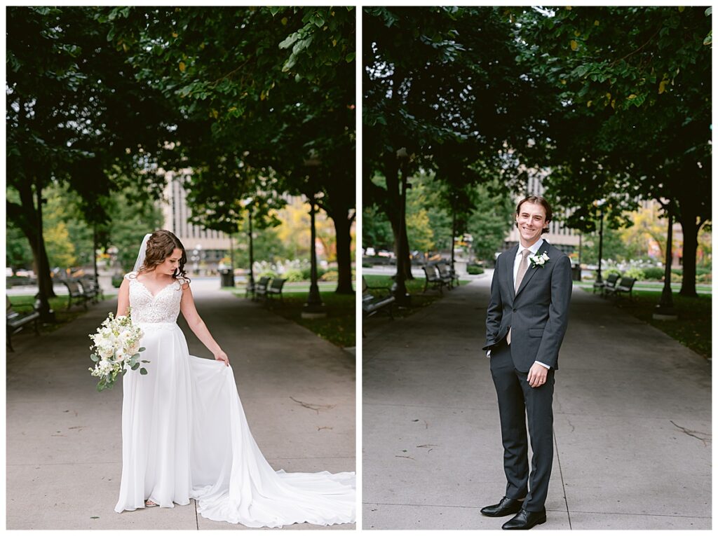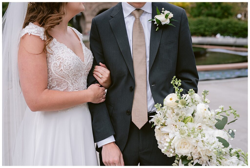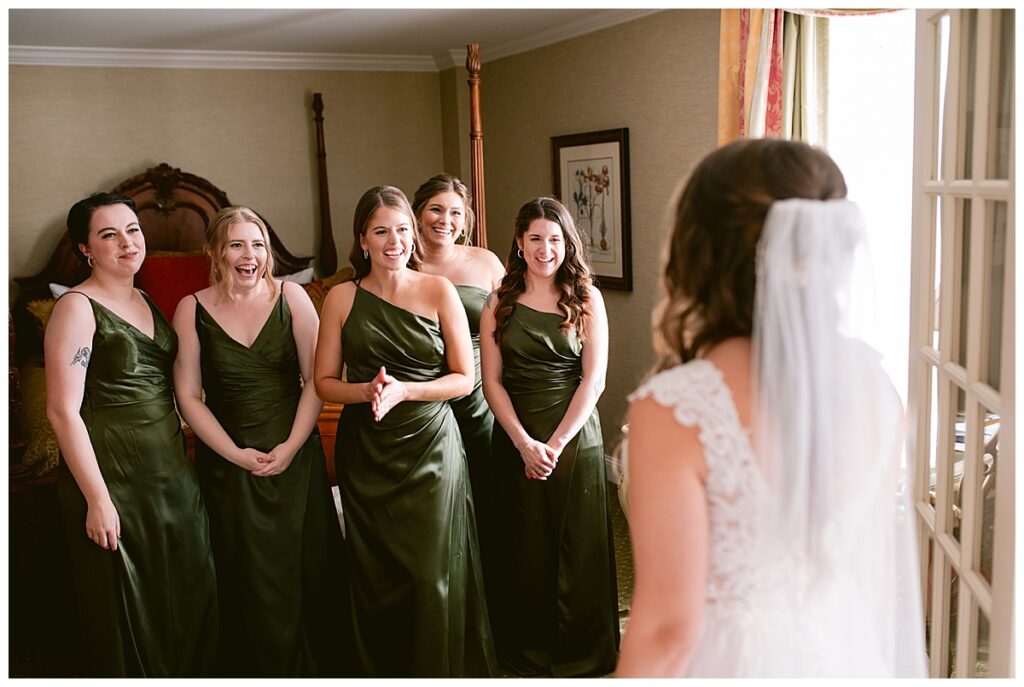The wedding party then joined us for photos in Rice Park, the James J Hill Library, and in front of the Saint Paul Hotel. The women looked beautiful in their olive green dresses from David’s Bridal, while the men supported dapper grey suits from The Suit Shop. Family then joined us for more photos, and then we headed inside to get ready for their ceremony.