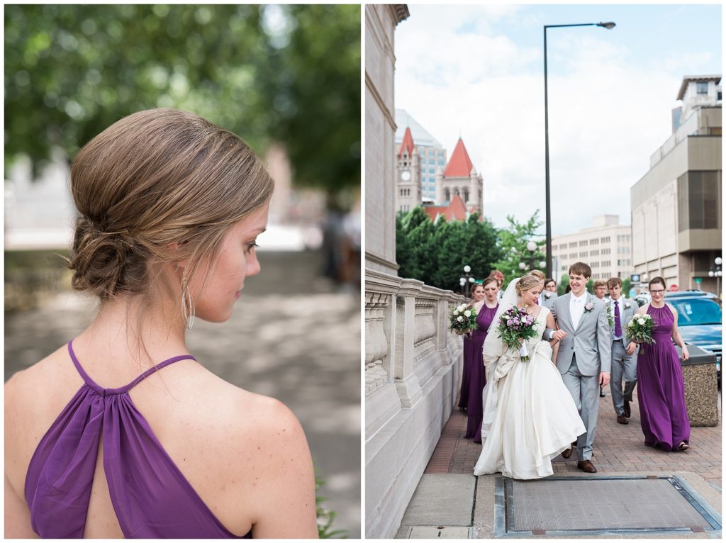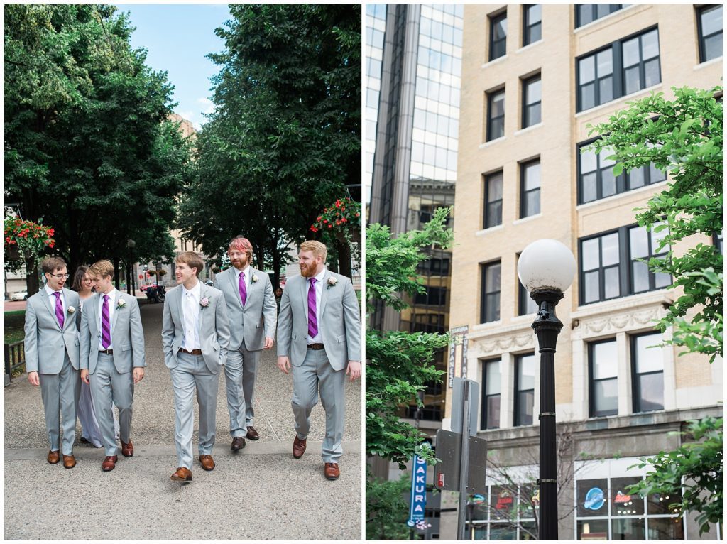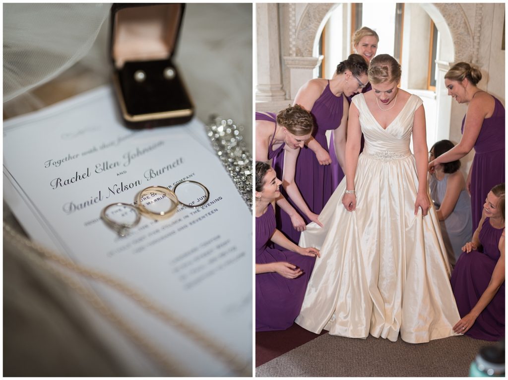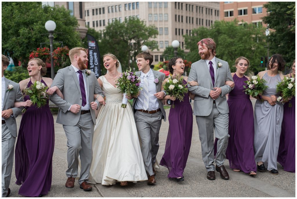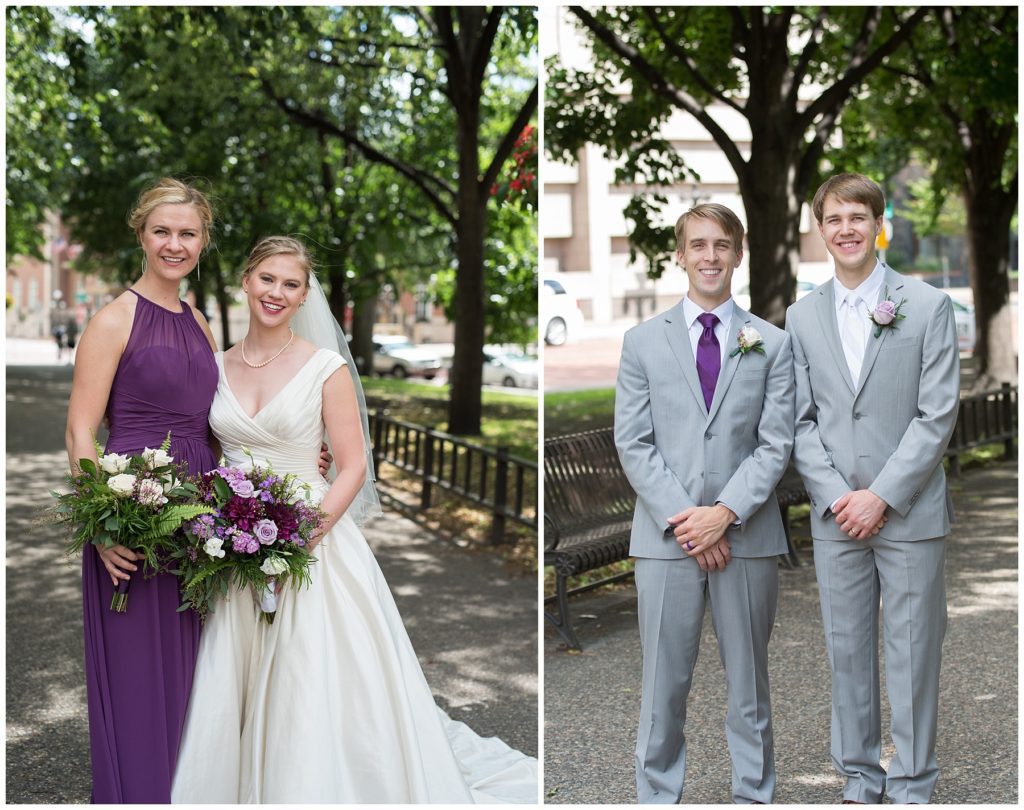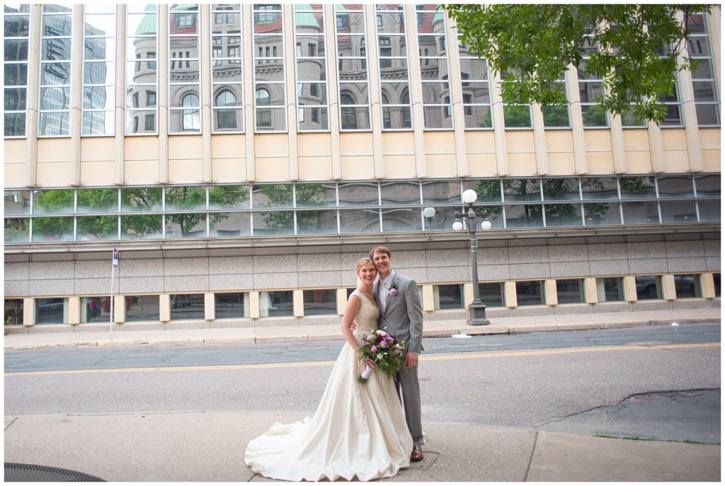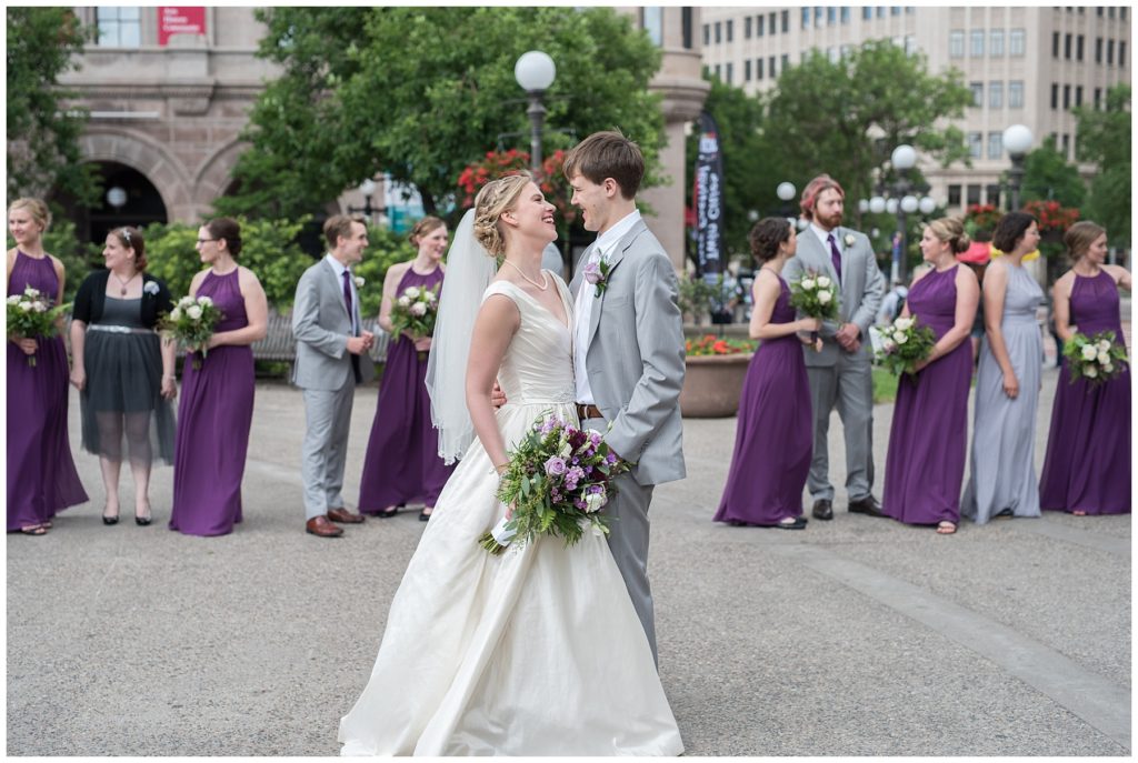 Their wedding day was just as beautiful. Surrounded by family and friends from all over the world, the two were wed in the historic Landmark Center of St. Paul. Their summer evening wedding could not have been more comfortable as the couple walked around the streets of Rice Park and along the river for photos. Rachel’s elegant satan Allure dress was stunning against Dan’s Josph Abbound grey suit. The violet and green bouquets from Florals by Claire added a stunning pop of color against the purple bridesmaid dresses from the Wedding Shoppe. Rachel and Dan both added heirloom pieces of jewelry to their day. Pearl earrings that Rachel’s mother on her wedding day, her necklace was her paternal grandmother’s and her bracelet was her maternal grandmother’s and a tie Clip that Dan’s grandfather passed on to him. Their ceremony was inside the Landmark Center and guests were invited to share in the festivities of dinner provided by BRIE catering and dancing DJ’d by Fulton Productions.