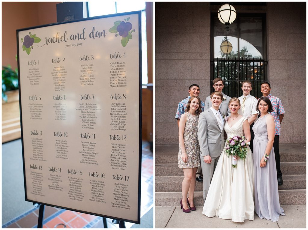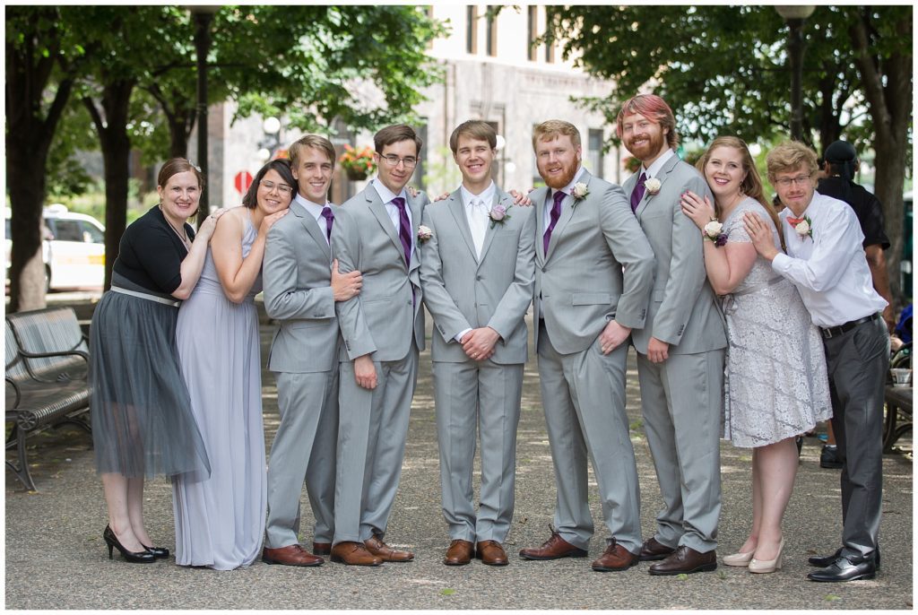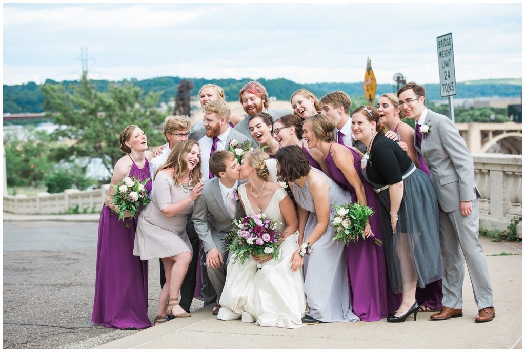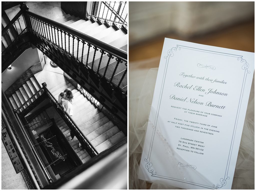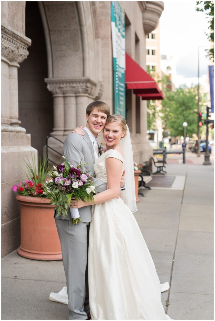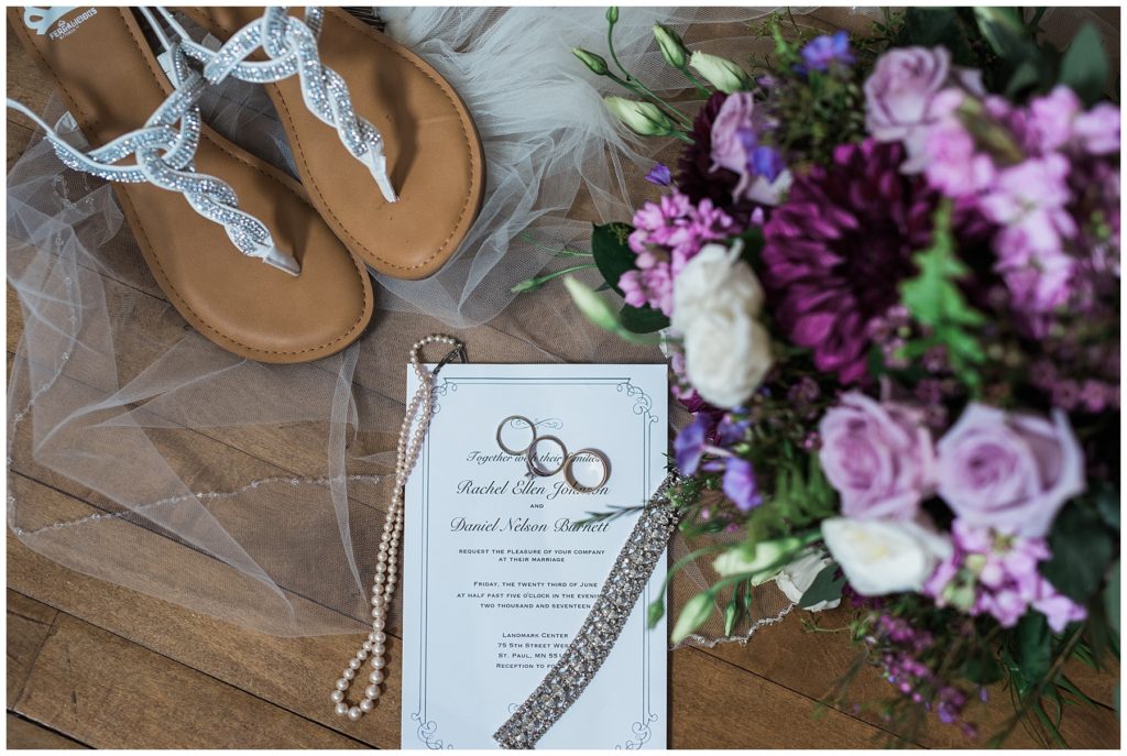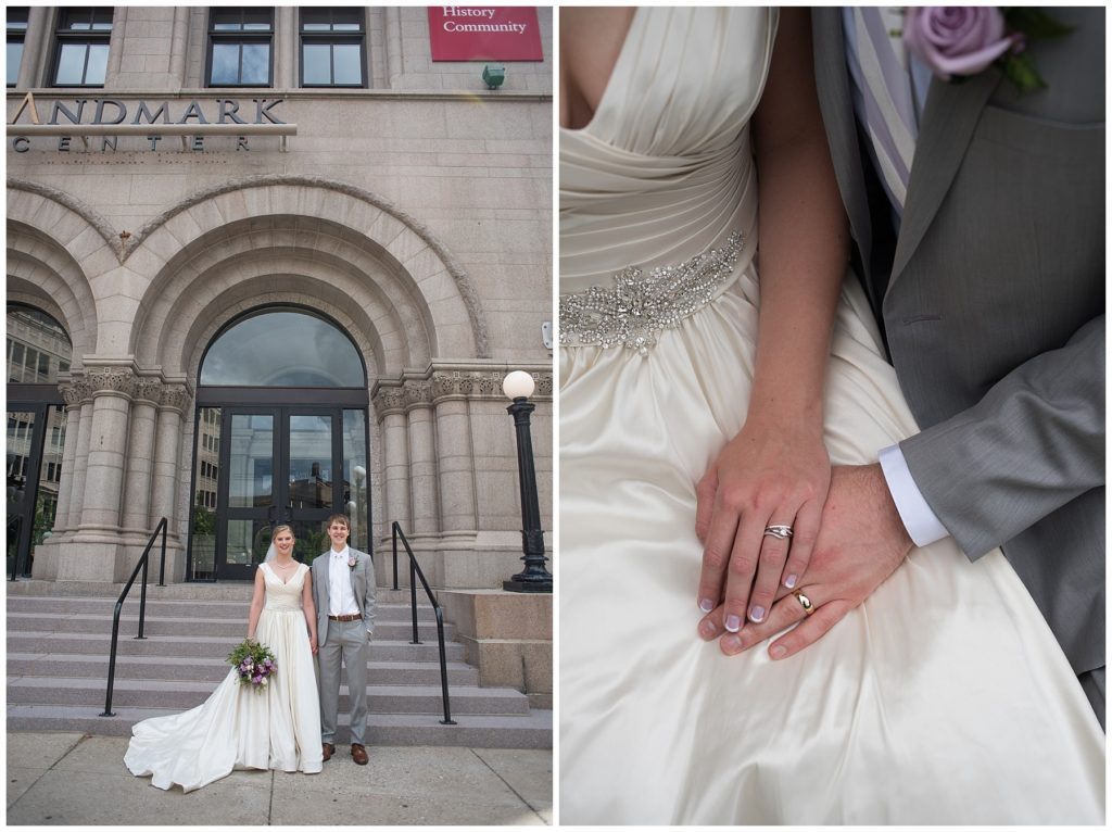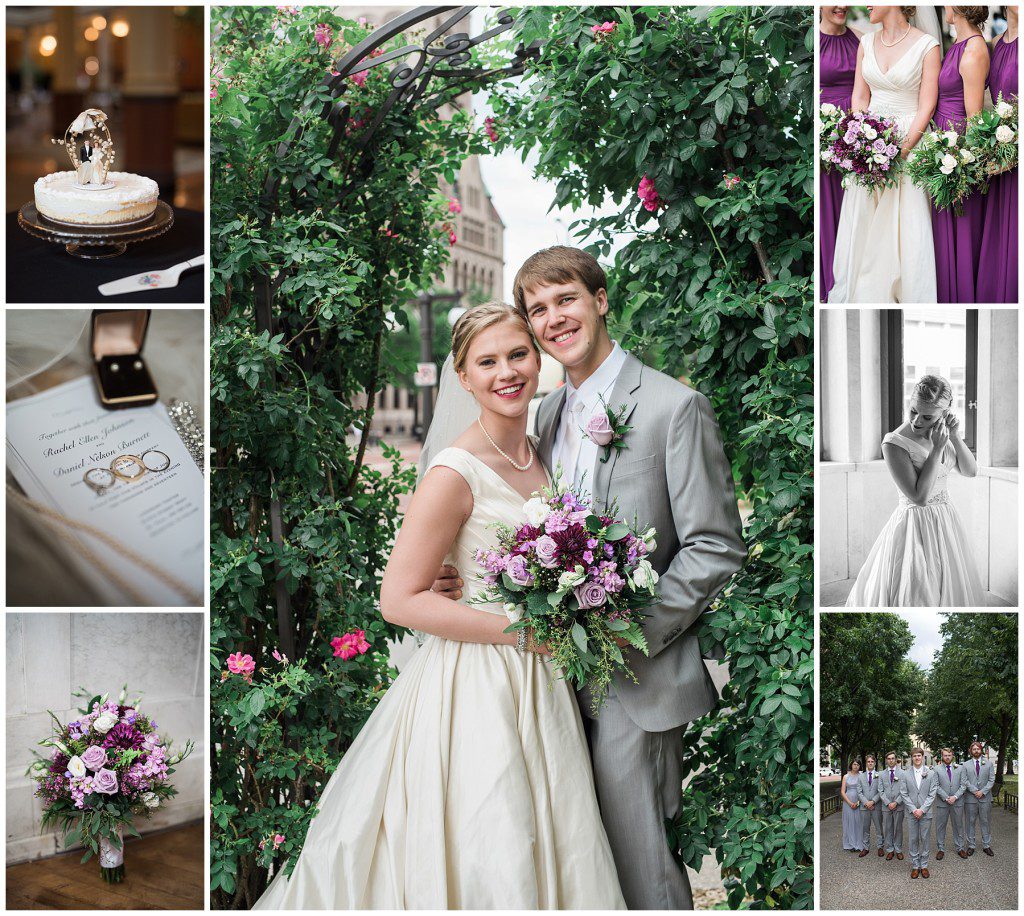 Their wedding day was just as beautiful. Surrounded by family and friends from all over the world, the two were wed in the historic Landmark Center of St. Paul. Their summer evening wedding could not have been more comfortable as the couple walked around the streets of Rice Park and along the river for photos. Rachel’s elegant satan Allure dress was stunning against Dan’s Josph Abbound grey suit. The violet and green bouquets from Florals by Claire added a stunning pop of color against the purple bridesmaid dresses from the Wedding Shoppe. Rachel and Dan both added heirloom pieces of jewelry to their day. Pearl earrings that Rachel’s mother on her wedding day, her necklace was her paternal grandmother’s and her bracelet was her maternal grandmother’s and a tie Clip that Dan’s grandfather passed on to him. Their ceremony was inside the Landmark Center and guests were invited to share in the festivities of dinner provided by BRIE catering and dancing DJ’d by Fulton Productions.