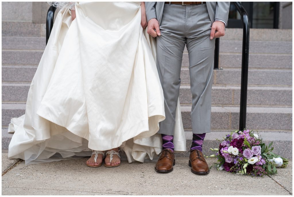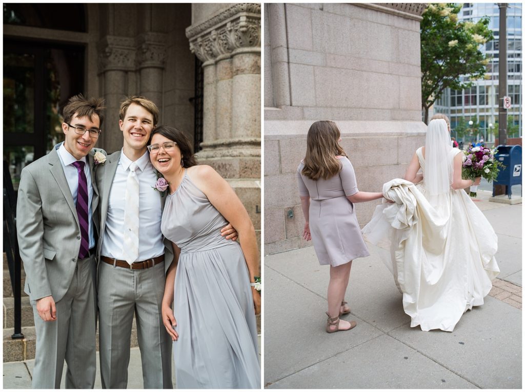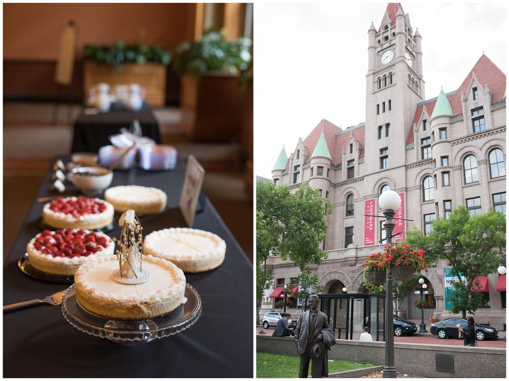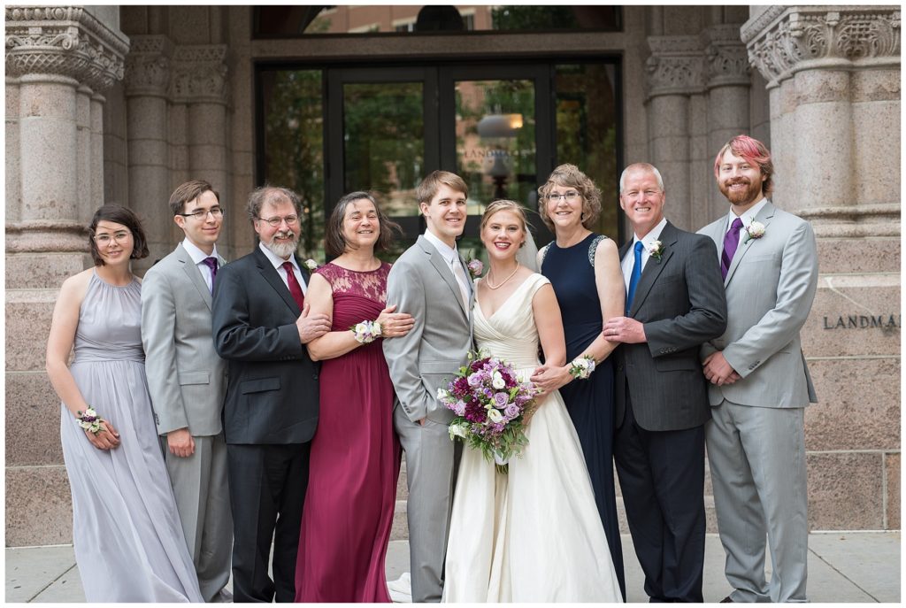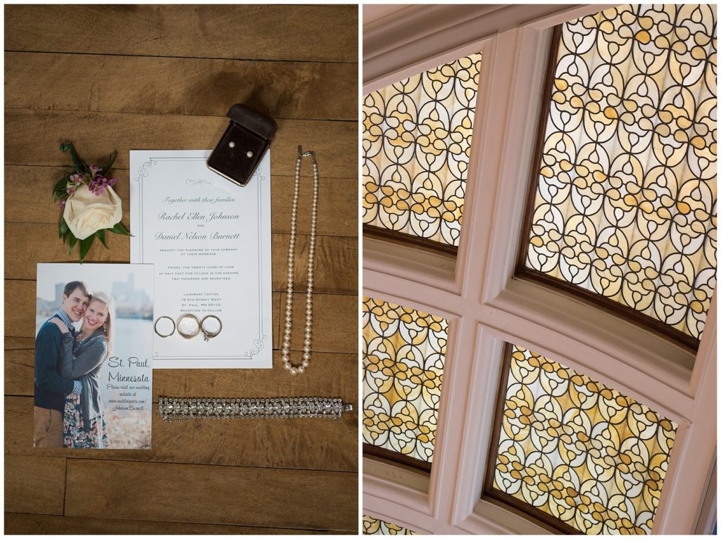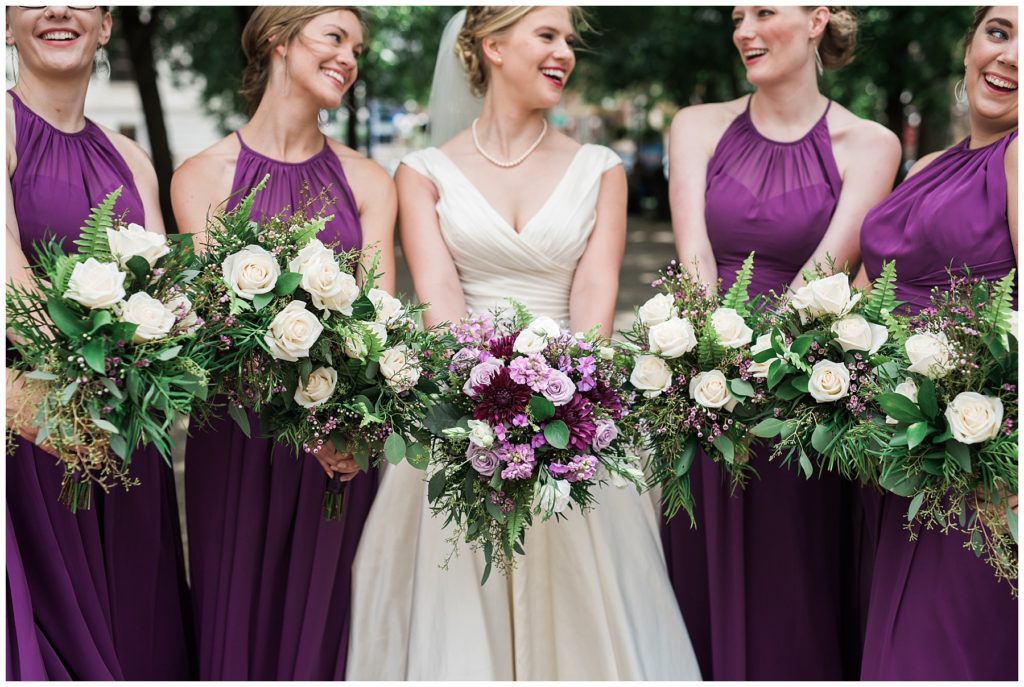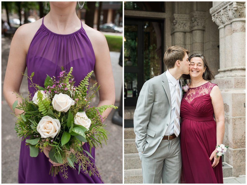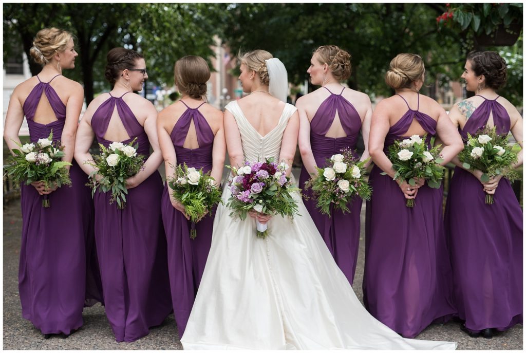 Their wedding day was just as beautiful. Surrounded by family and friends from all over the world, the two were wed in the historic Landmark Center of St. Paul. Their summer evening wedding could not have been more comfortable as the couple walked around the streets of Rice Park and along the river for photos. Rachel’s elegant satan Allure dress was stunning against Dan’s Josph Abbound grey suit. The violet and green bouquets from Florals by Claire added a stunning pop of color against the purple bridesmaid dresses from the Wedding Shoppe. Rachel and Dan both added heirloom pieces of jewelry to their day. Pearl earrings that Rachel’s mother on her wedding day, her necklace was her paternal grandmother’s and her bracelet was her maternal grandmother’s and a tie Clip that Dan’s grandfather passed on to him. Their ceremony was inside the Landmark Center and guests were invited to share in the festivities of dinner provided by BRIE catering and dancing DJ’d by Fulton Productions.