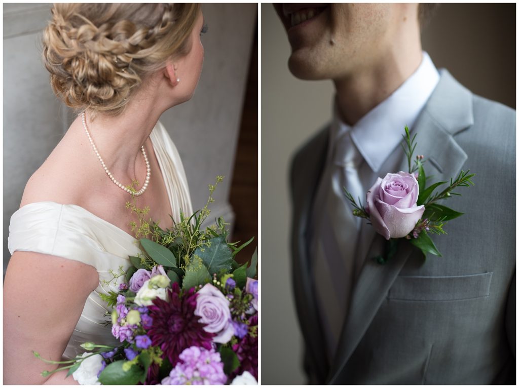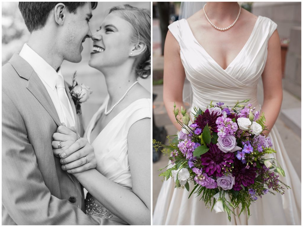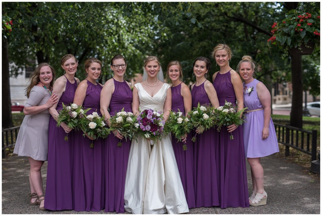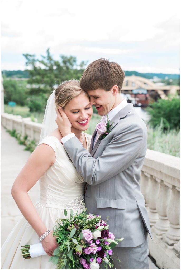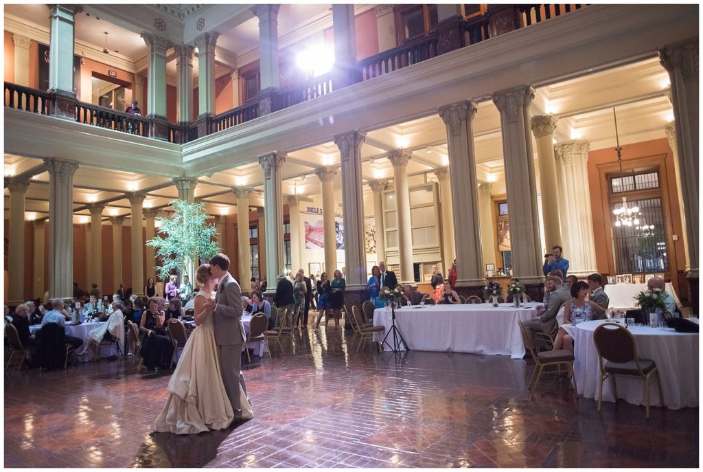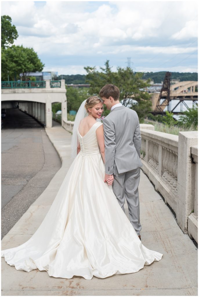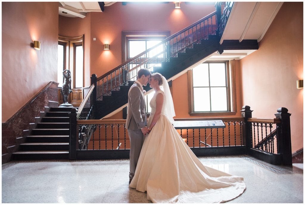 Their wedding day was just as beautiful. Surrounded by family and friends from all over the world, the two were wed in the historic Landmark Center of St. Paul. Their summer evening wedding could not have been more comfortable as the couple walked around the streets of Rice Park and along the river for photos. Rachel’s elegant satan Allure dress was stunning against Dan’s Josph Abbound grey suit. The violet and green bouquets from Florals by Claire added a stunning pop of color against the purple bridesmaid dresses from the Wedding Shoppe. Rachel and Dan both added heirloom pieces of jewelry to their day. Pearl earrings that Rachel’s mother on her wedding day, her necklace was her paternal grandmother’s and her bracelet was her maternal grandmother’s and a tie Clip that Dan’s grandfather passed on to him. Their ceremony was inside the Landmark Center and guests were invited to share in the festivities of dinner provided by BRIE catering and dancing DJ’d by Fulton Productions.